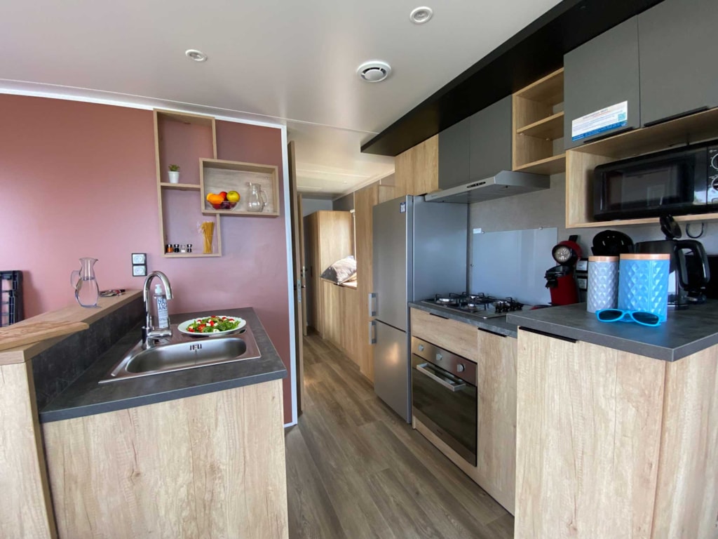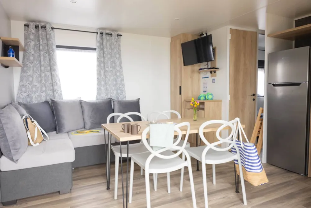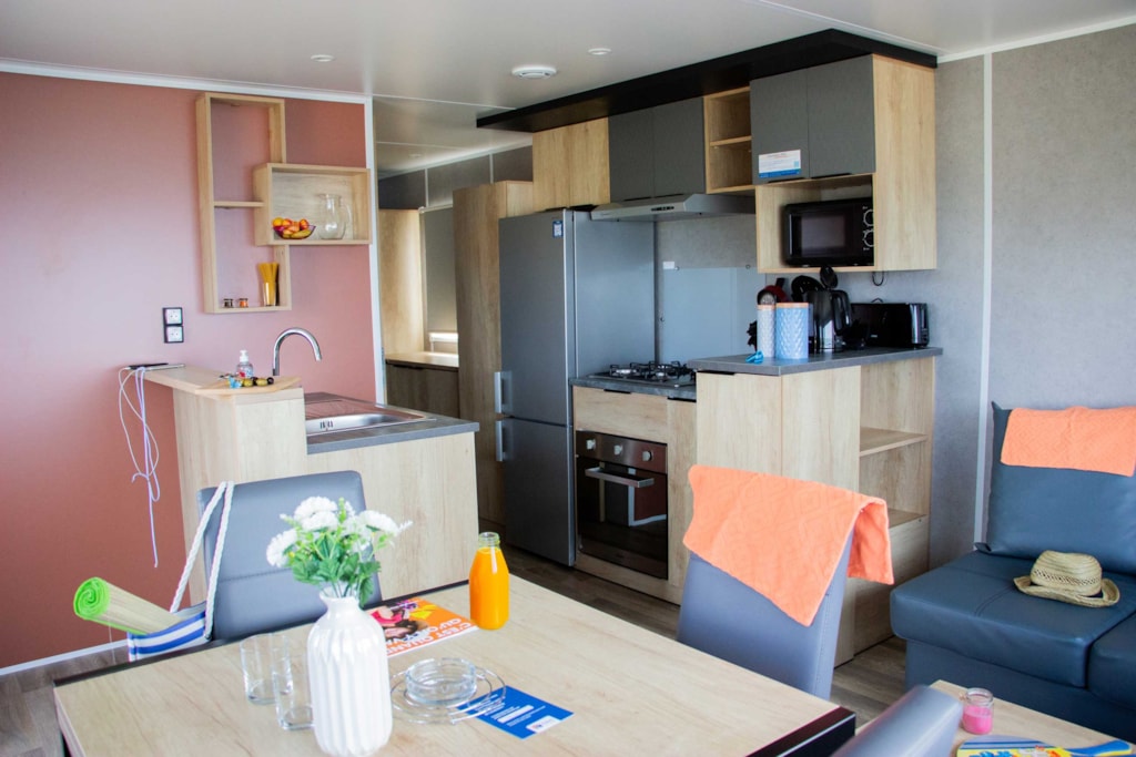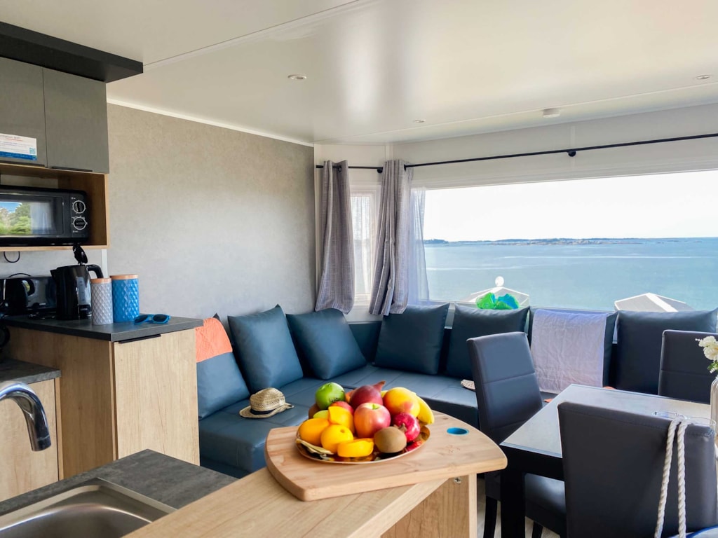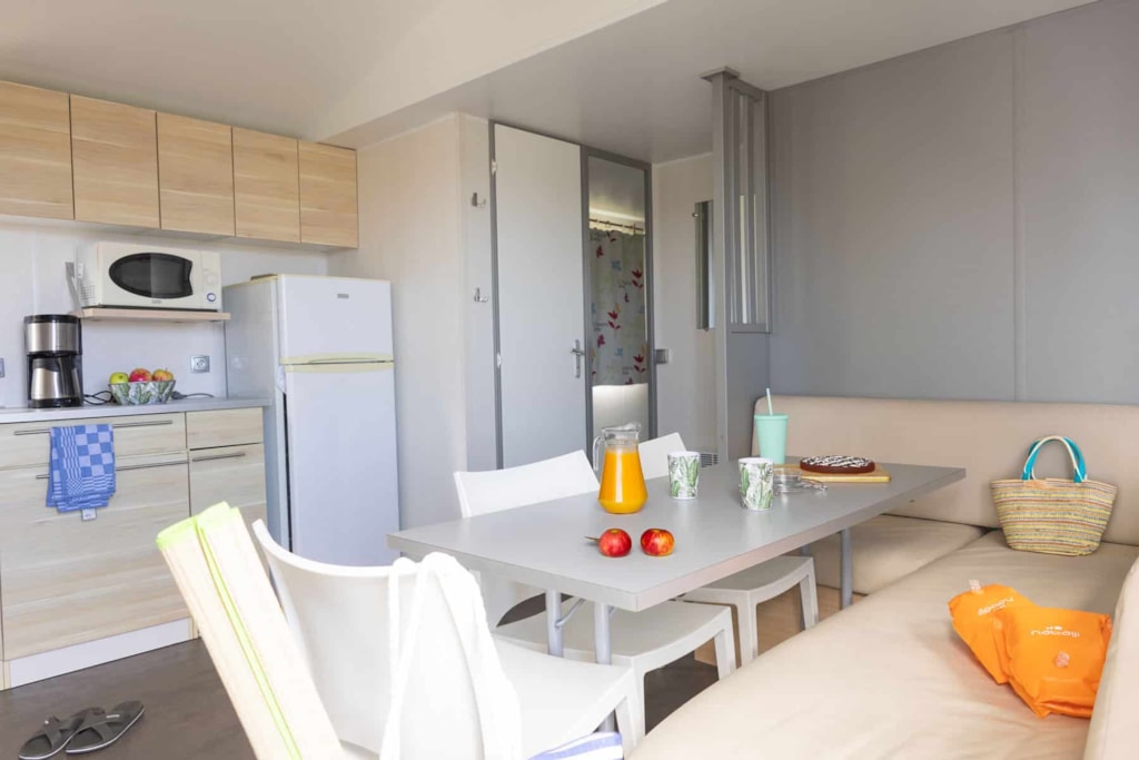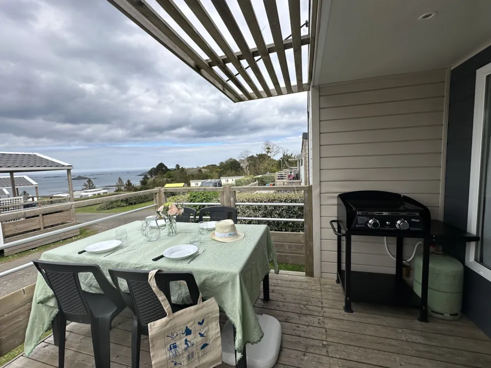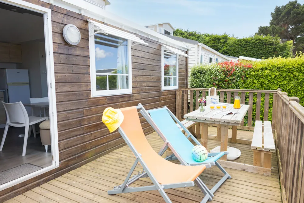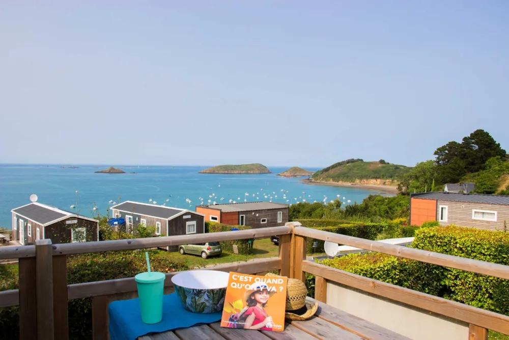 Mobilheim mit 2 Schlafzimmern Privilège für 5 Personen mit Panoramablick auf das Meer. Er ist mit einer Holzterrasse, Baumwollbettwäsche und Handtüchern, einem Gasherd, einem Fernseher und einem Geschirrspüler ausgestattet.
