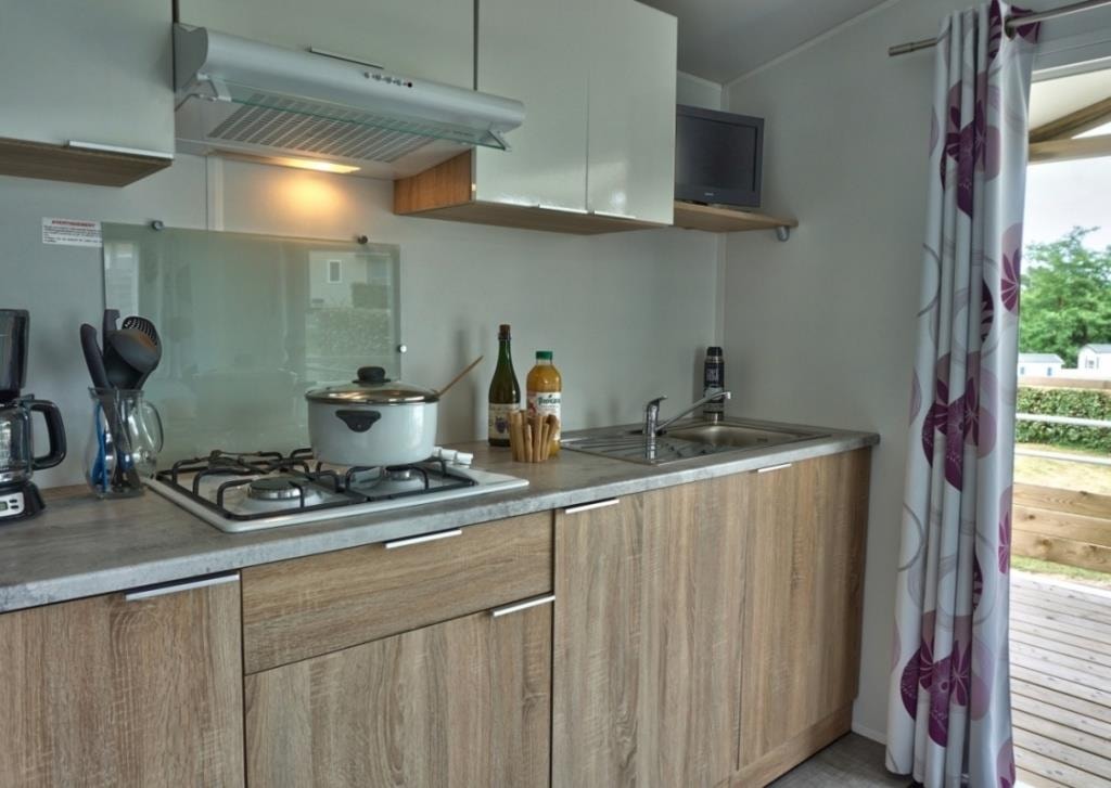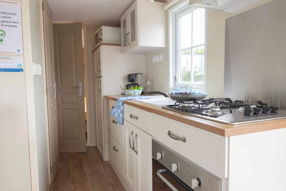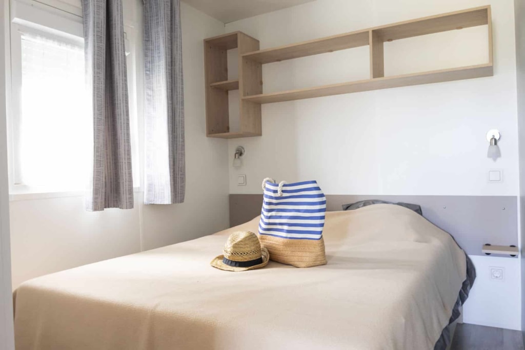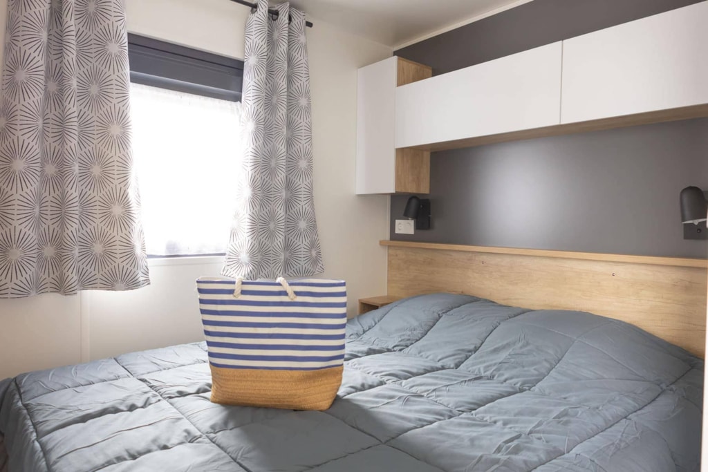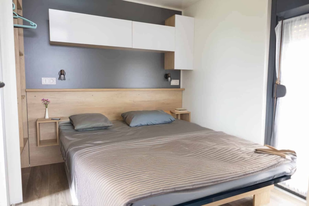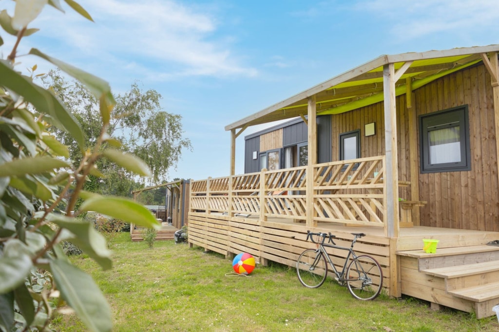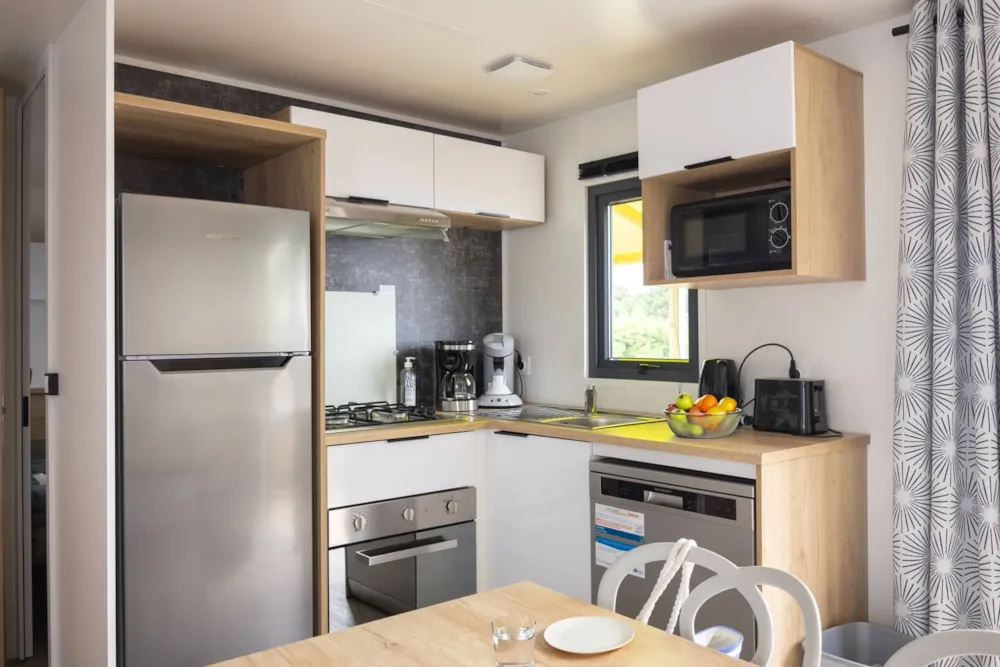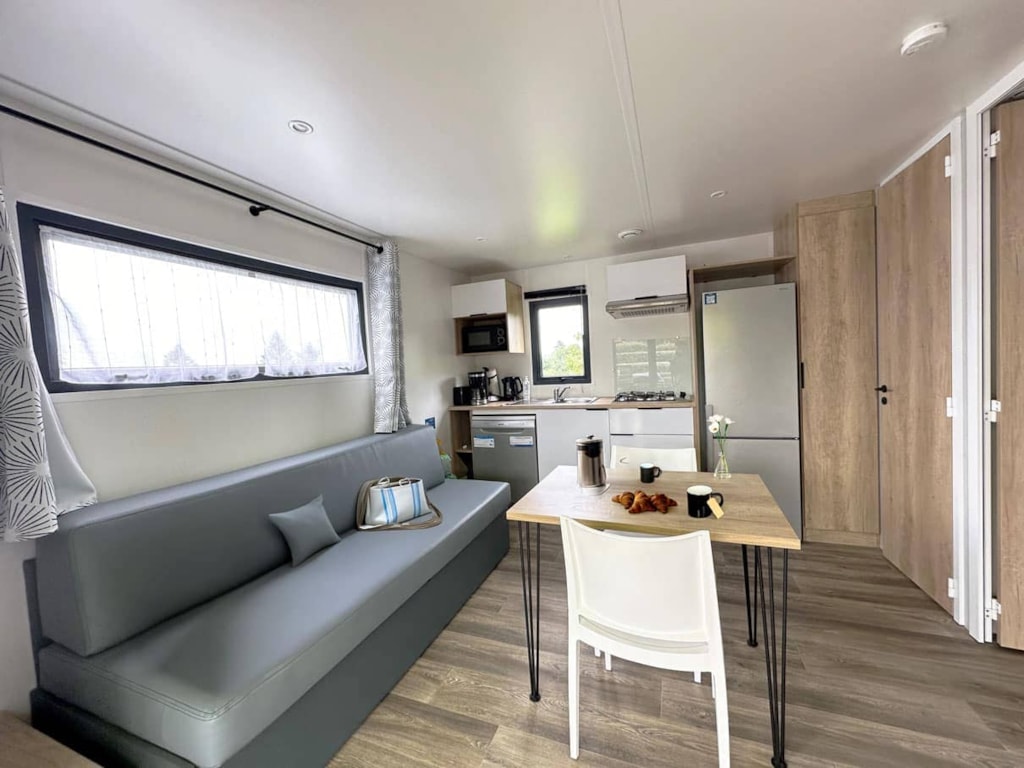 Mobilheim mit 2 Schlafzimmern Privilège für 5 Personen mit Panoramablick auf das Meer. Er ist mit einer Holzterrasse, Baumwollbettwäsche und Handtüchern, einem Gasherd, einem Fernseher und einem Geschirrspüler ausgestattet.