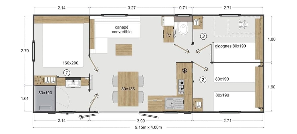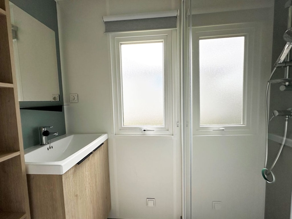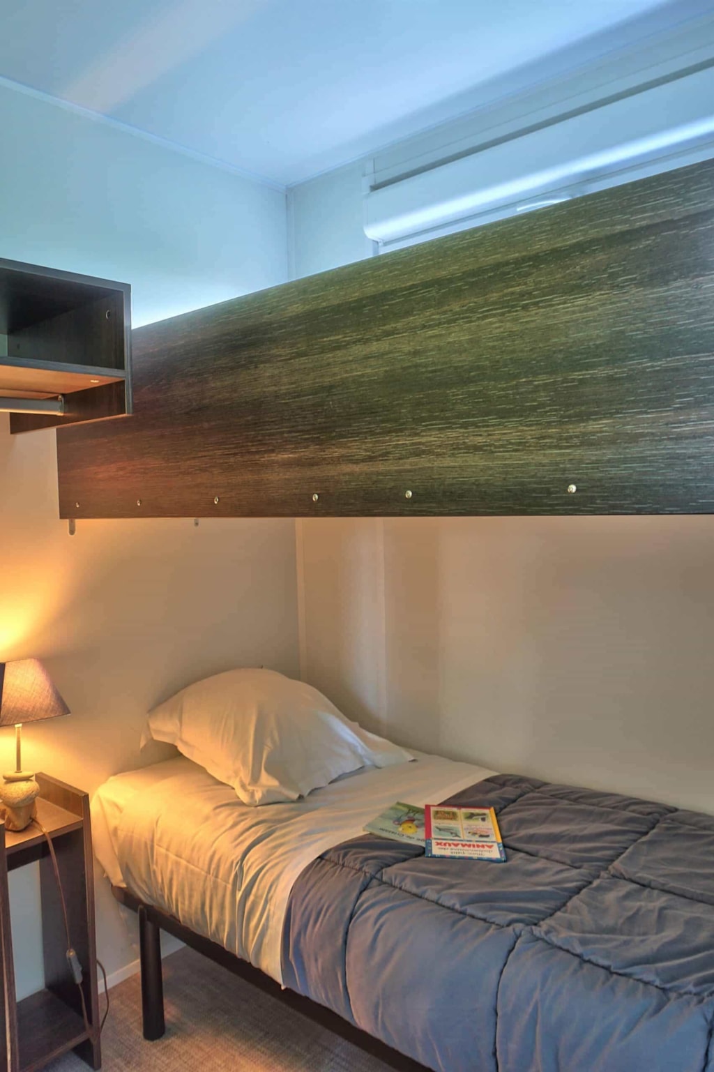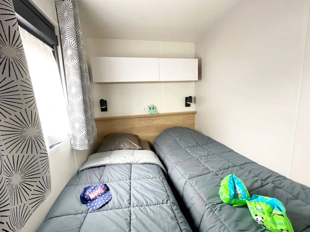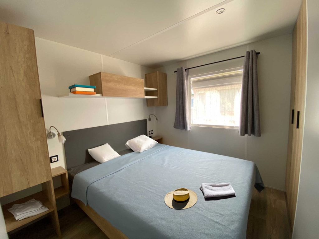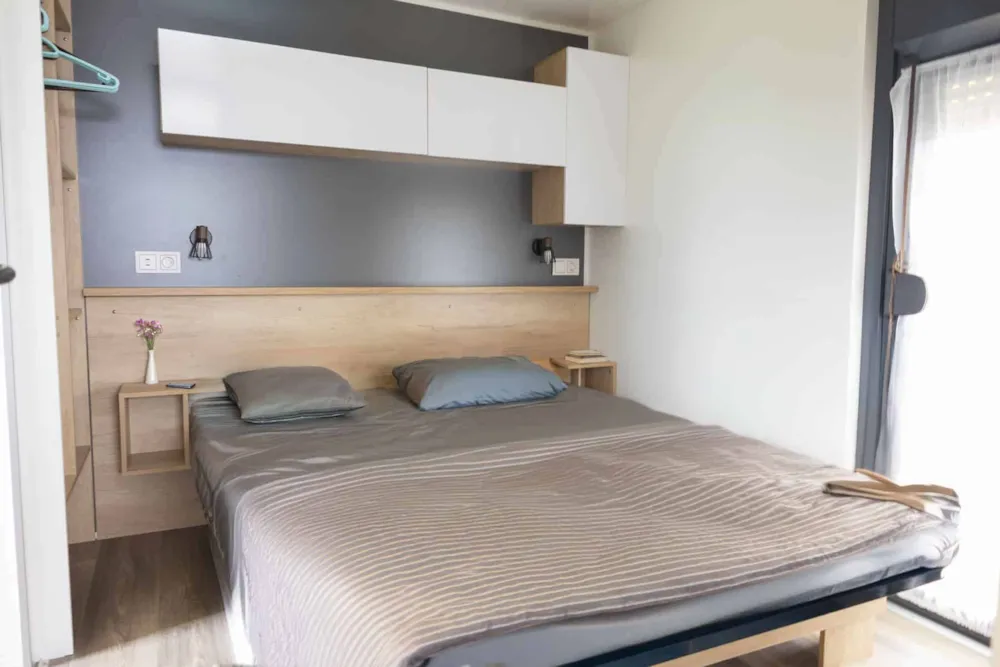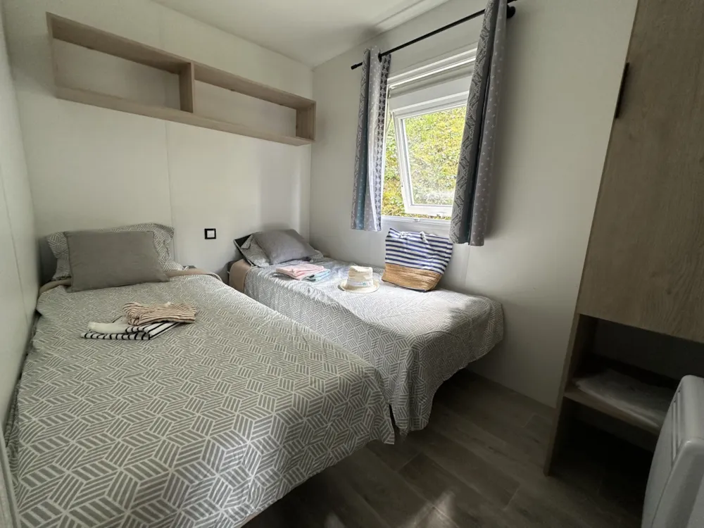 Mobilheim mit 2 Schlafzimmern Privilège für 5 Personen mit Panoramablick auf das Meer. Er ist mit einer Holzterrasse, Baumwollbettwäsche und Handtüchern, einem Gasherd, einem Fernseher und einem Geschirrspüler ausgestattet.