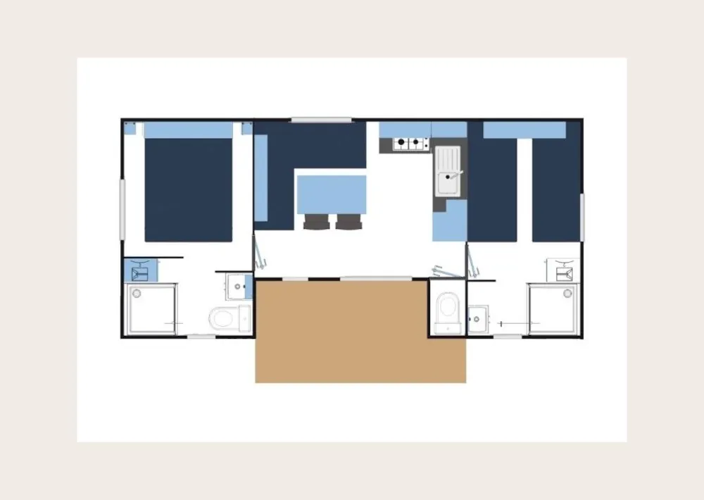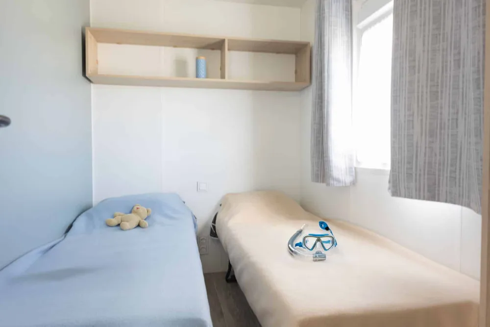 Mobilheim mit 2 Schlafzimmern Privilège für 5 Personen mit Panoramablick auf das Meer.Das Mobilheim verfügt über eine Podest-Holzterrasse, auf der Sie das herrliche Panorama genießen können, das sich Ihnen bietet. Das Mobilheim ist mit einem Fernseher, einem Geschirrspüler, einem Wasserkocher, einem Toaster, einer Gasplancha sowie 2 Liegestühlen ausgestattet. Baumwollbettwäsche und Handtücher sind in Ihrem Mobilheim inbegriffen.