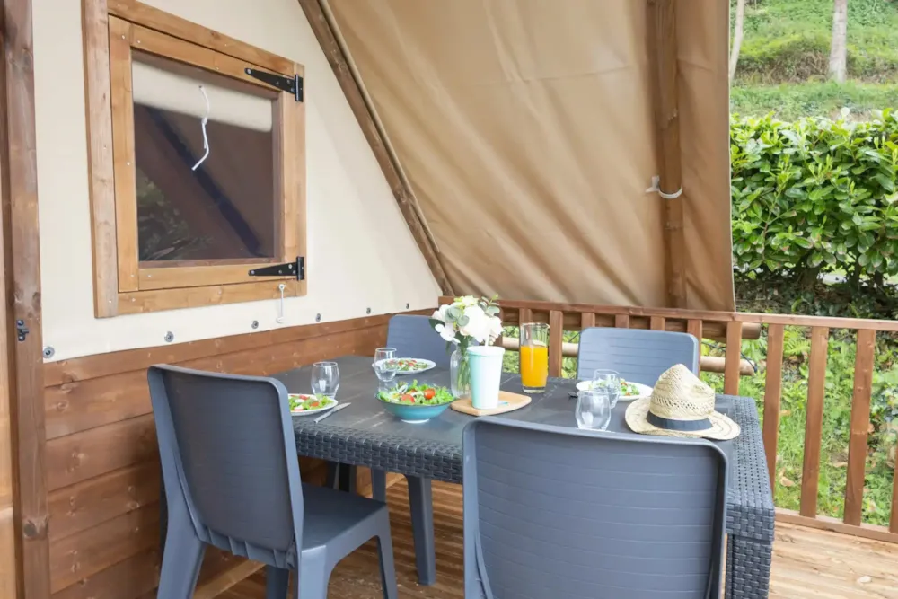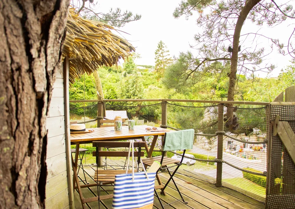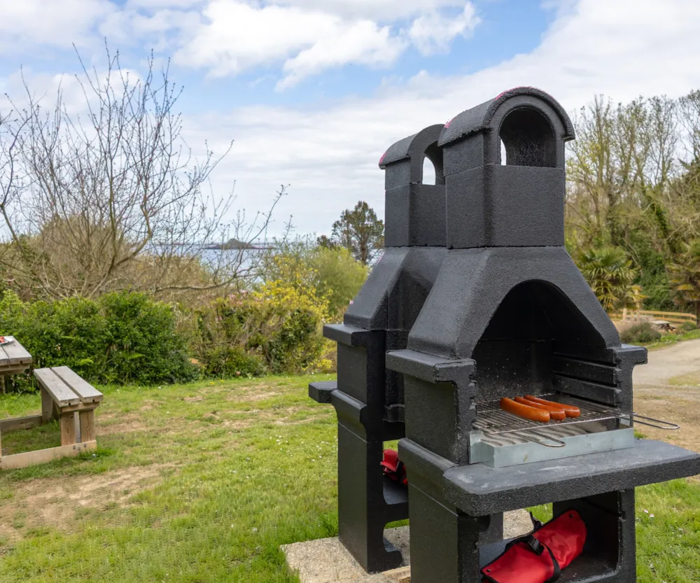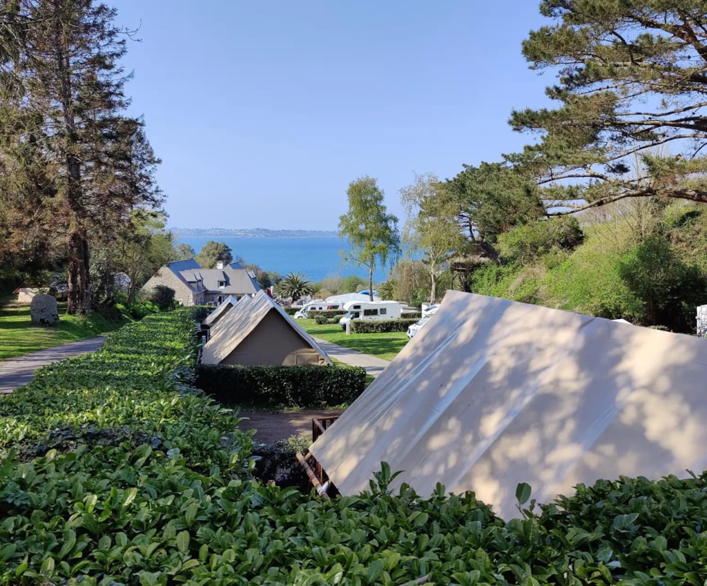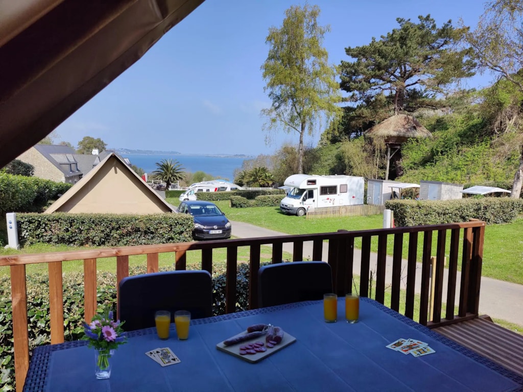 Überblick -Stellplatz Confort, der Ihnen einen Panoramablick auf das Meer bietet. Genießen Sie eine Hütte mit Ausstattung: Mikrowelle, Holzkohlegrill, Liegestühle, Kühlschrank, überdachter Picknicktisch und Wäscheständer.