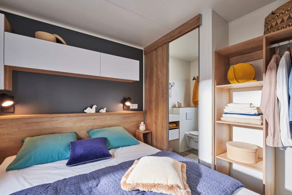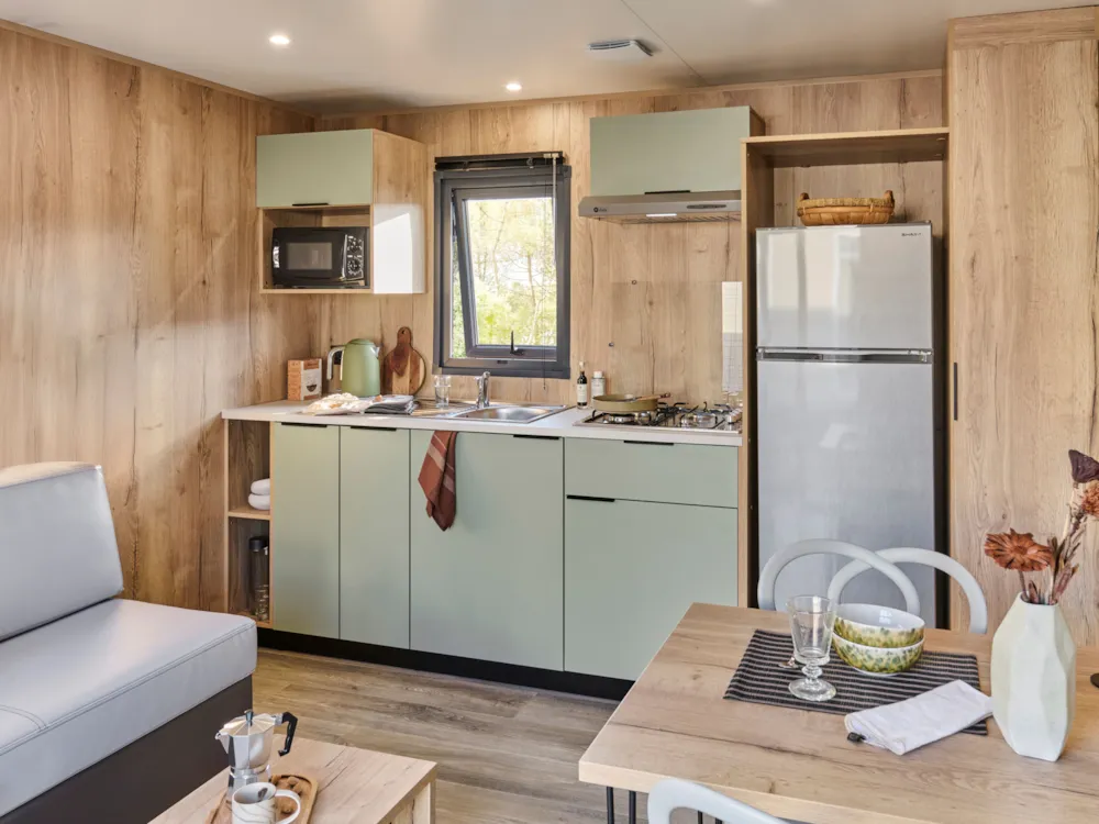 Mobilheim L'ACACIA (2 Zimmer)letzte Generation (2023) -integrierte Terrasse - TV - großer Kühlschrank, der in einem landschaftlich gestalteten und ruhigen Bereich integriert ist.