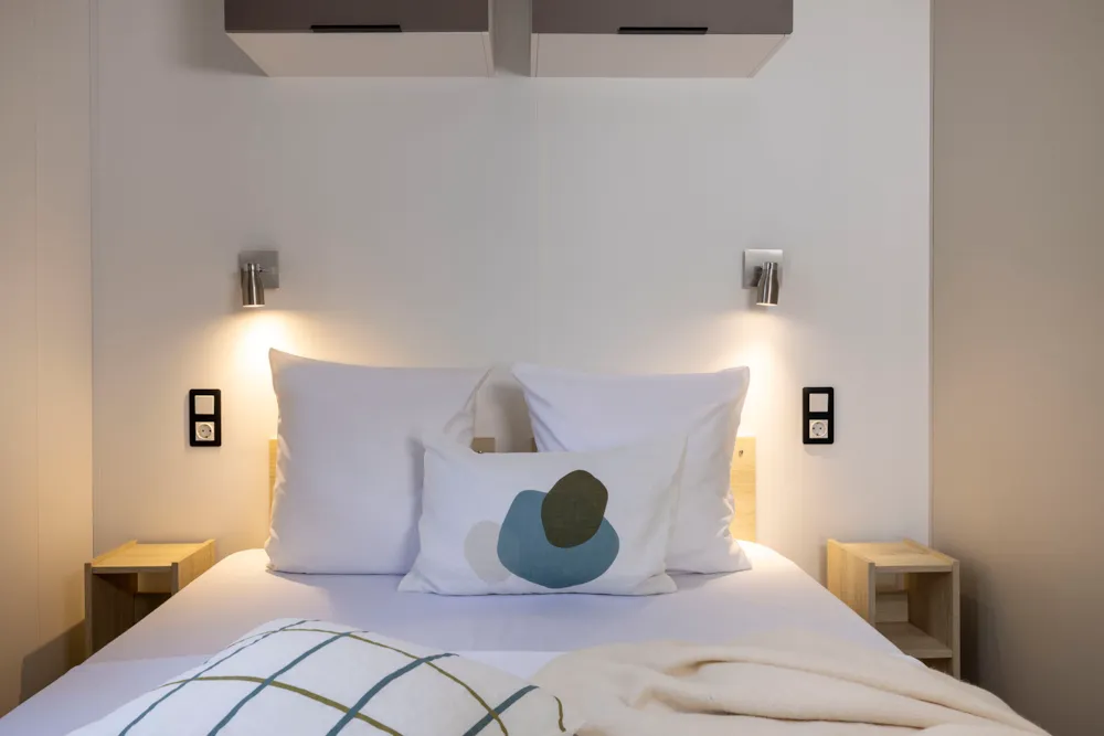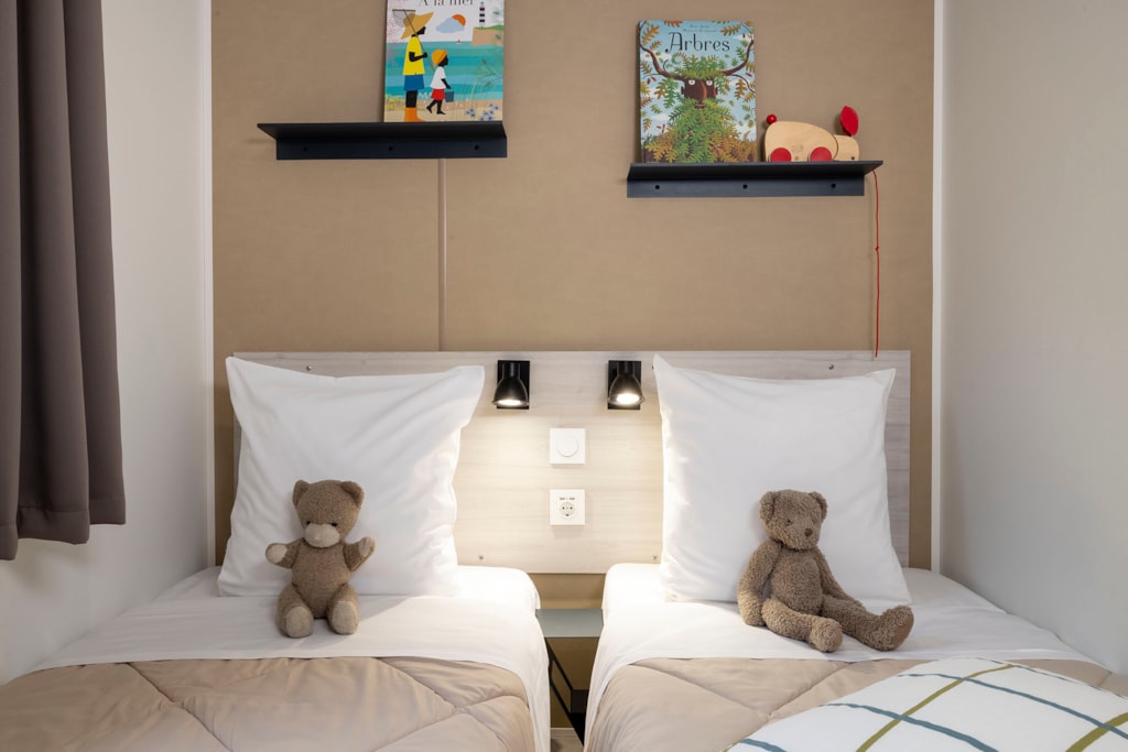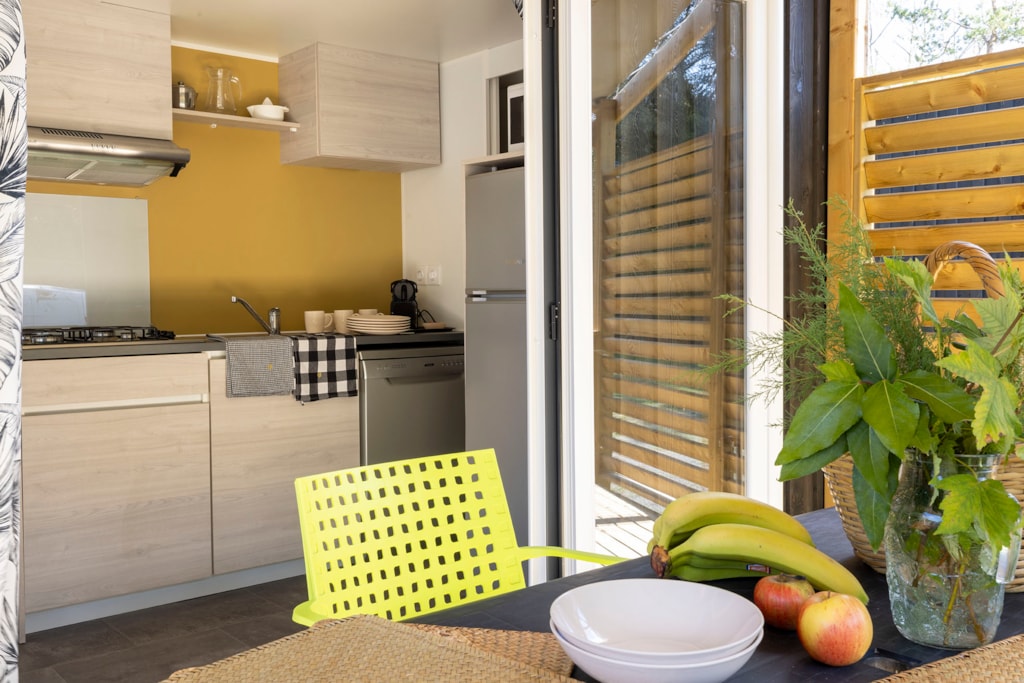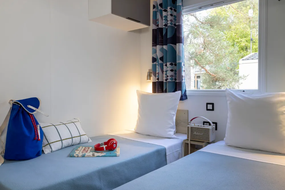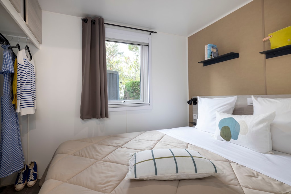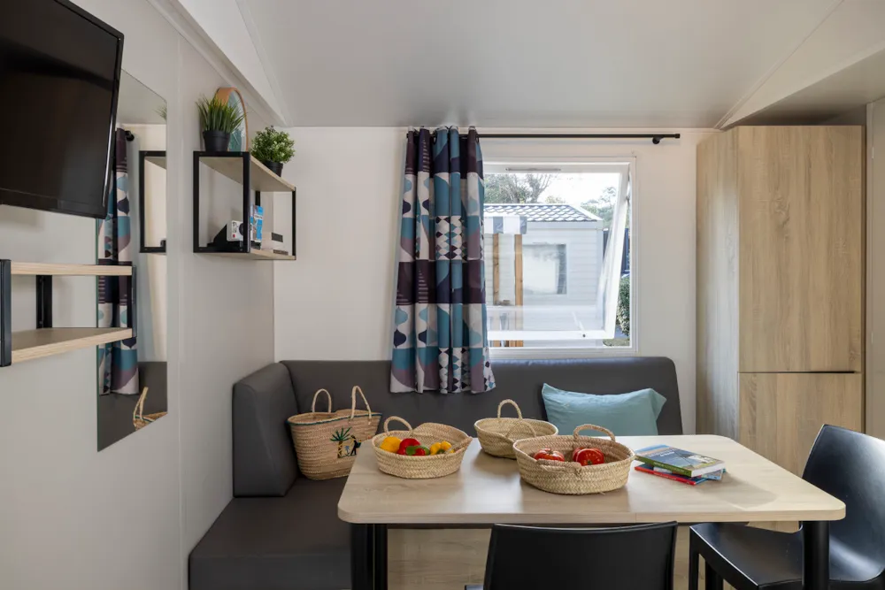Discover our premium 29m² mobile home with top-of-the-range facilities for 4 people. Pedestrian and/or semi-pedestrian area. Blackout blinds, mosquito nets, 2 bedrooms (2 single beds 90 x 190 cm, 1 double bed 160 x 200 cm), bed linen/towels included for the stay without renewal or renewable but generating a supplement, modern interior, living room with TV, dishwasher, large semi-covered private terrace.