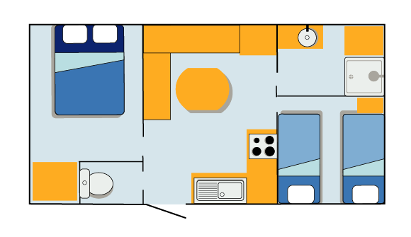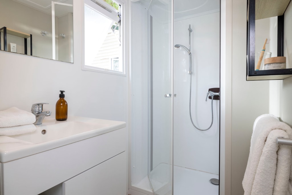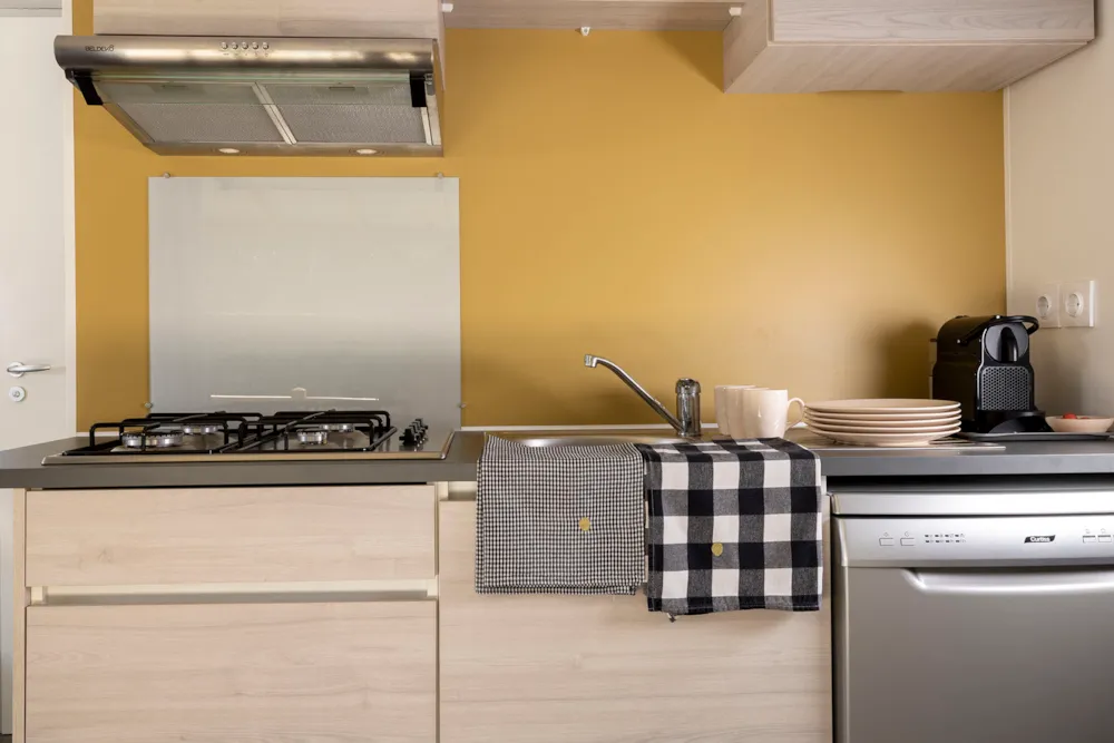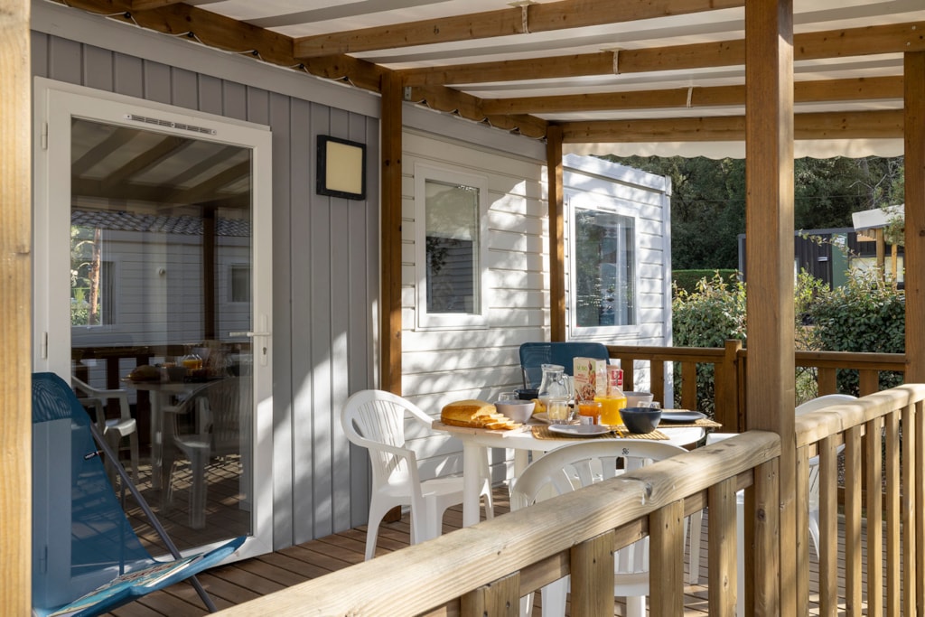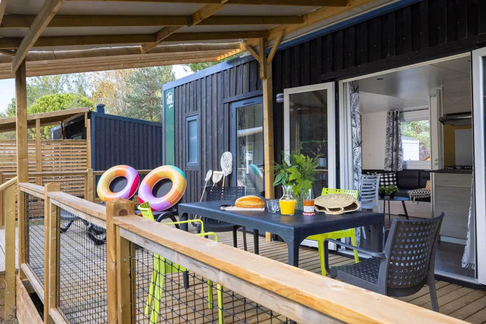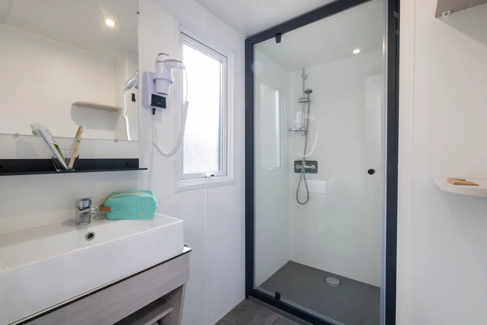 Discover our premium 29m² mobile home with top-of-the-range facilities for 4 people. Pedestrian and/or semi-pedestrian area. Blackout blinds, mosquito nets, 2 bedrooms (2 single beds 90 x 190 cm, 1 double bed 160 x 200 cm), bed linen/towels included for the stay without renewal or renewable but generating a supplement, modern interior, living room with TV, dishwasher, large semi-covered private terrace.