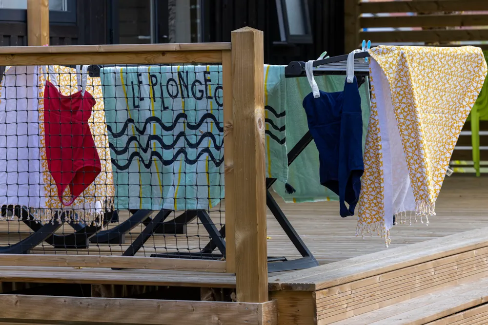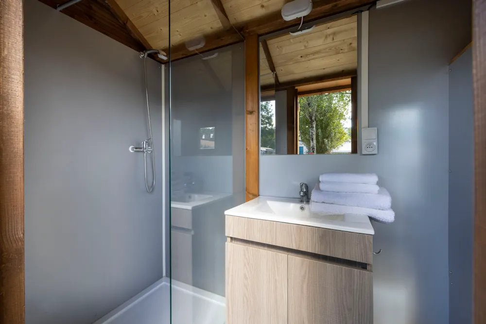 Discover our fully-equipped 2 bedrooms Cabane Cotton Confort (2 single beds 80 x 190 cm, 1 bed 160 x 190 cm) of 32 m² for 4 people with bathroom, for an unforgettable stay close to nature. You'll fall under the spell of its cosy, trendy decor, its large living room and its openness to the surroundings of the Cabanes Cotton area, with its large 11m2 covered panoramic terrace.