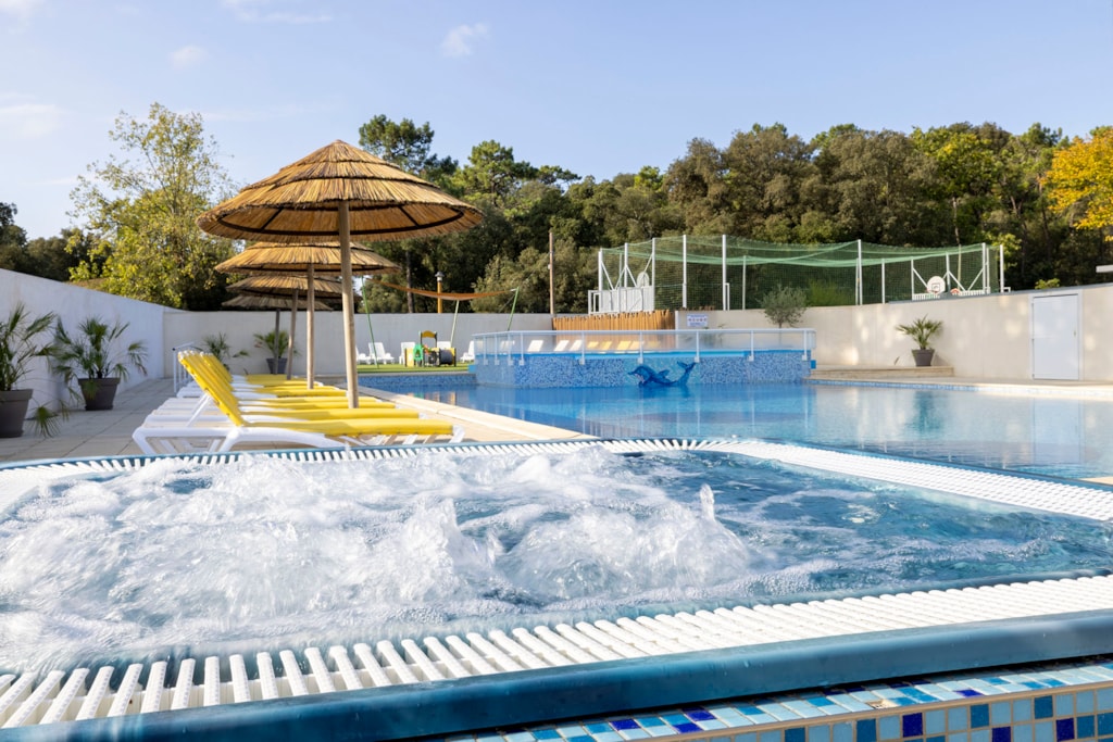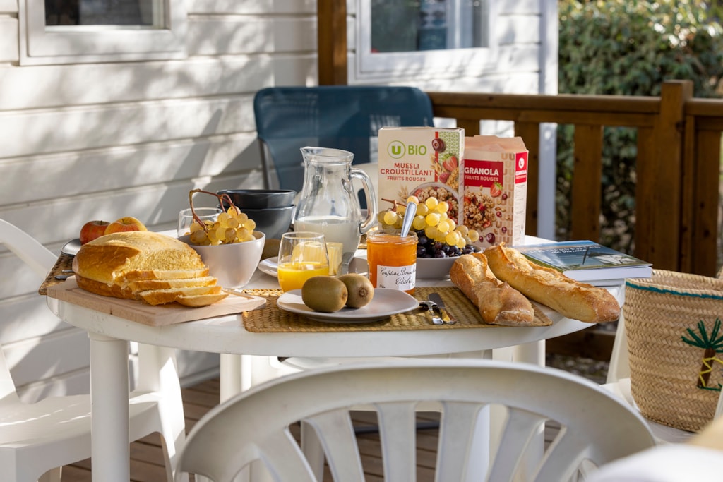 Discover our premium 29m² mobile home with top-of-the-range facilities for 4 people. 2 spacious bedrooms with blackout blinds and mosquito nets (2 single beds 90 x 190 cm, 1 double bed 160 x 200 cm), bed linen/towels included for the stay without renewal or renewable but generating a supplement. Enjoy a modern interior with dishwasher, lounge with TV. Its large private semi-covered terrace is ideal for meals with family and/or friends.