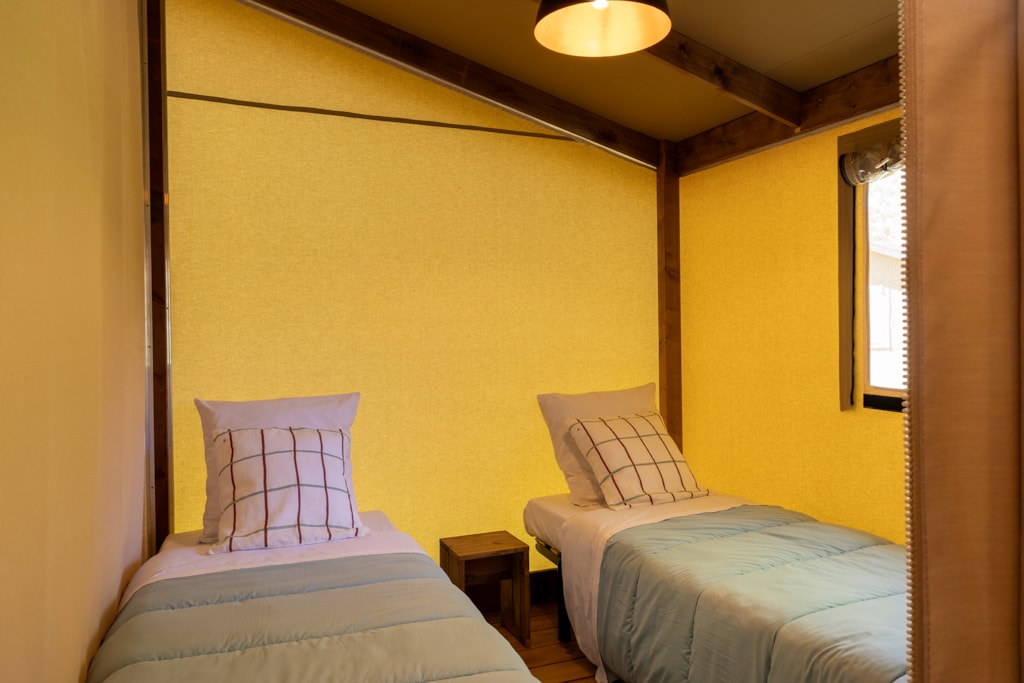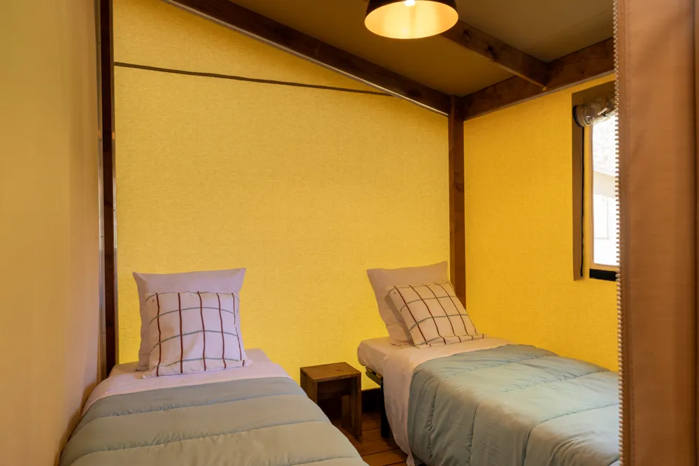 Wooden cabin of 8m2: a bedroom with 2 beds of 80x190cm, 2 windows with blinds, a storage space above the bed, a mini-bar of 38 liters and a private terrace.