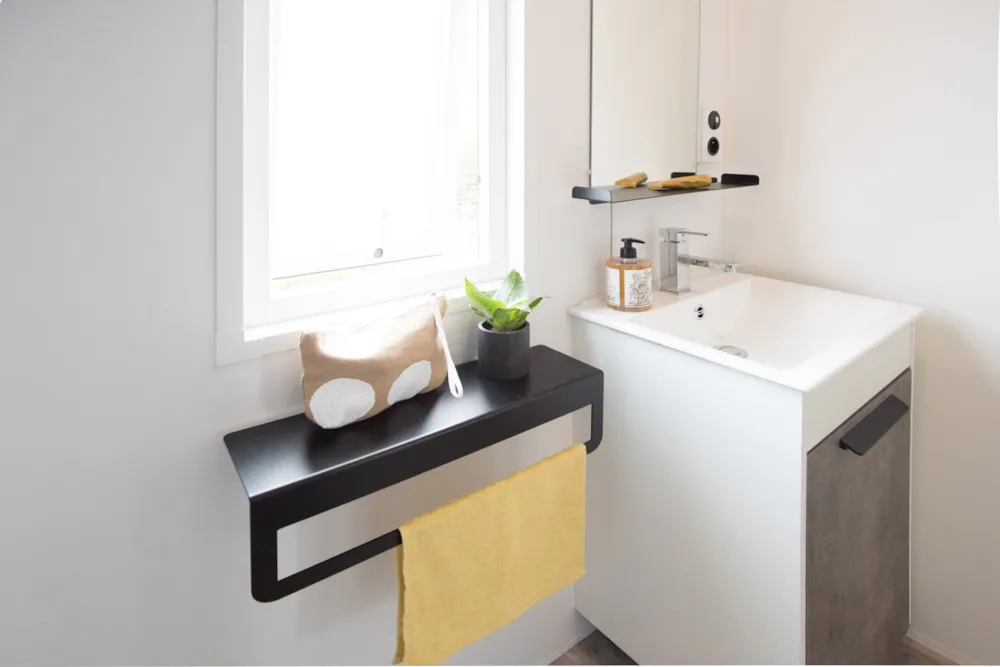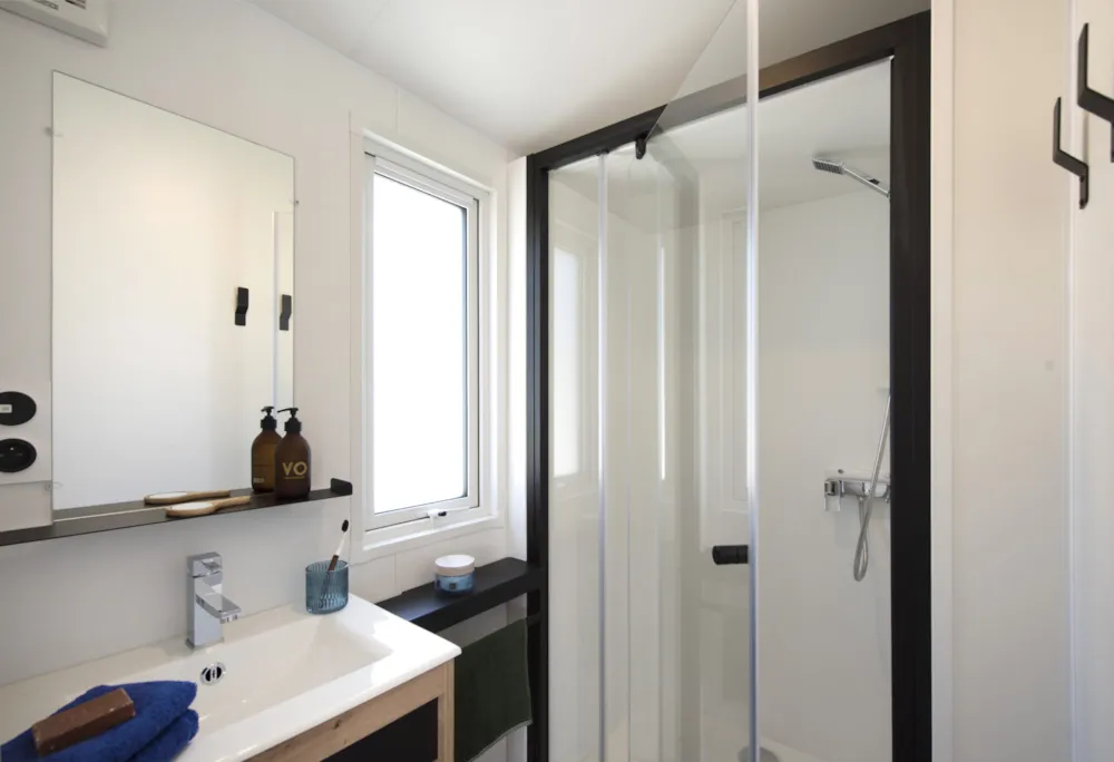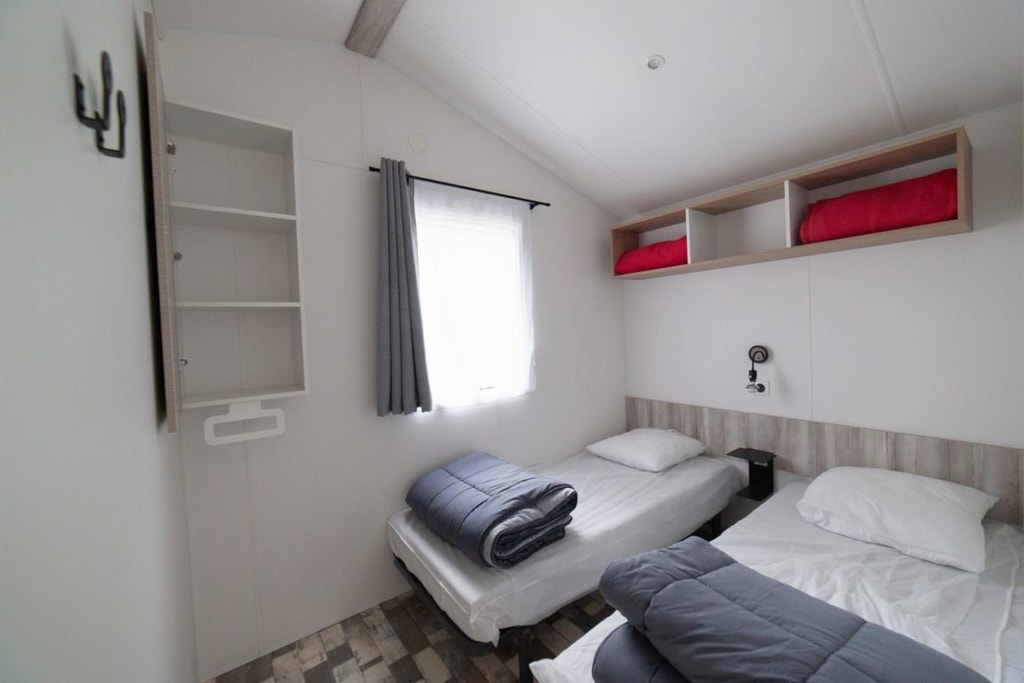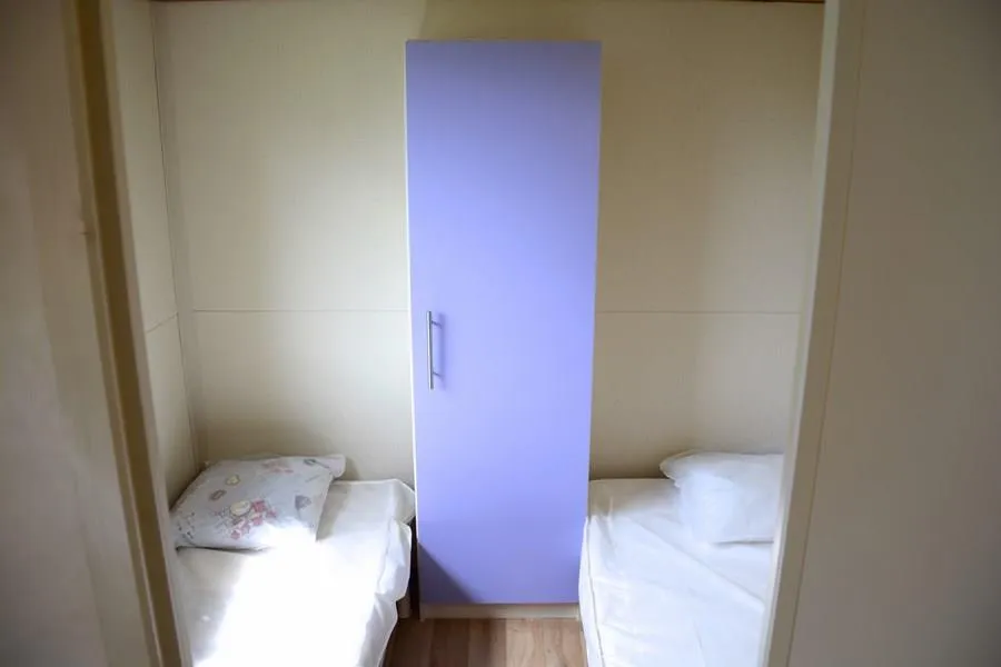 3 bedroom mobile-home - 6 people max - (40 m2 including one terrace)- This comfortable mobile-home is equipped with 1 bedroom including 1 double bed, 2 bedrooms including 2 single beds next to each other in each bedroom, 1 bathroom with shower, washbasin and toilets, kitchen, living room and terrace. You can park your car next to the mobile-home.