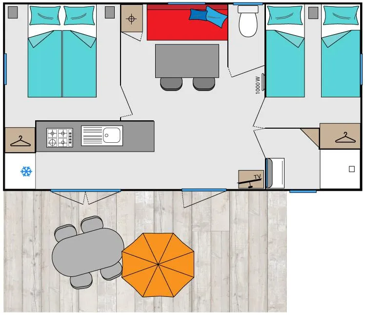 3 Schlafzimmer mit Kleiderschrank (1 mit einem Bett von 160 x 200 cm und 2 mit 2 Betten von 80 x 190 cm), Einzeldecken und Kissen sind vorhanden. Bettwäsche müssen Sie selbst mitbringen, Sie können jedoch auch wählen, diese bei uns zu mieten.