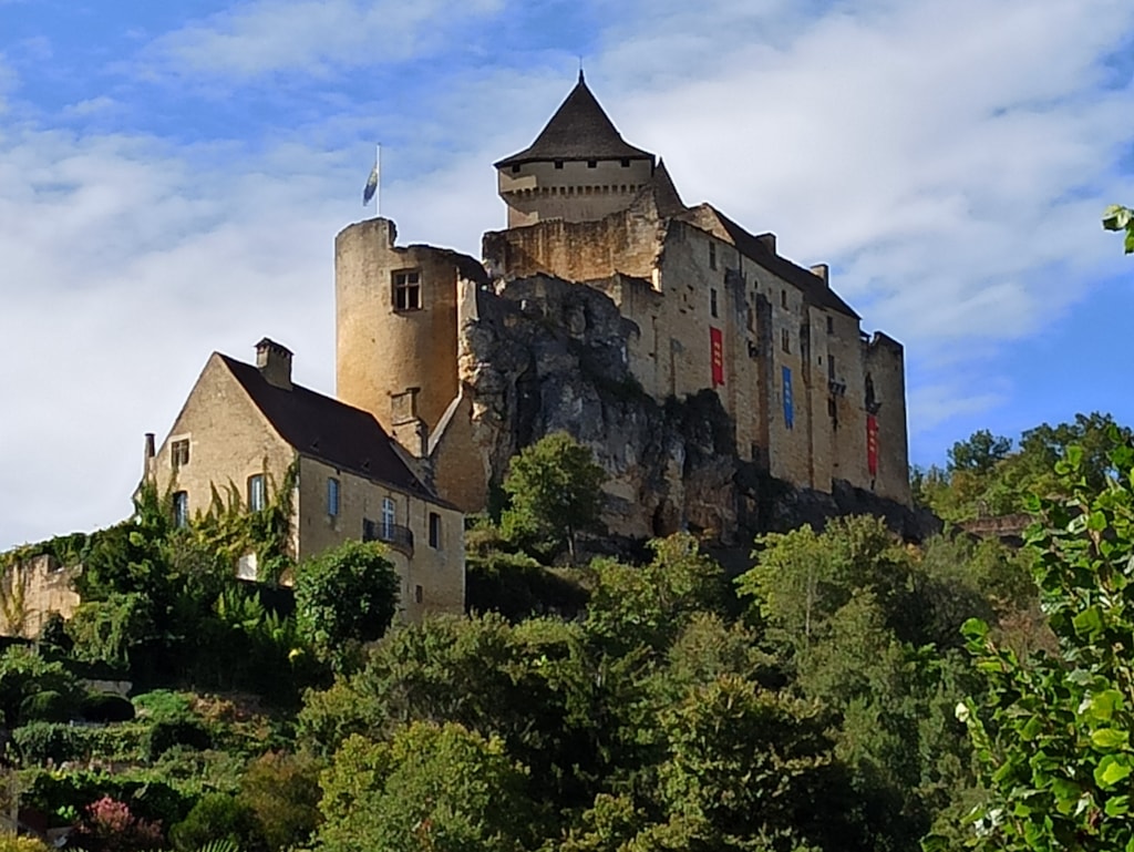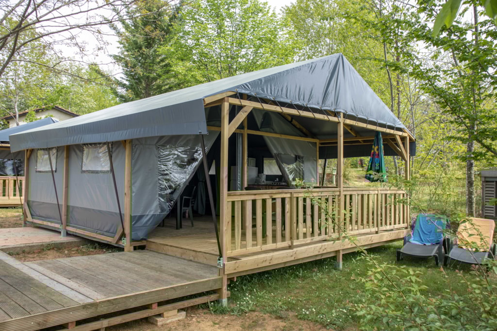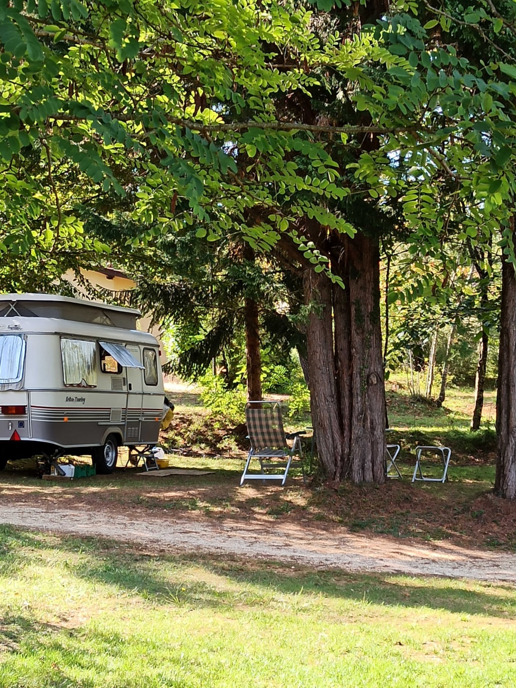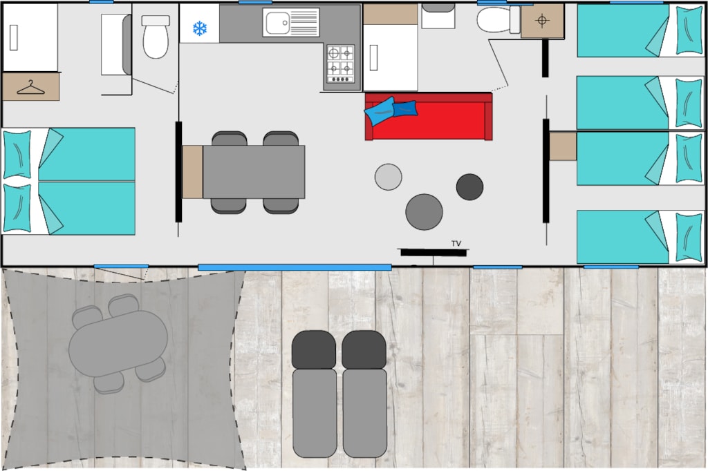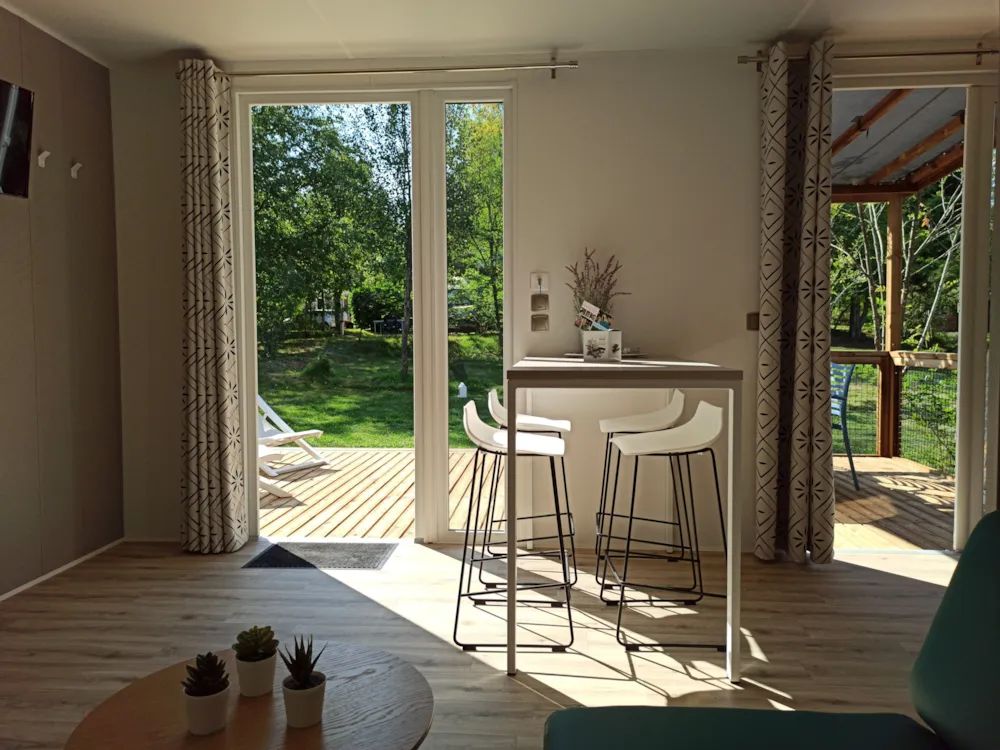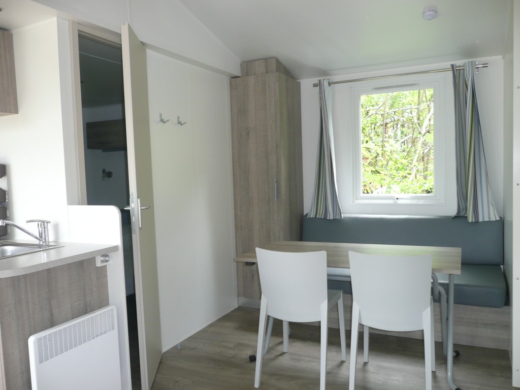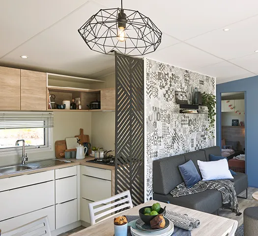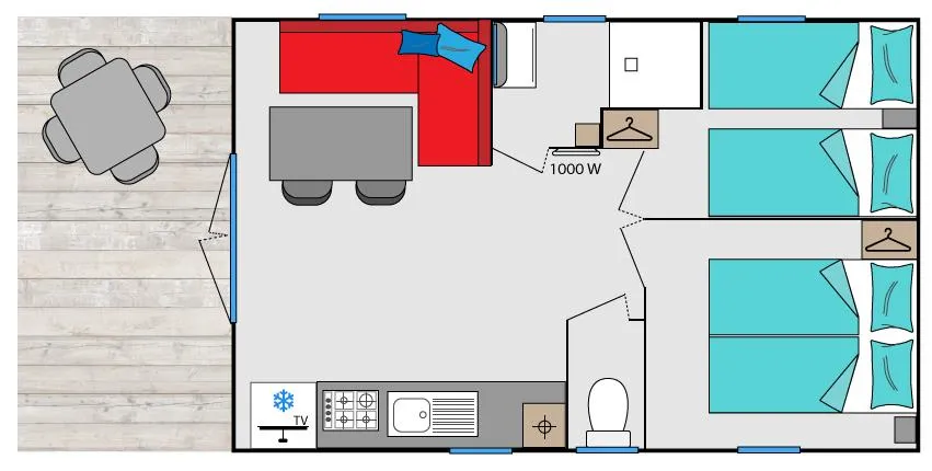 Ein Wohnzimmer mit Sitzecke, separatem Essbereich, Klimaanlage und TV mit französischen Sendern.