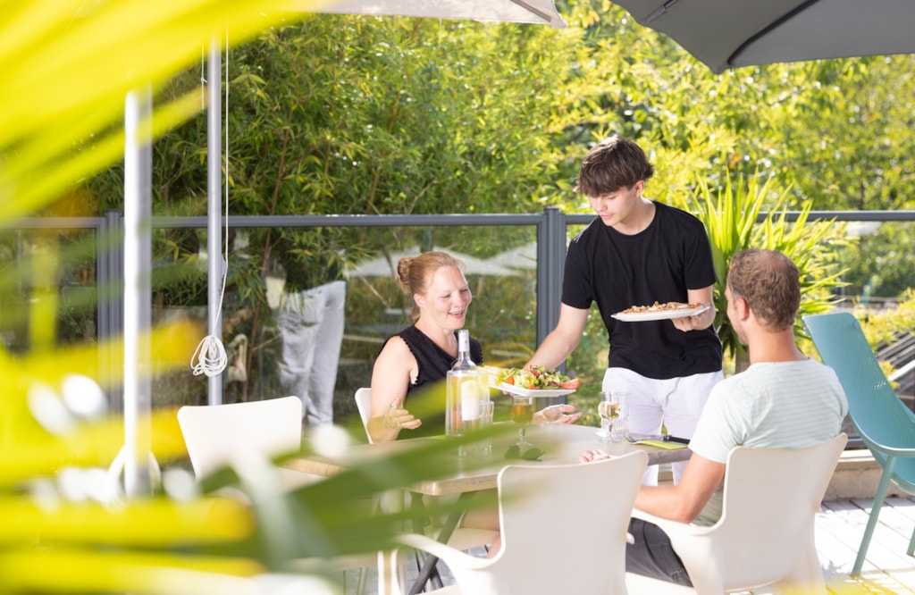 Extra große, teilweise überdachte Terrasse mit Gartenmöbeln und Liegen.