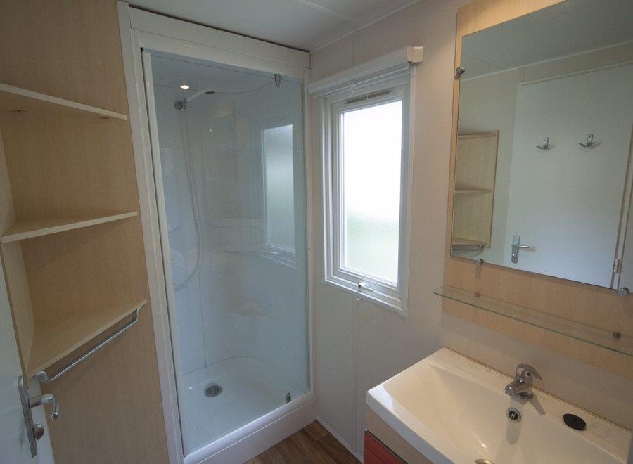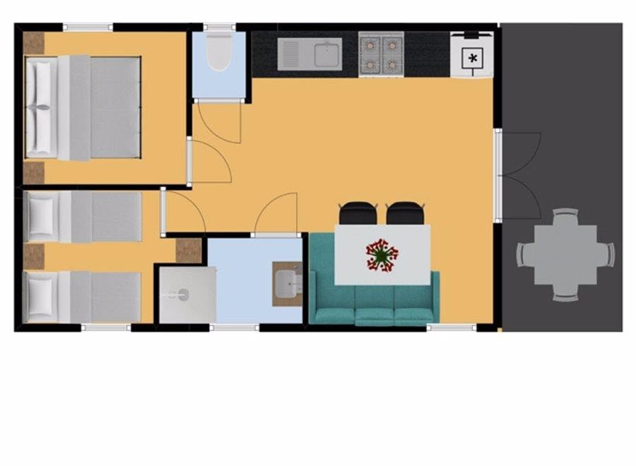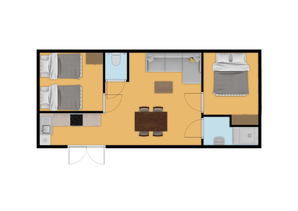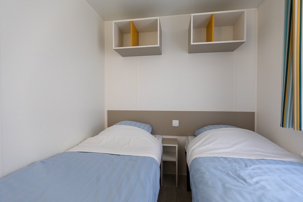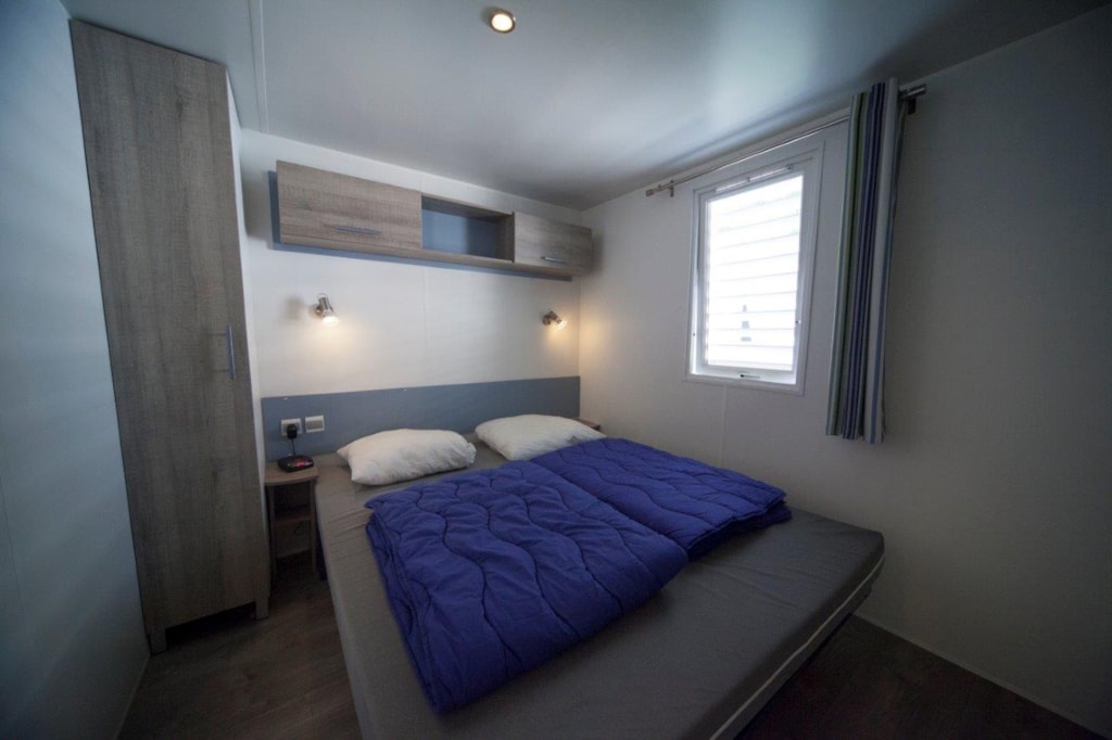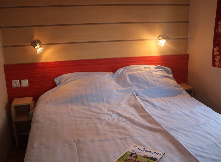 Das Mobilheim hat 2 Schlafzimmer. Eines mit einem Doppelbett von 160 x 200 cm und das andere mit zwei Einzelbetten von je 80 x190 cm. Alle Betten haben Einzel-Bettbezüge. Ein Baby-Bettchen kann nur dazu gestellt werden, wenn eines der Einzelbetten entfernt wird. Sie können noch ein kleines Zelt neben der Unterkunft aufstellen.