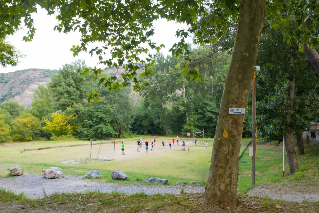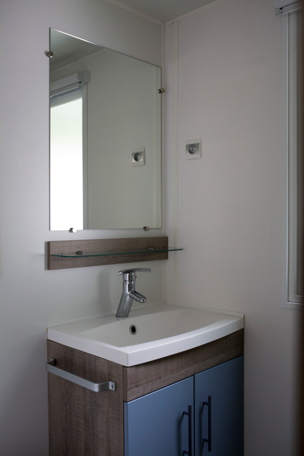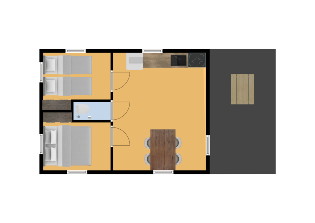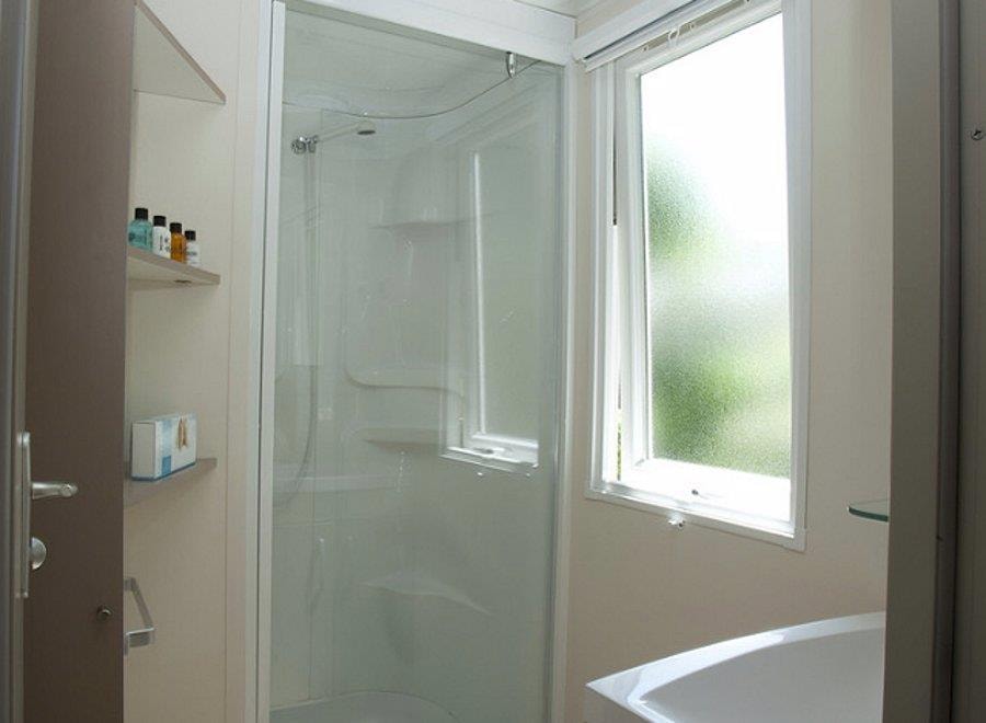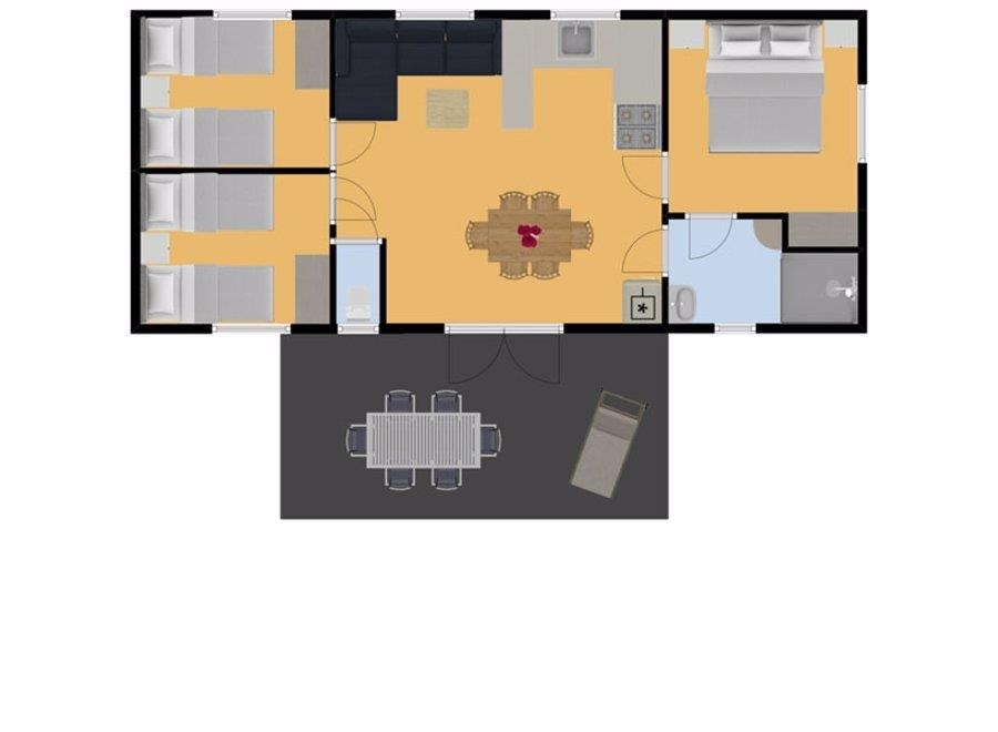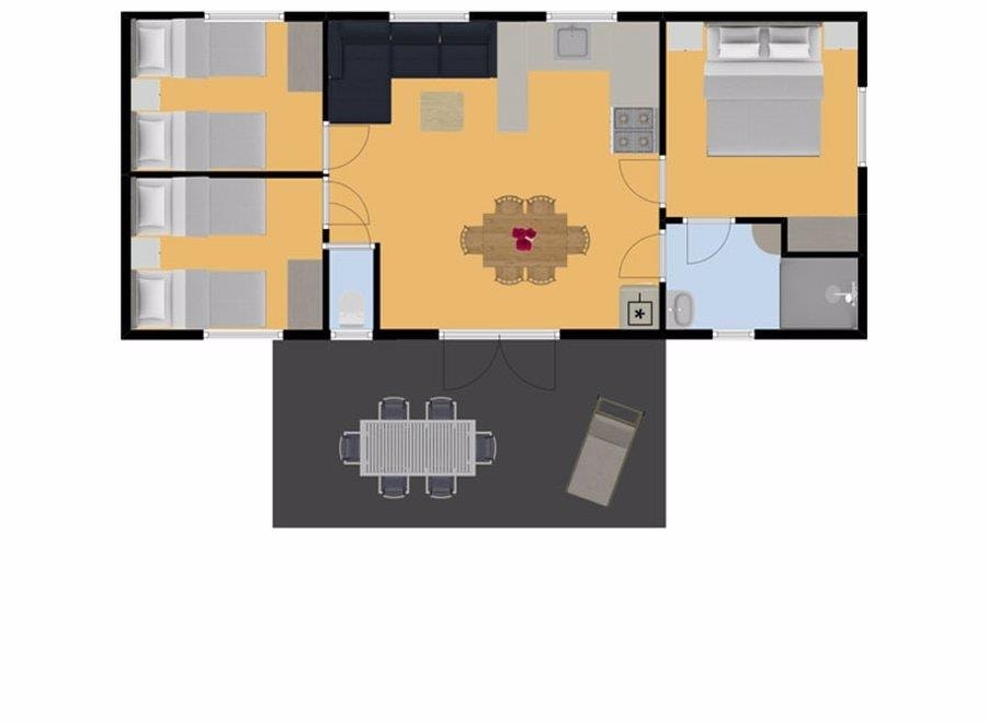 Das Mobilheim hat 2 Schlafzimmer. Eines mit einem Doppelbett von 160 x 200 cm und das andere mit zwei Einzelbetten von je 80 x190 cm. Alle Betten haben Einzel-Bettbezüge. Ein Baby-Bettchen kann nur dazu gestellt werden, wenn eines der Einzelbetten entfernt wird. Sie können noch ein kleines Zelt neben der Unterkunft aufstellen.