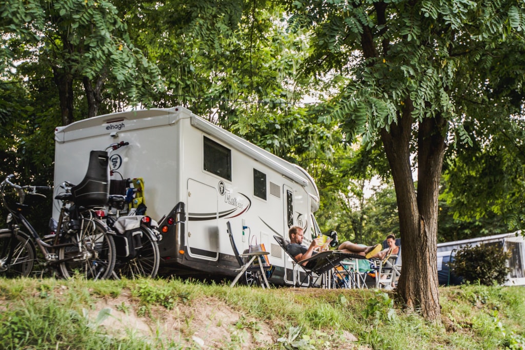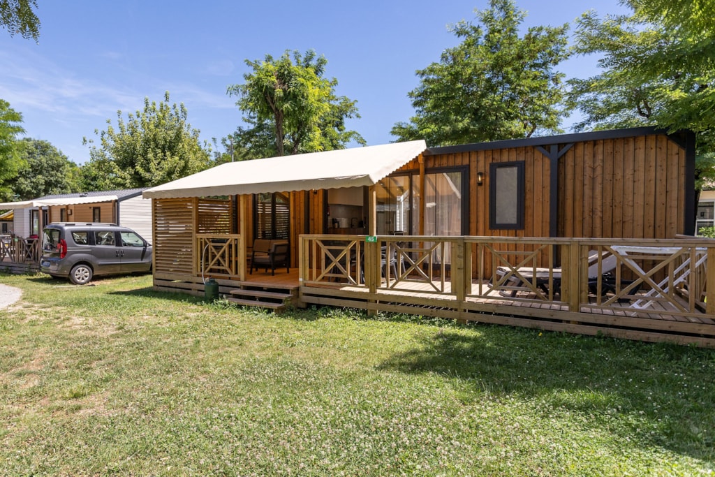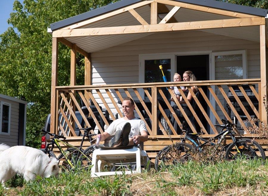 Das Mobilheim hat eine extra große, erhöhte und halb überdachte Terrasse. So können Sie im Schatten oder in der Sonne sitzen. Von der Terrasse aus haben Sie eine großartige Aussicht über den Campingplatz und die Umgebung. Auf der Terrasse warten ein Gartentisch mit vier Stühlen, zwei bequeme Sonnenliegen und ein Gasgrill darauf, dass Sie es sich hier gemütlich machen Sie können Ihr Auto direkt neben der Unterkunft parken.