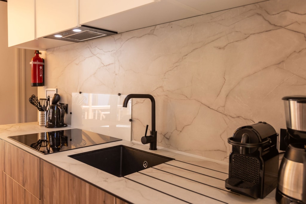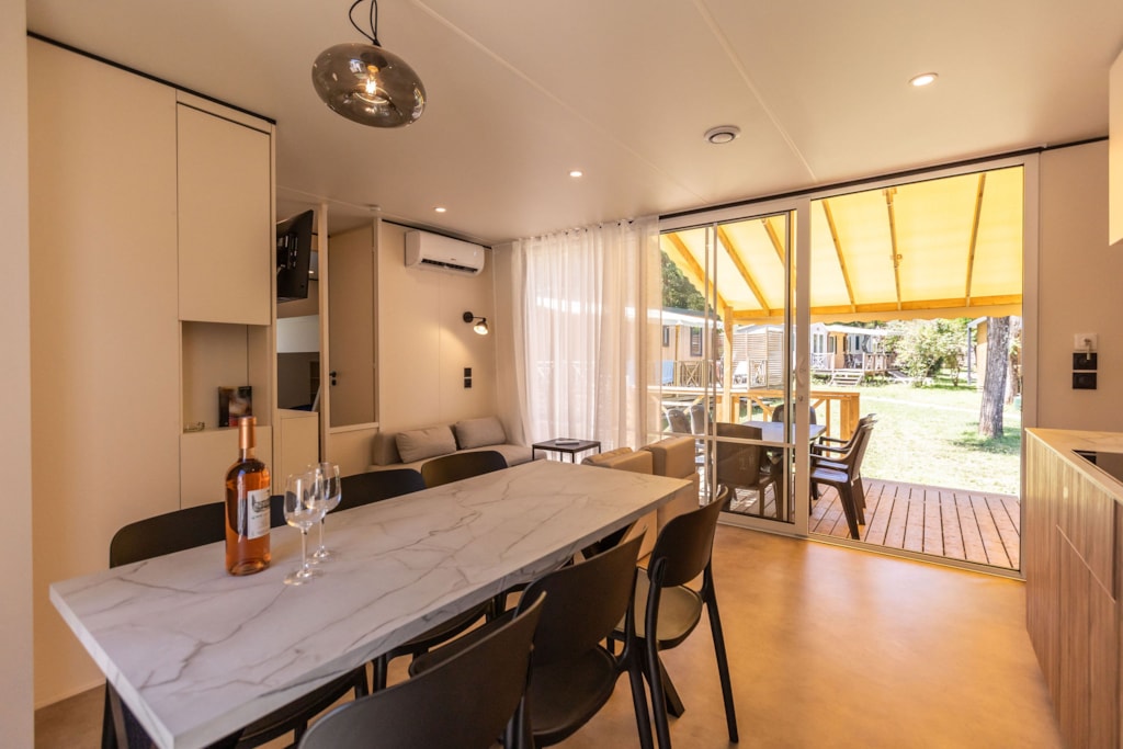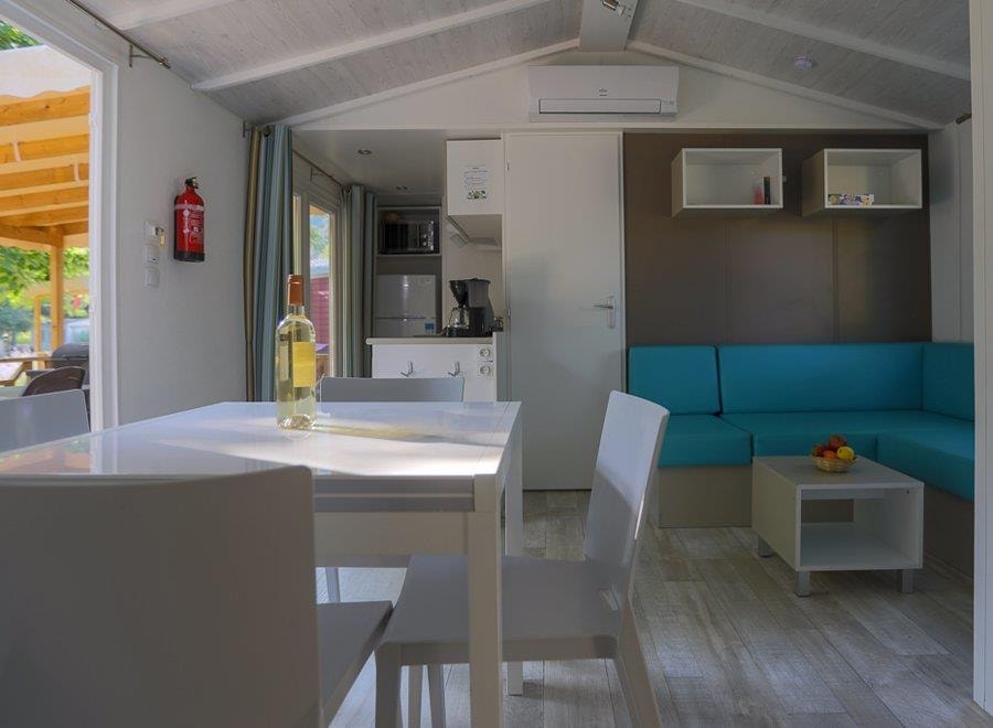 Das Mobilheim hat eine geräumige, offene Küche mit umfangreicher Ausstattung, großem Kühlschrank mit Gefrierfach, 4-Flammen-Herd, Kaffeemaschine, Wasserkocher, Mikrowelle und Spülmaschine.