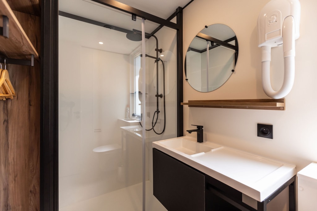 Das Badezimmer ist mit Dusche und Waschbecken ausgestattet, es gibt eine separate Toilette.