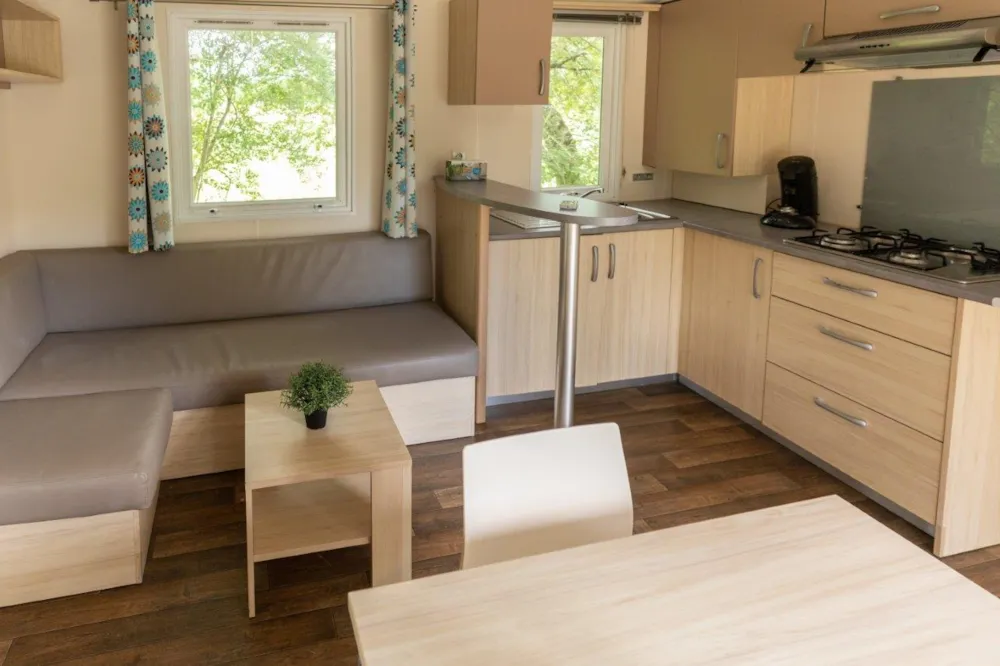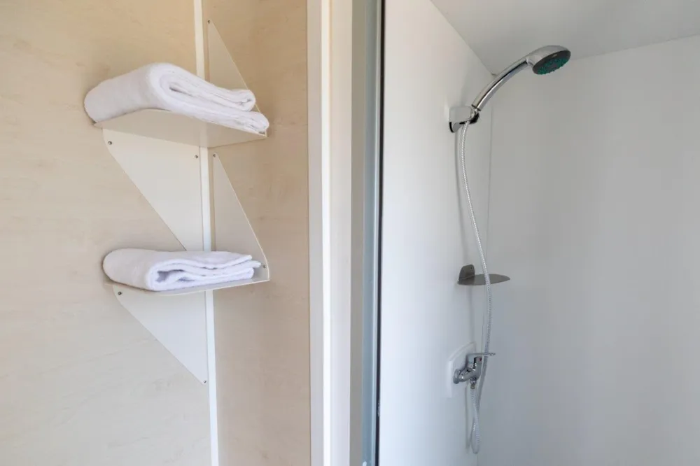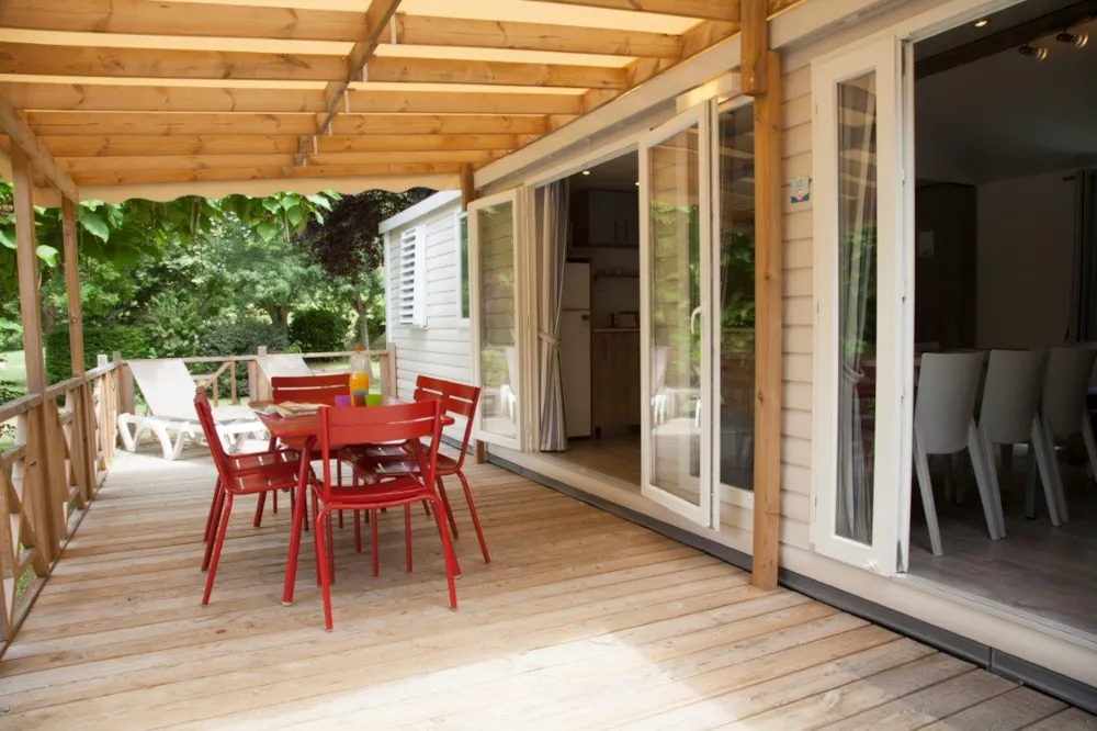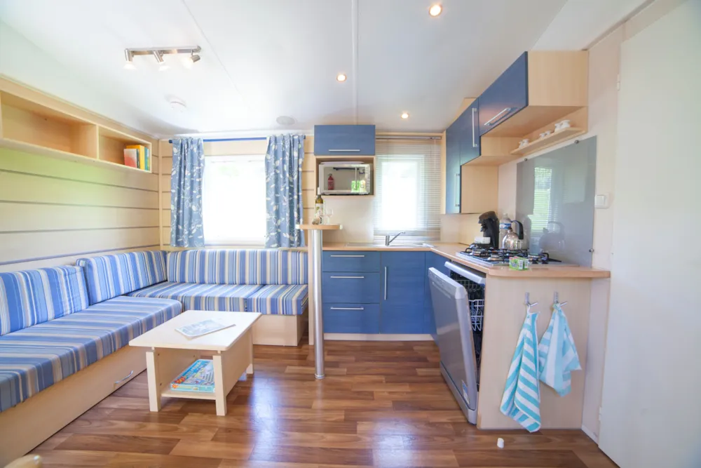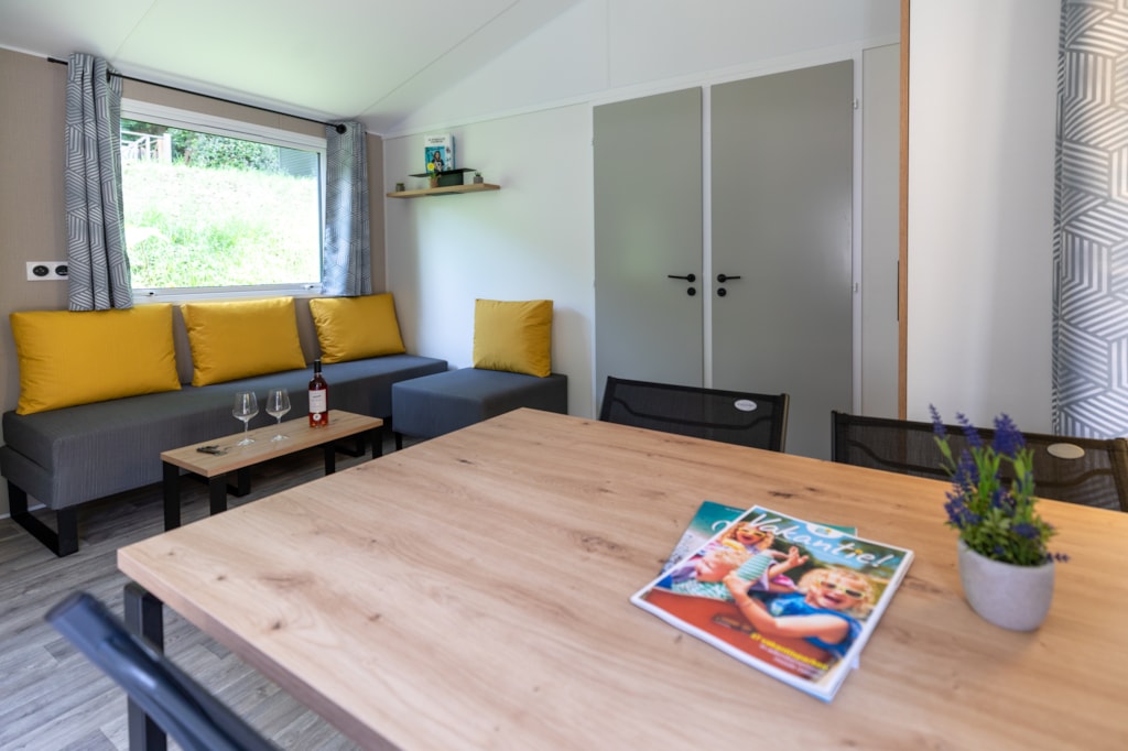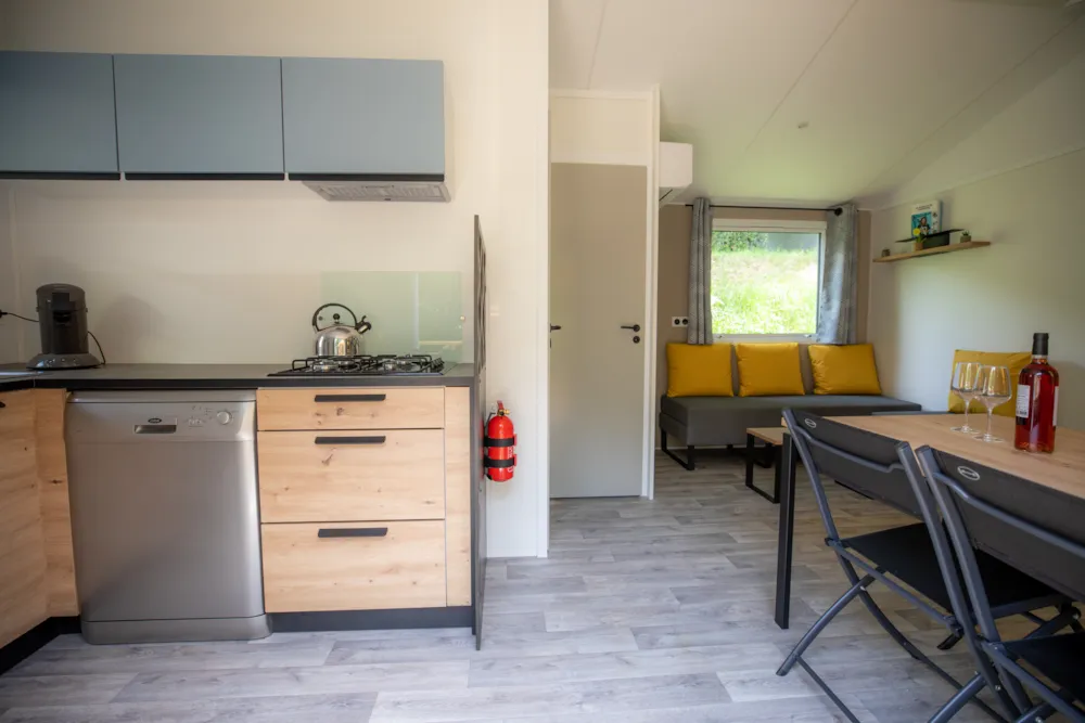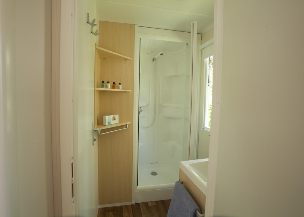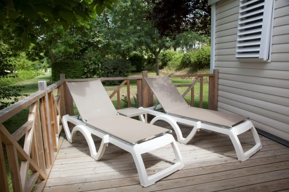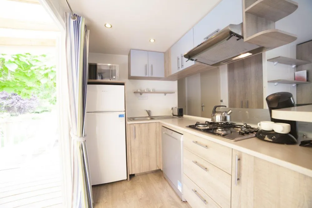 The Domme mobile home features a large live-in kitchen equipped with a dishwasher, combination microwave oven, four-ring hob, fridge-freezer, a dining table with seating and two chairs, a TV (French channels) and DVD player. The mobile home has two bedrooms (one with a double bed (160x200)), a bathroom with shower and washbasin and separate toilet. The cosy veranda has modern patio furniture for four. Two sun loungers are situated next to the accommodation. This mobile home is less suitable for guests with mobility problems because of the high location.