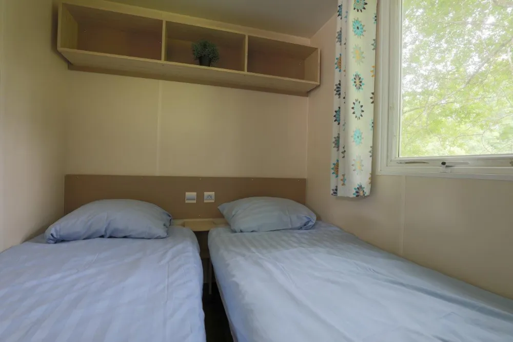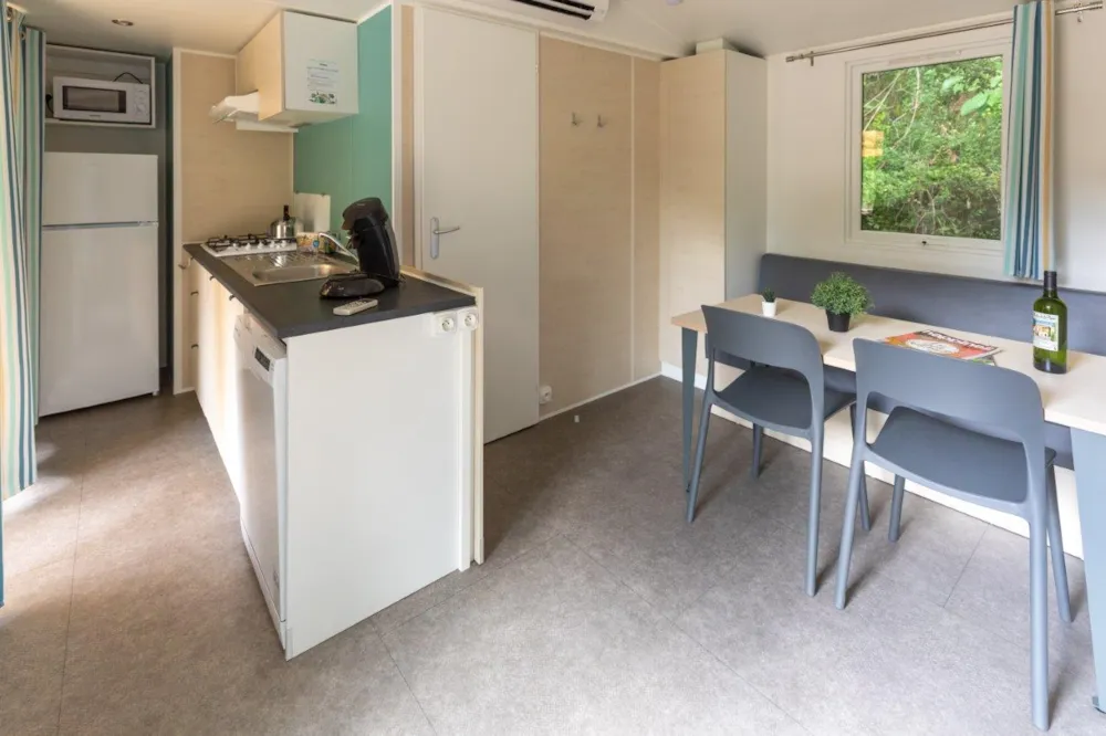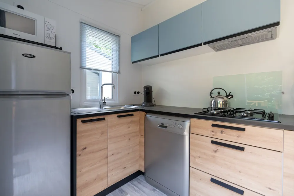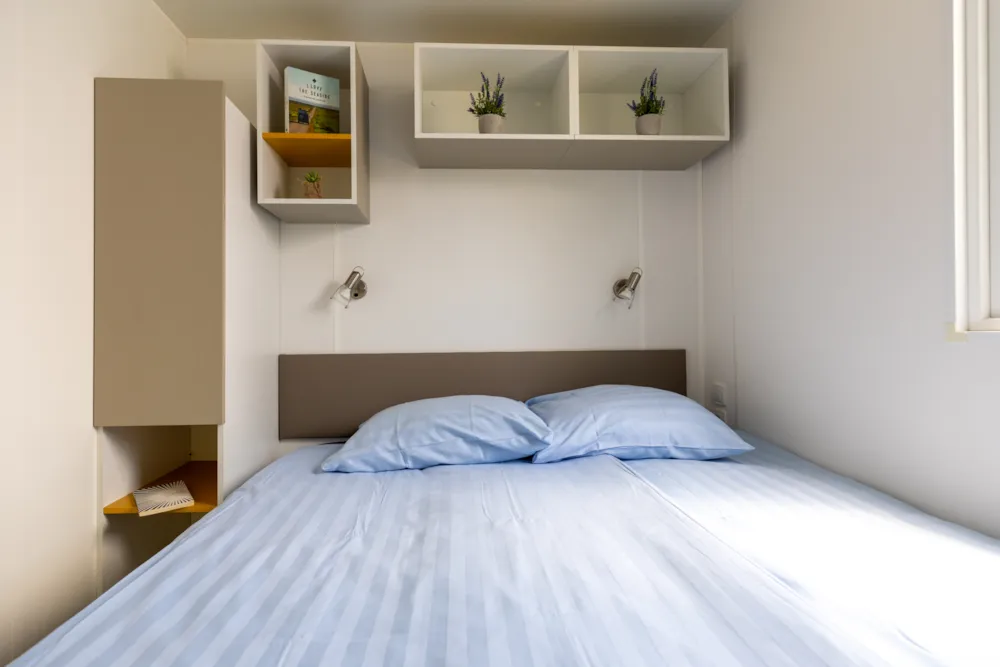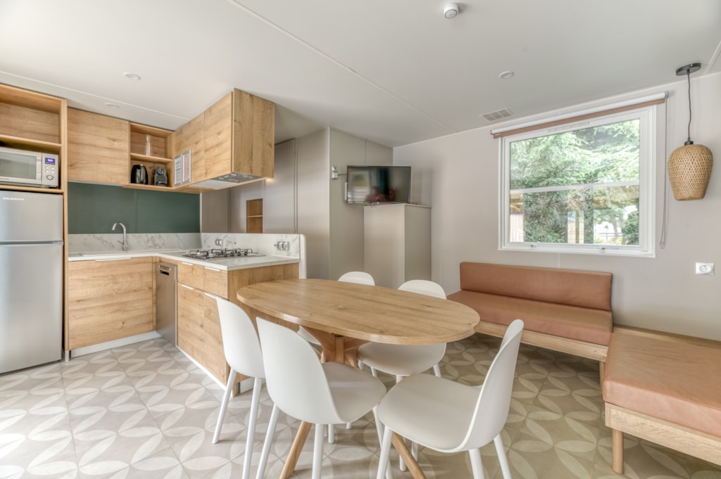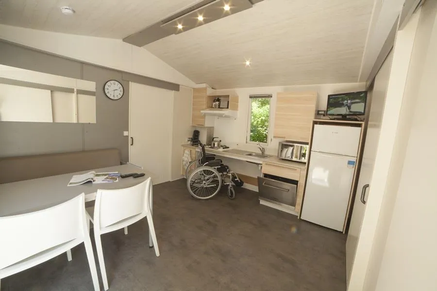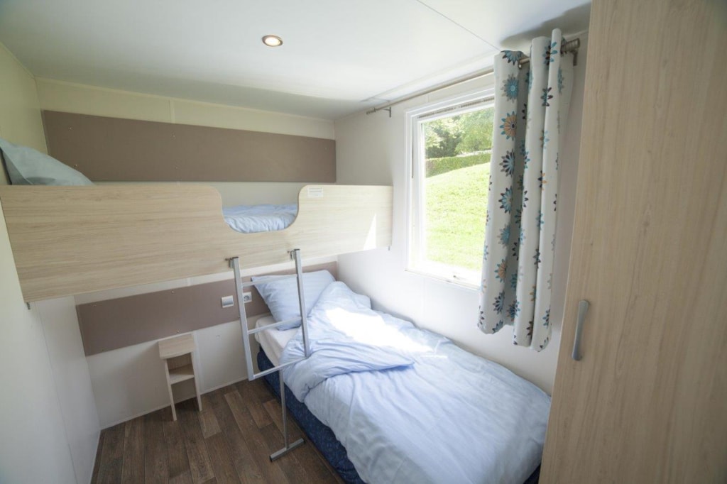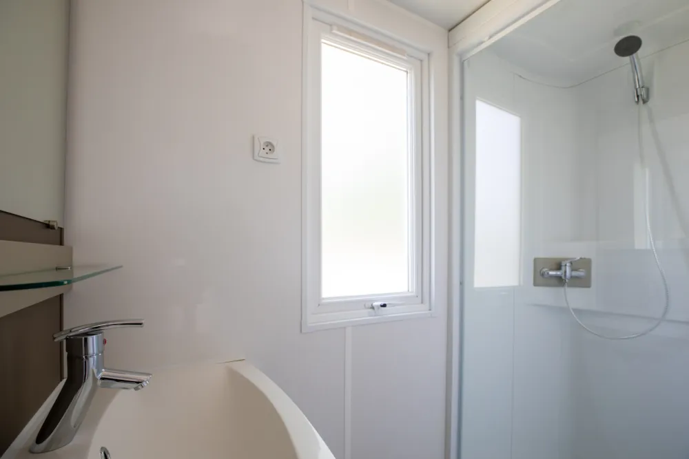 The Domme mobile home features a large live-in kitchen equipped with a dishwasher, combination microwave oven, four-ring hob, fridge-freezer, a dining table with seating and two chairs, a TV (French channels) and DVD player. The mobile home has two bedrooms (one with a double bed (160x200)), a bathroom with shower and washbasin and separate toilet. The cosy veranda has modern patio furniture for four. Two sun loungers are situated next to the accommodation. This mobile home is less suitable for guests with mobility problems because of the high location.