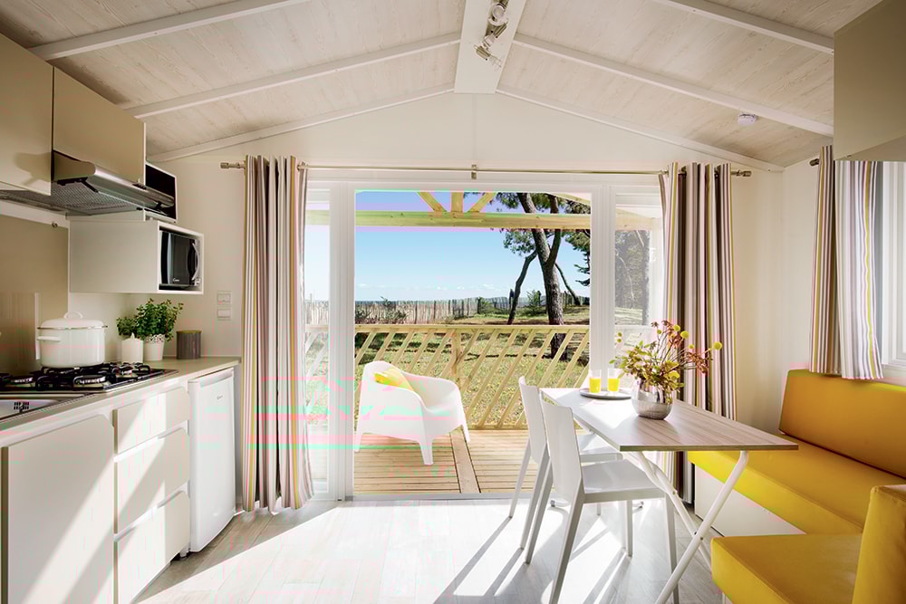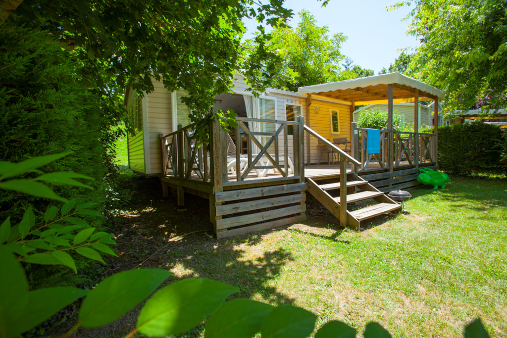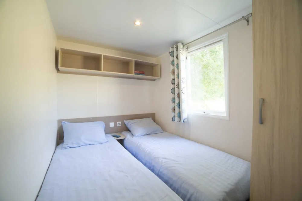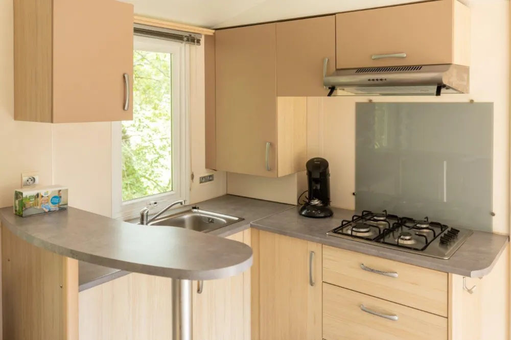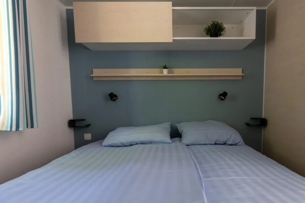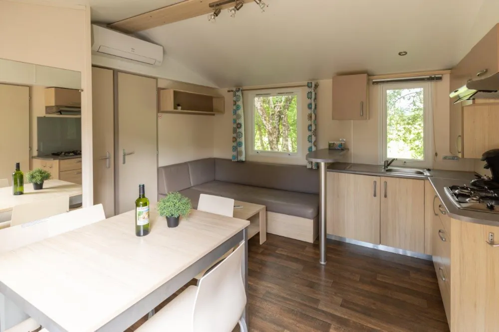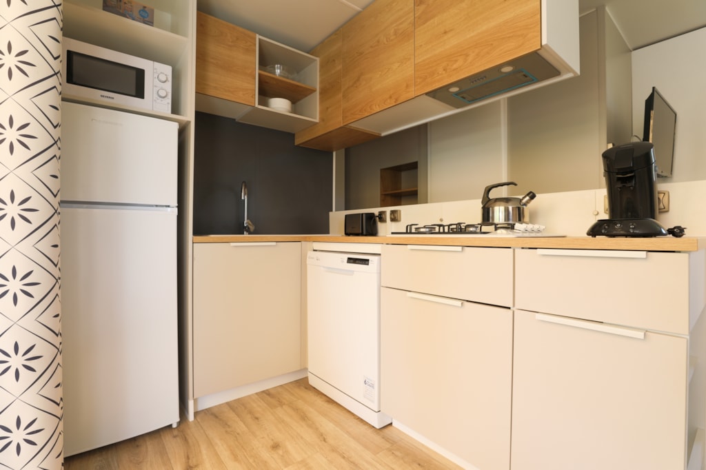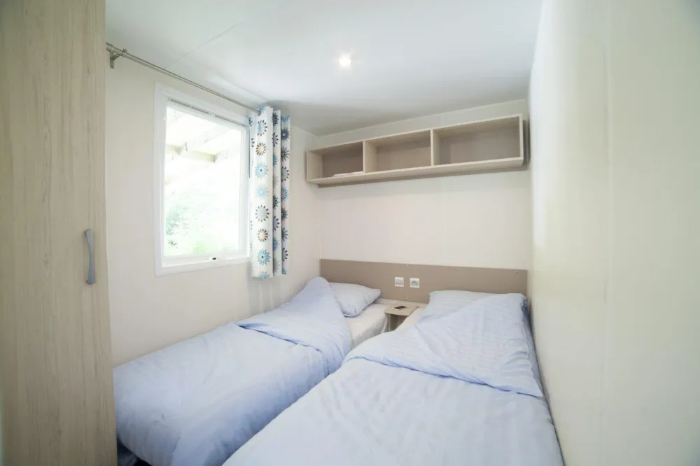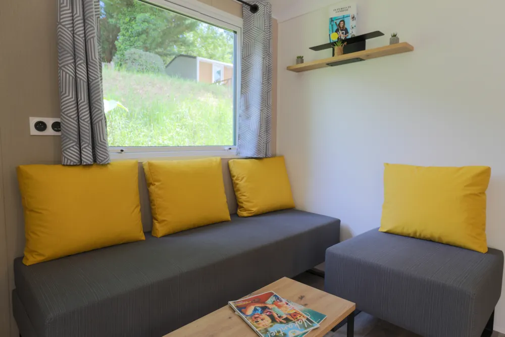 The Domme mobile home features a large live-in kitchen equipped with a dishwasher, combination microwave oven, four-ring hob, fridge-freezer, a dining table with seating and two chairs, a TV (French channels) and DVD player. The mobile home has two bedrooms (one with a double bed (160x200)), a bathroom with shower and washbasin and separate toilet. The cosy veranda has modern patio furniture for four. Two sun loungers are situated next to the accommodation. This mobile home is less suitable for guests with mobility problems because of the high location.