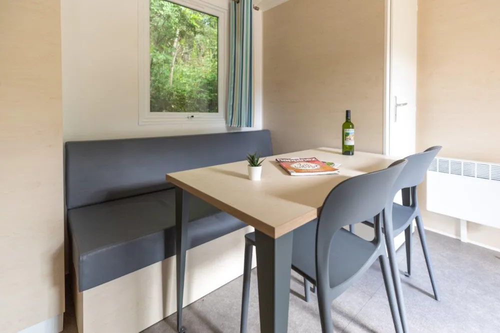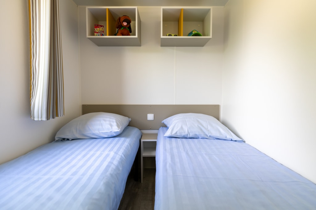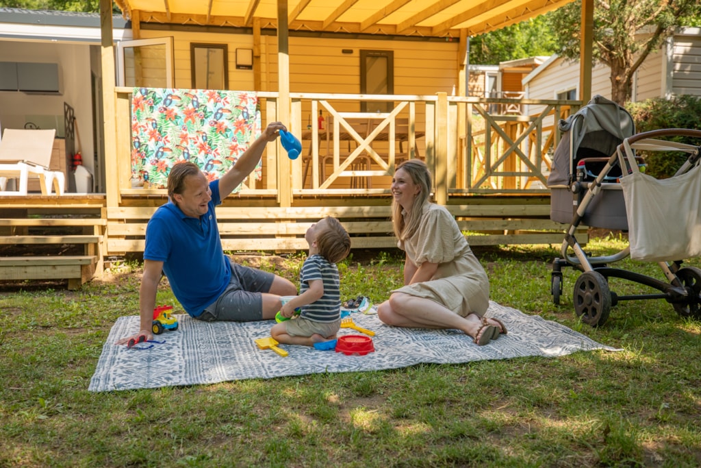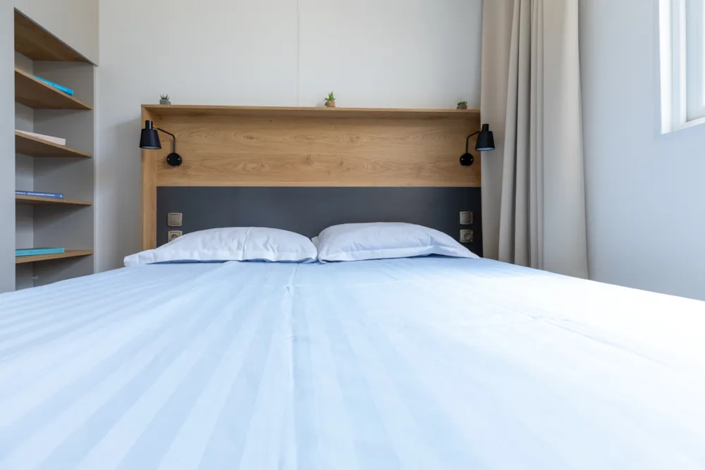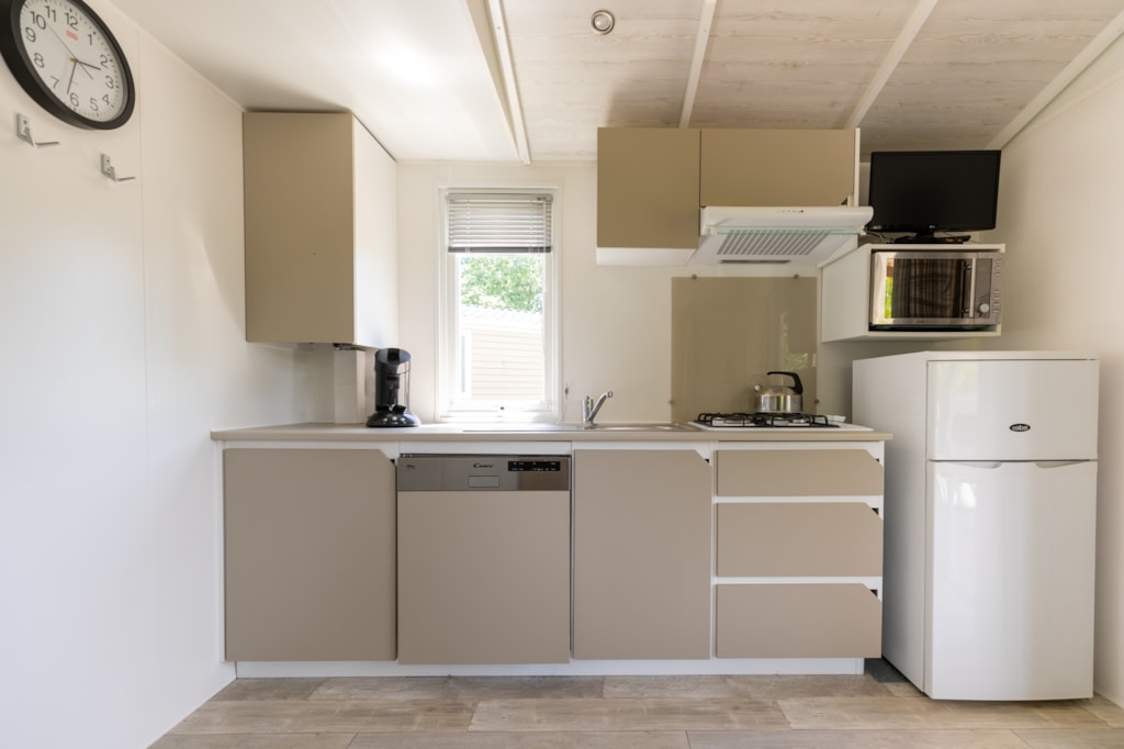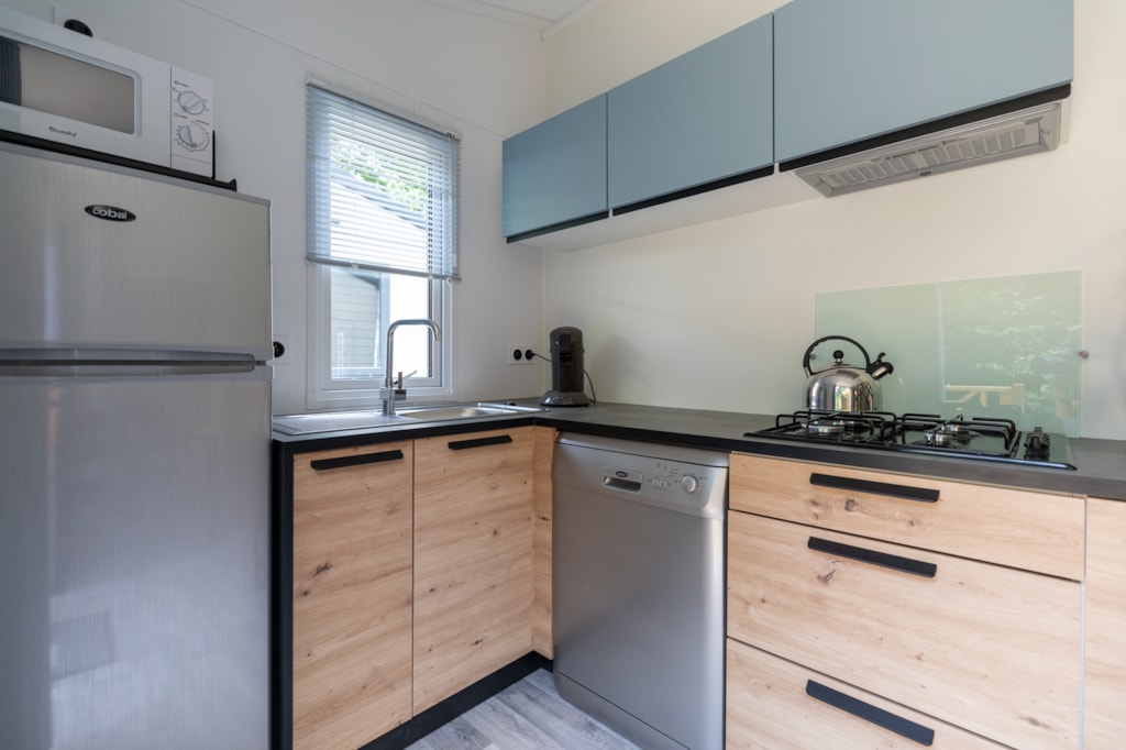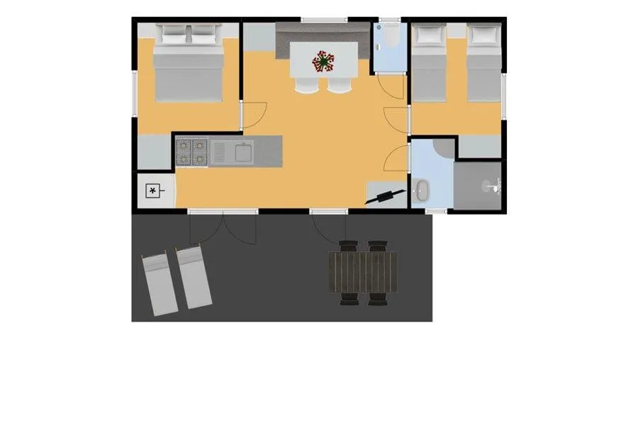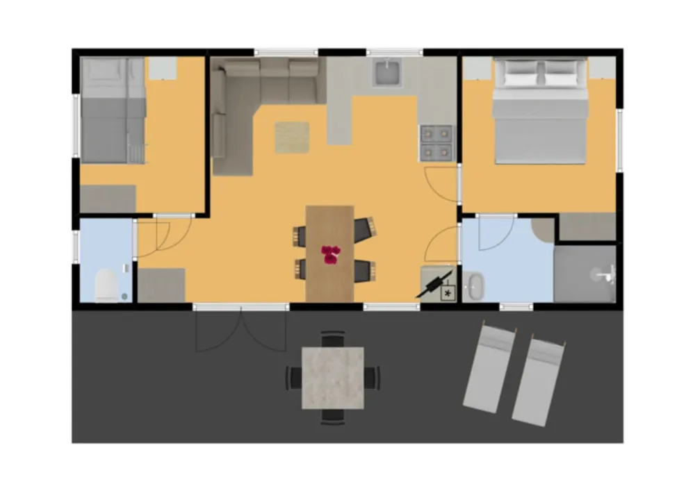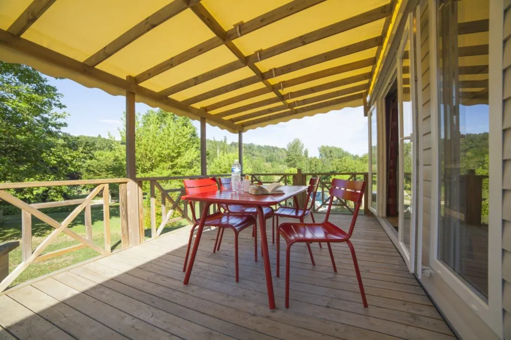 The Domme mobile home features a large live-in kitchen equipped with a dishwasher, combination microwave oven, four-ring hob, fridge-freezer, a dining table with seating and two chairs, a TV (French channels) and DVD player. The mobile home has two bedrooms (one with a double bed (160x200)), a bathroom with shower and washbasin and separate toilet. The cosy veranda has modern patio furniture for four. Two sun loungers are situated next to the accommodation. This mobile home is less suitable for guests with mobility problems because of the high location.