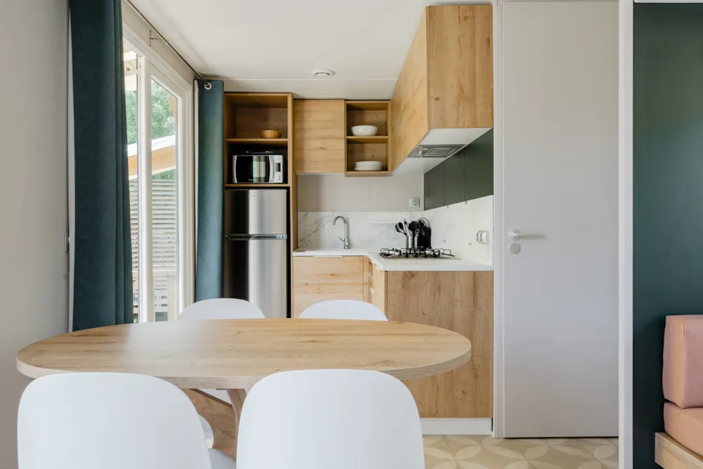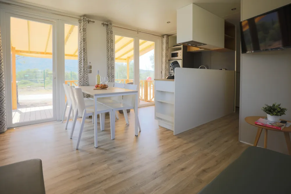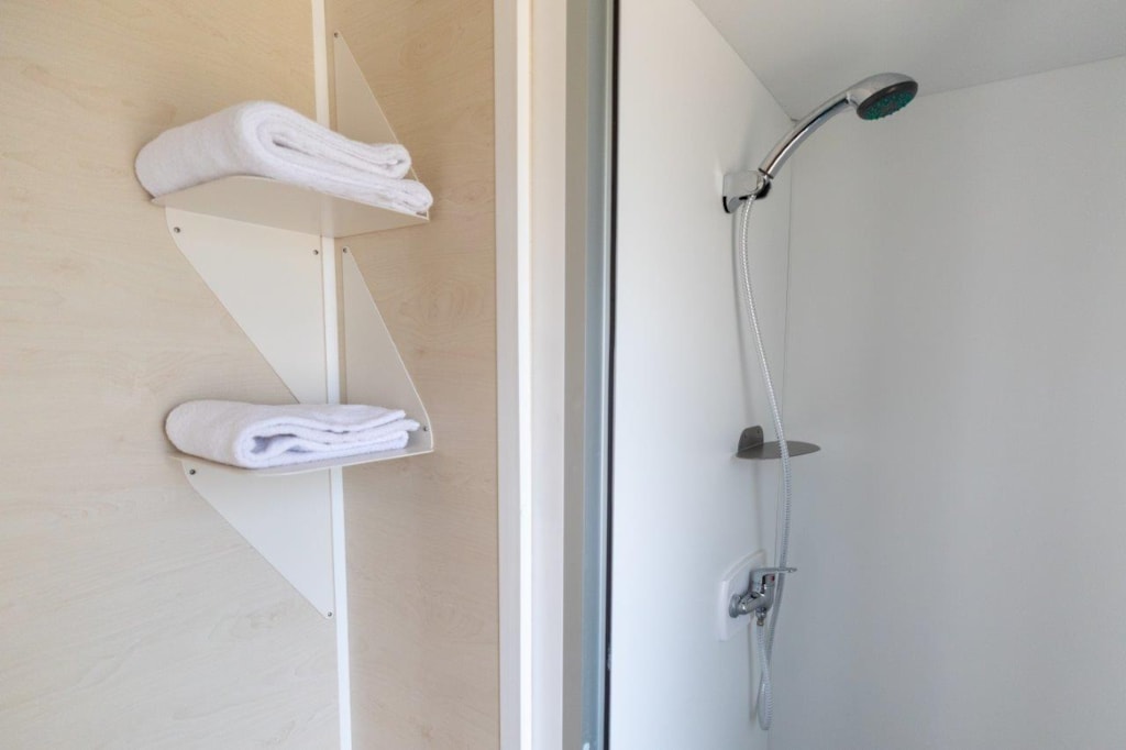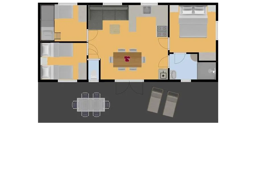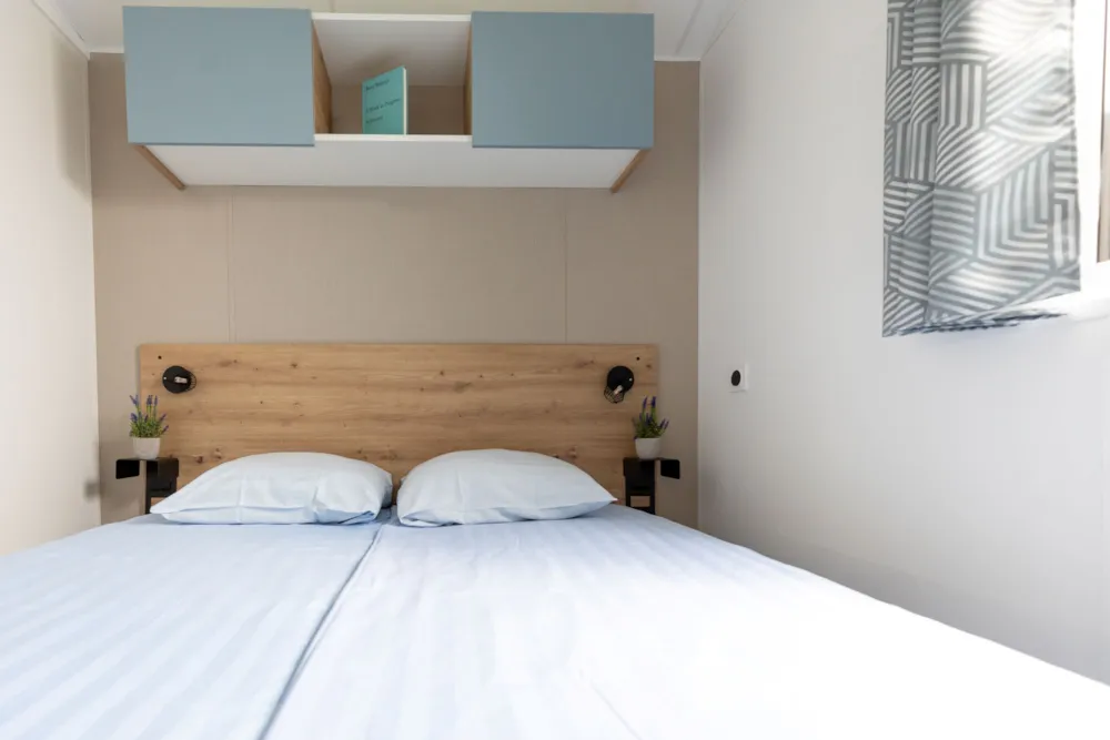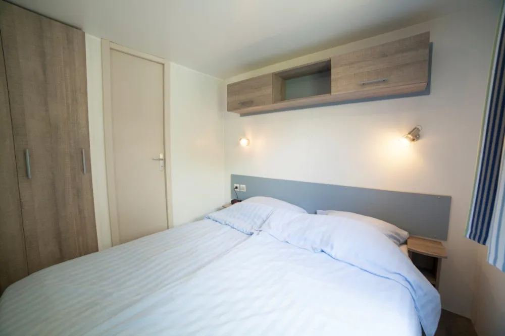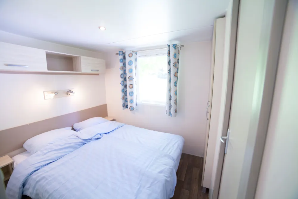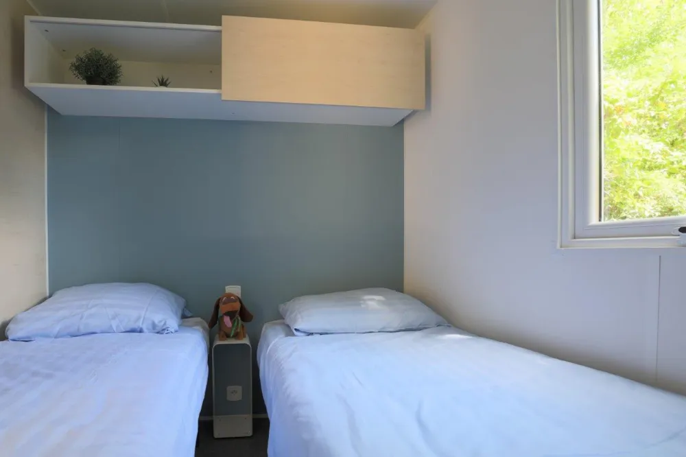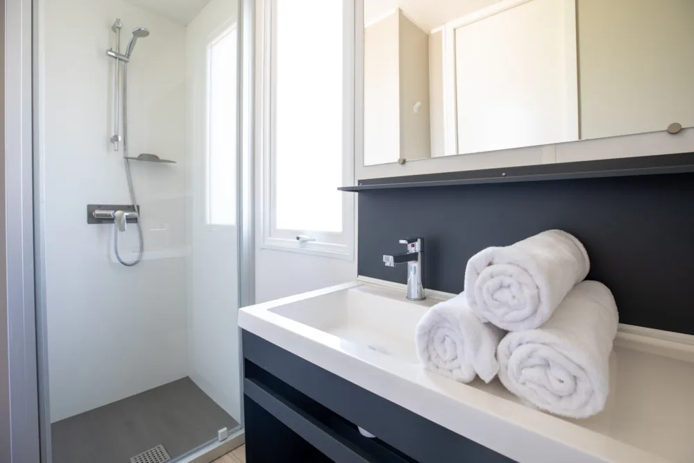 The Domme mobile home features a large live-in kitchen equipped with a dishwasher, combination microwave oven, four-ring hob, fridge-freezer, a dining table with seating and two chairs, a TV (French channels) and DVD player. The mobile home has two bedrooms (one with a double bed (160x200)), a bathroom with shower and washbasin and separate toilet. The cosy veranda has modern patio furniture for four. Two sun loungers are situated next to the accommodation. This mobile home is less suitable for guests with mobility problems because of the high location.