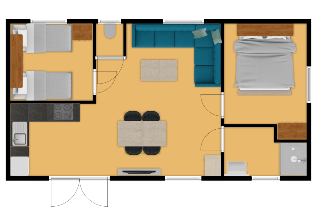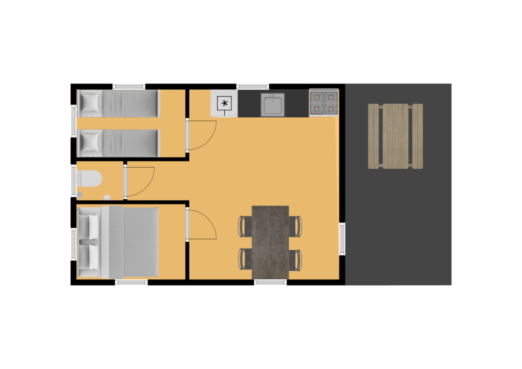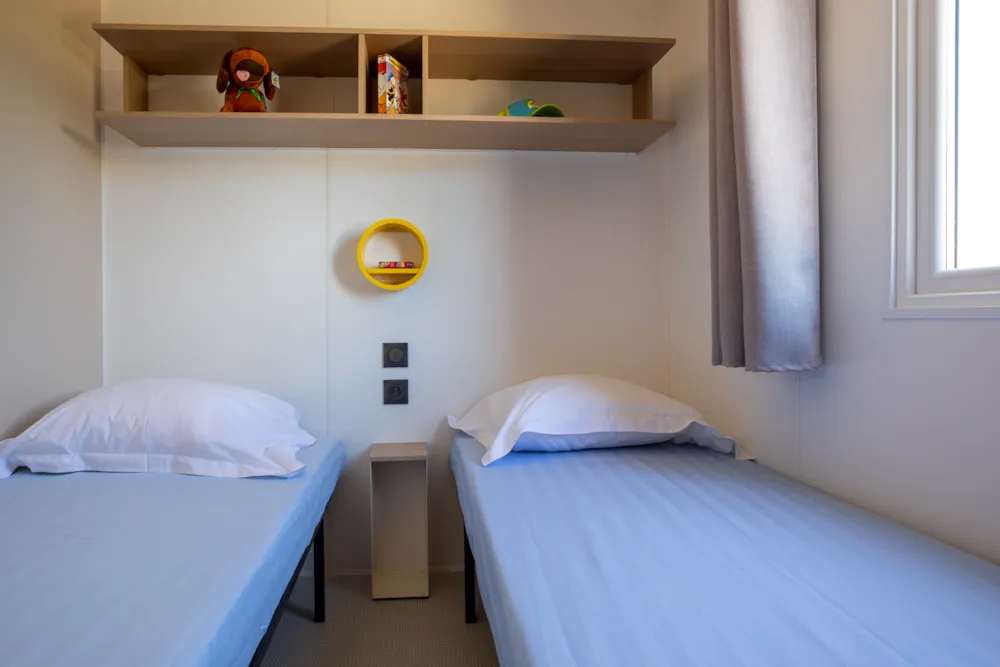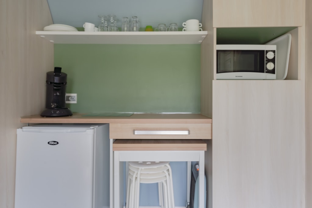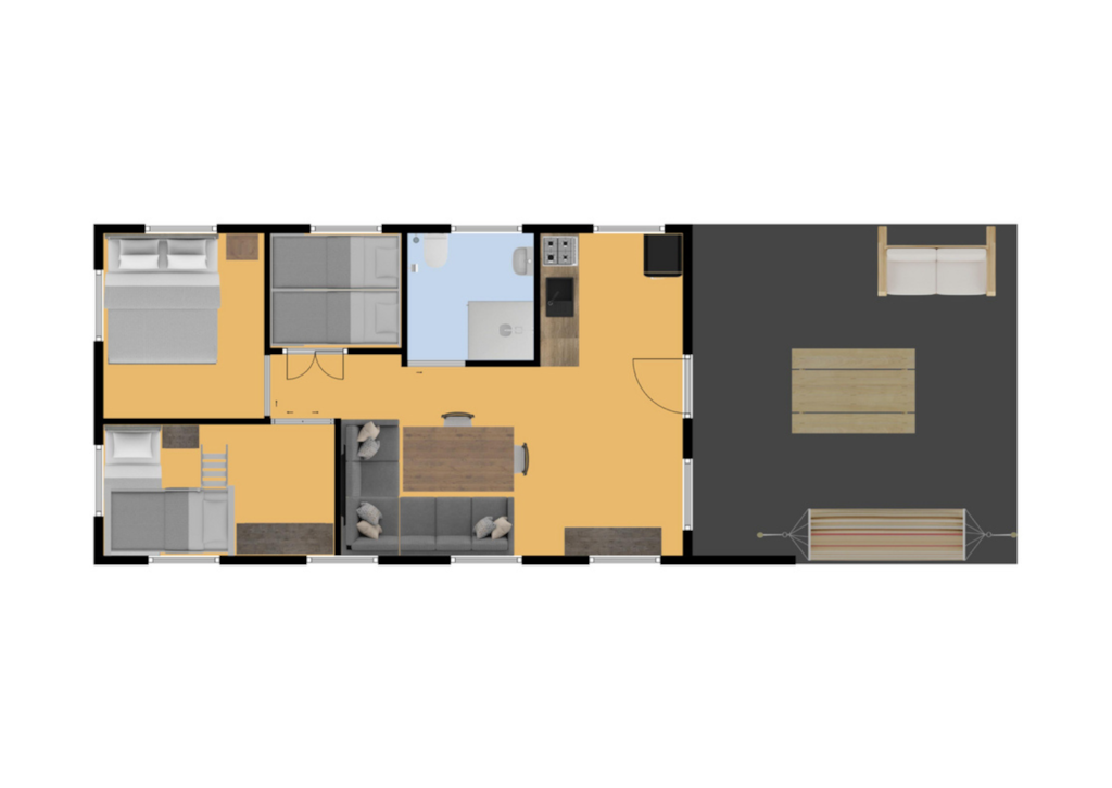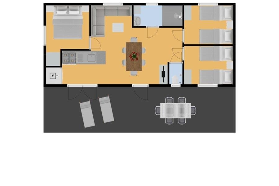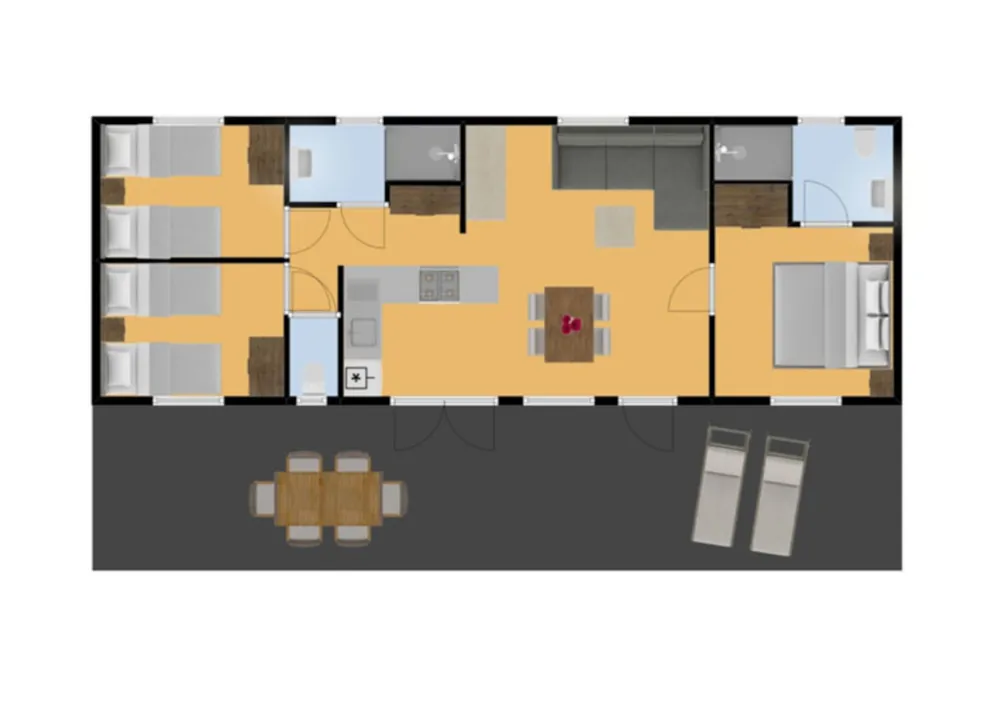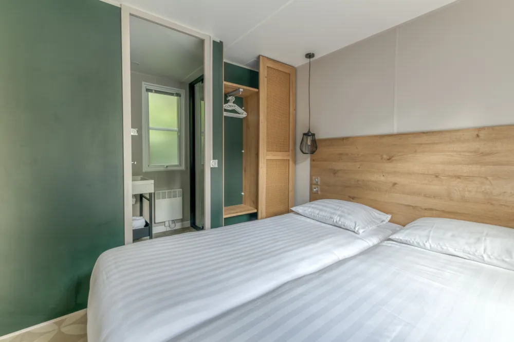 The Domme mobile home features a large live-in kitchen equipped with a dishwasher, combination microwave oven, four-ring hob, fridge-freezer, a dining table with seating and two chairs, a TV (French channels) and DVD player. The mobile home has two bedrooms (one with a double bed (160x200)), a bathroom with shower and washbasin and separate toilet. The cosy veranda has modern patio furniture for four. Two sun loungers are situated next to the accommodation. This mobile home is less suitable for guests with mobility problems because of the high location.