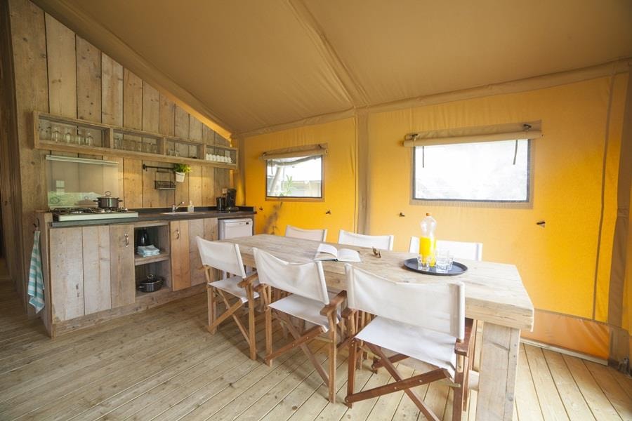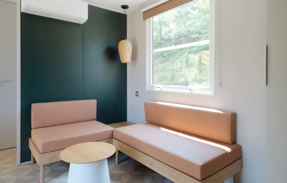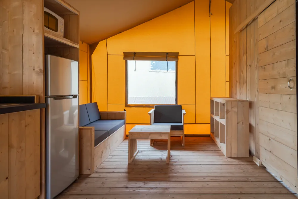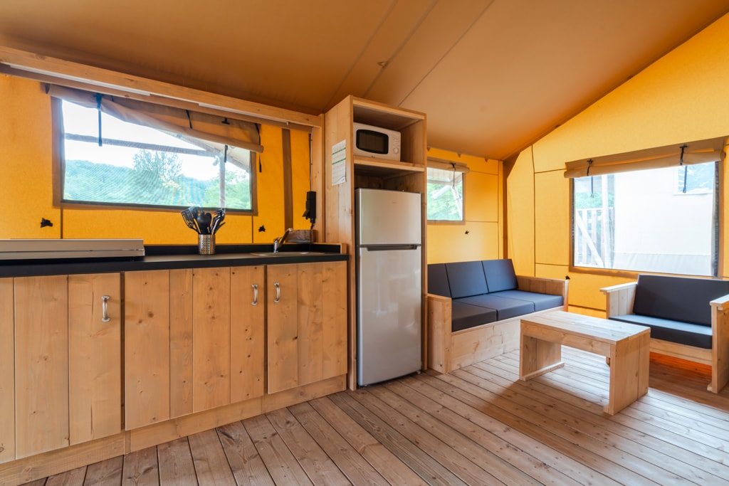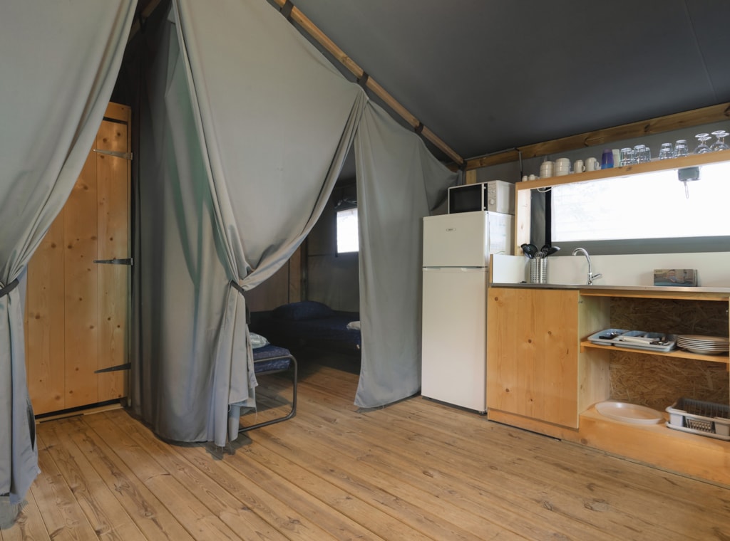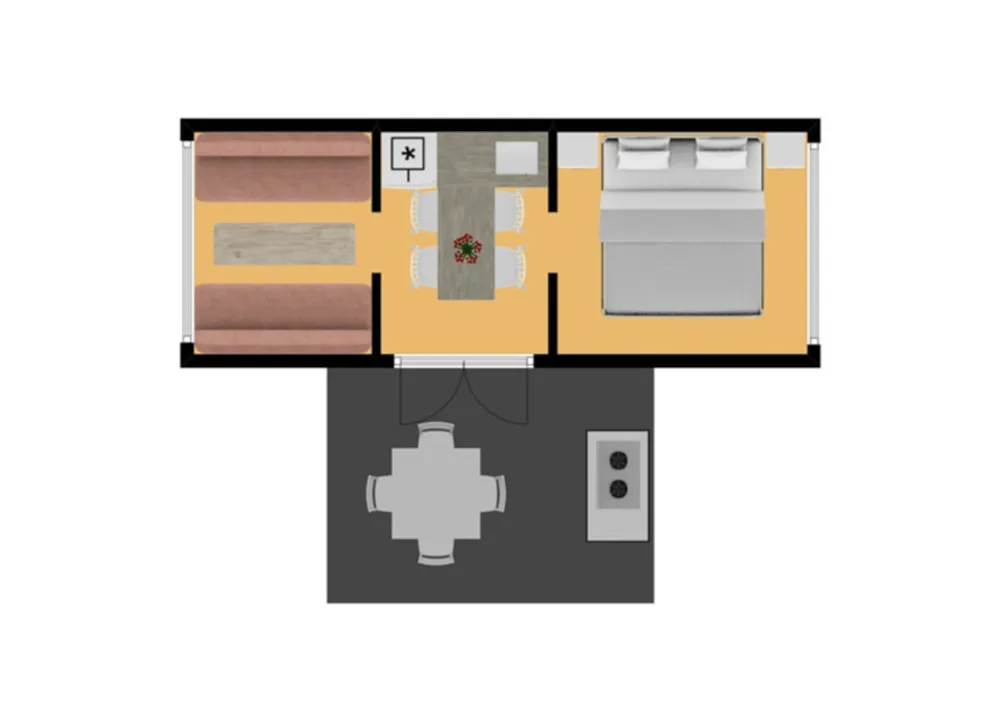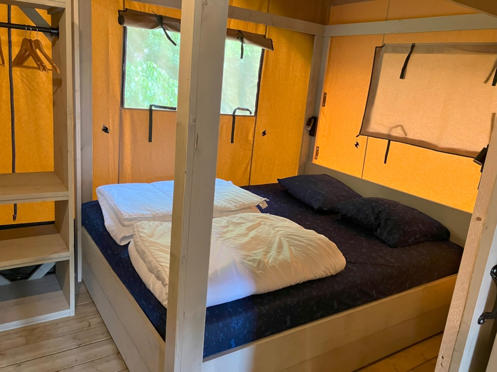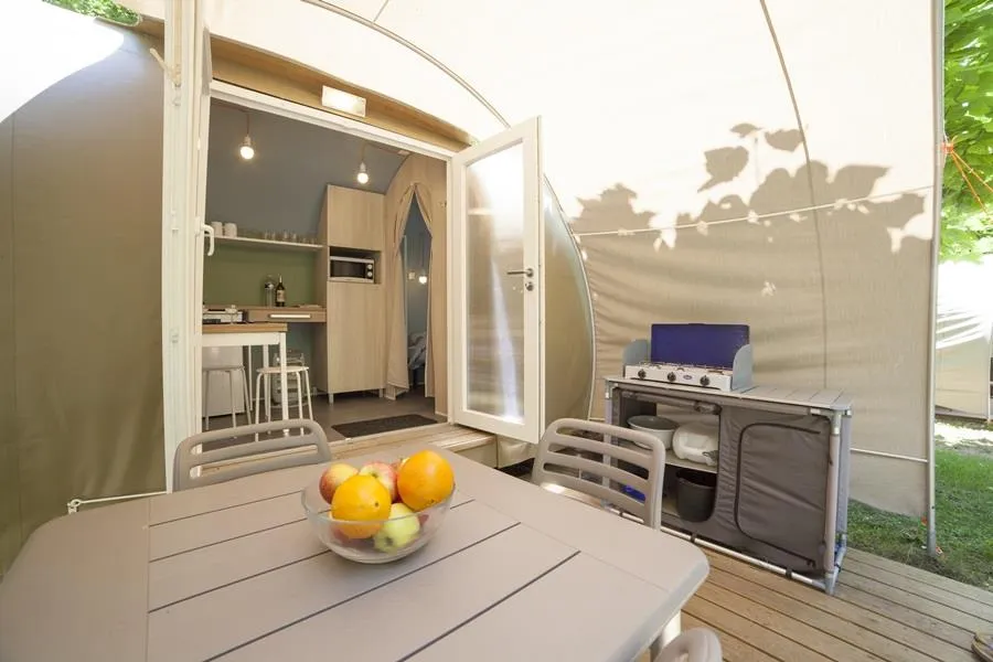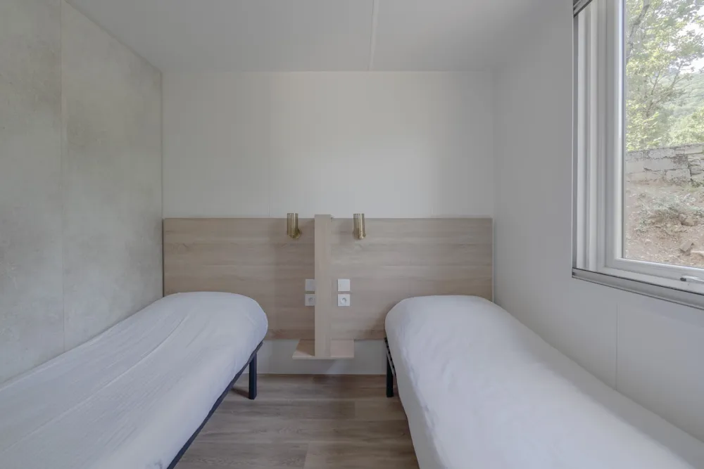 The Domme mobile home features a large live-in kitchen equipped with a dishwasher, combination microwave oven, four-ring hob, fridge-freezer, a dining table with seating and two chairs, a TV (French channels) and DVD player. The mobile home has two bedrooms (one with a double bed (160x200)), a bathroom with shower and washbasin and separate toilet. The cosy veranda has modern patio furniture for four. Two sun loungers are situated next to the accommodation. This mobile home is less suitable for guests with mobility problems because of the high location.