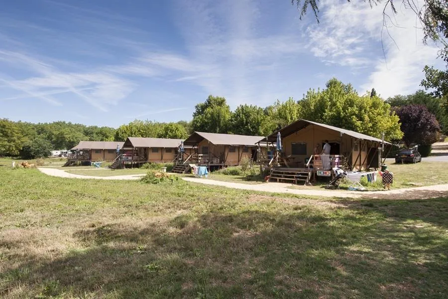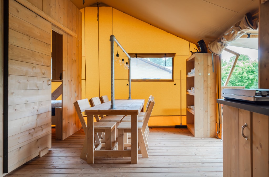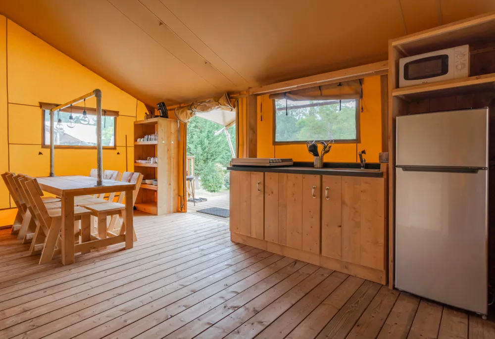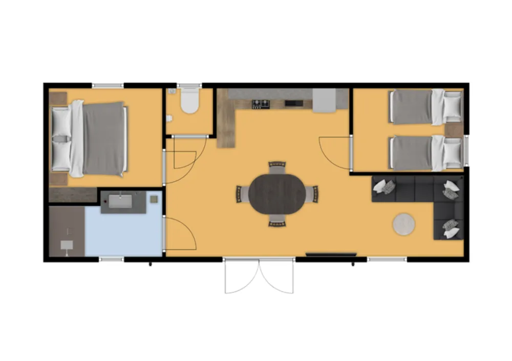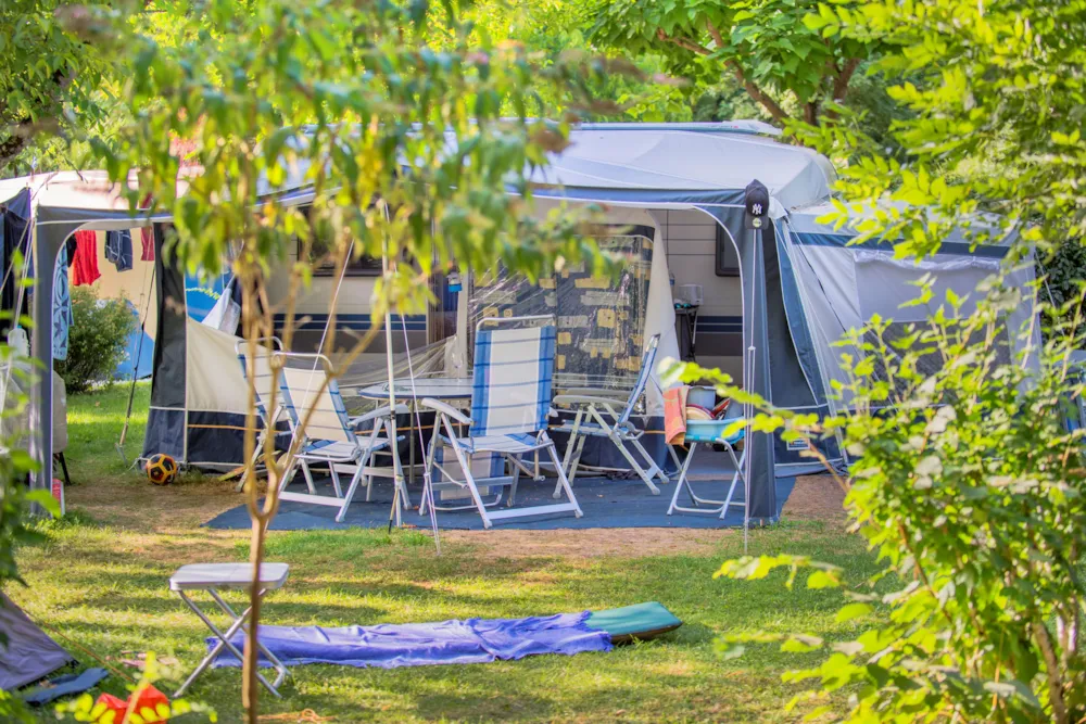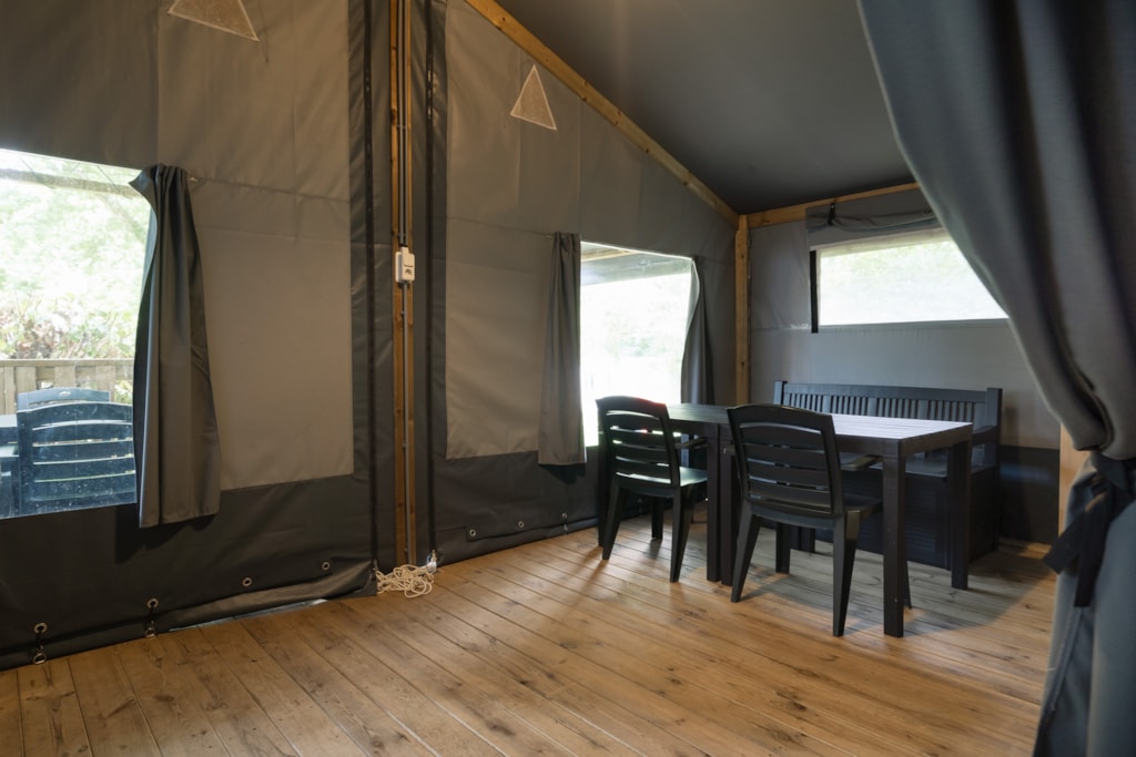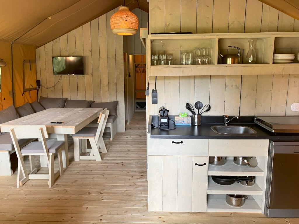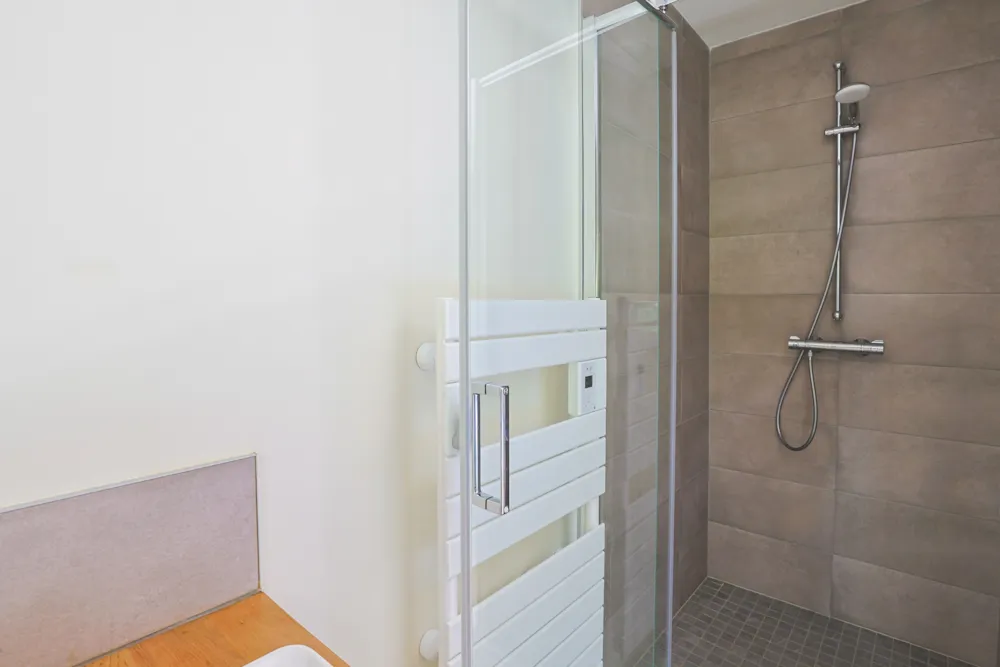 The Domme mobile home features a large live-in kitchen equipped with a dishwasher, combination microwave oven, four-ring hob, fridge-freezer, a dining table with seating and two chairs, a TV (French channels) and DVD player. The mobile home has two bedrooms (one with a double bed (160x200)), a bathroom with shower and washbasin and separate toilet. The cosy veranda has modern patio furniture for four. Two sun loungers are situated next to the accommodation. This mobile home is less suitable for guests with mobility problems because of the high location.