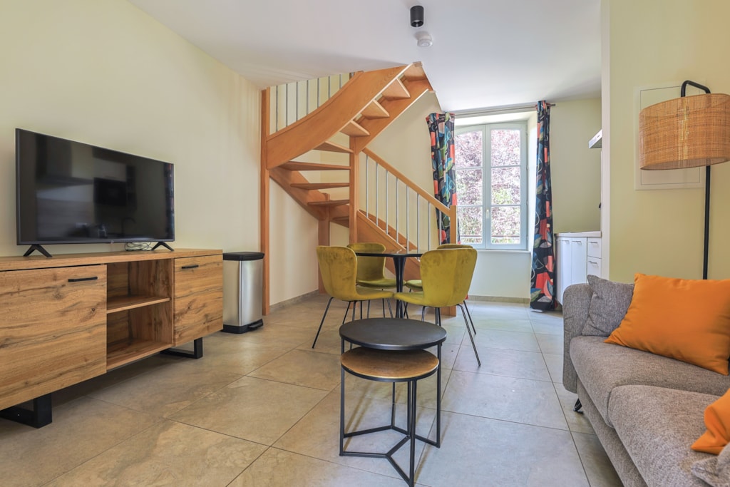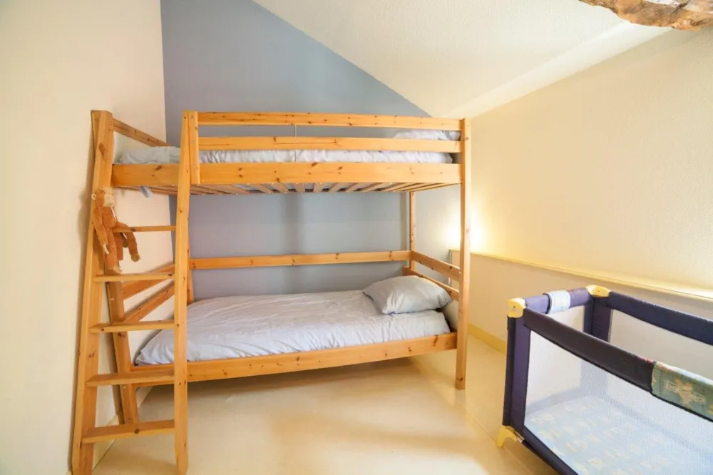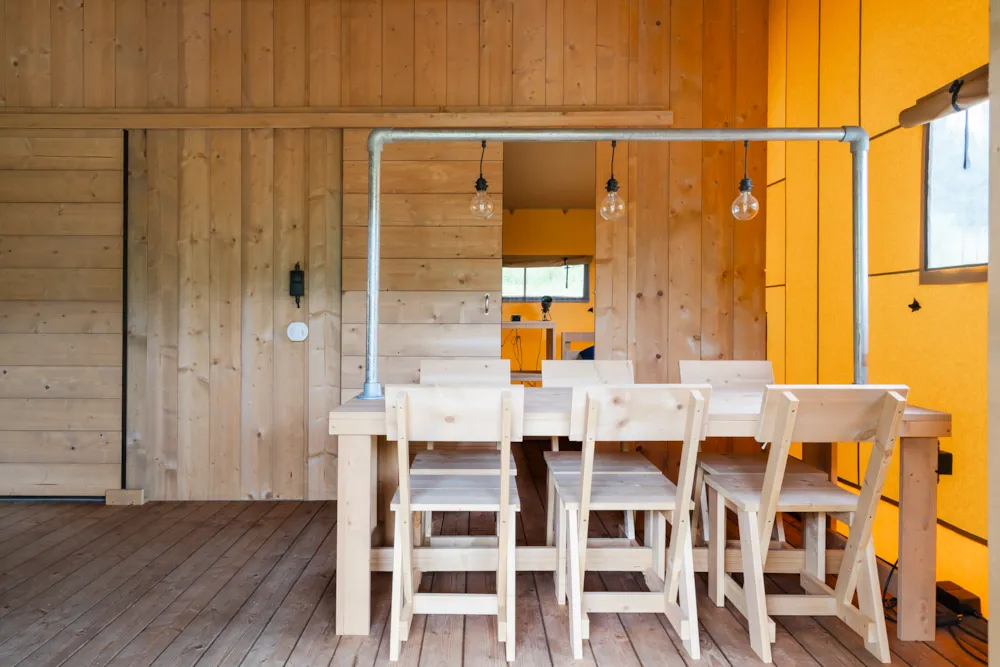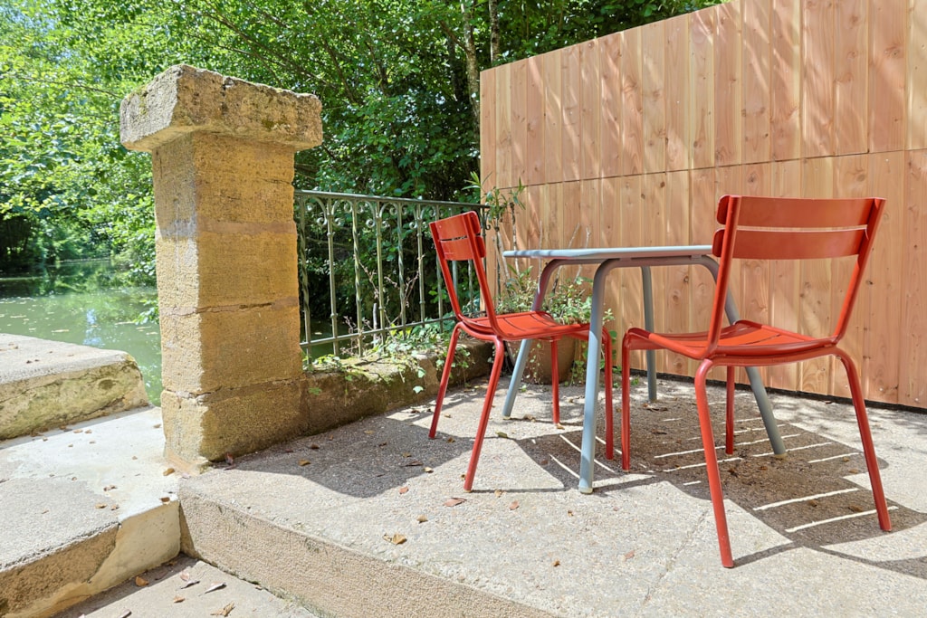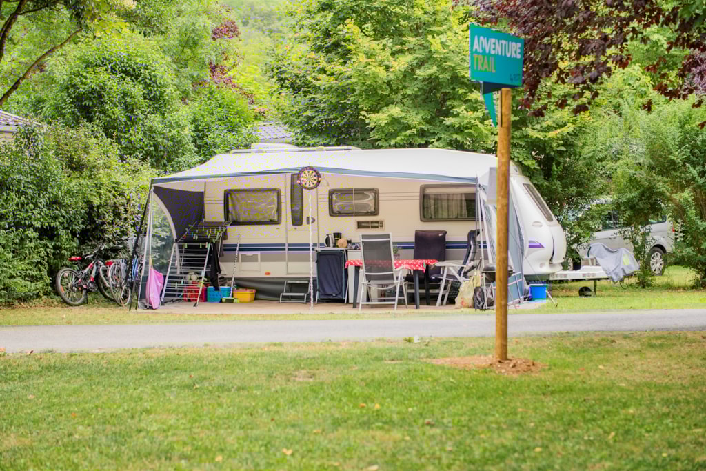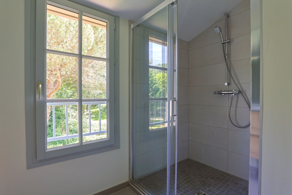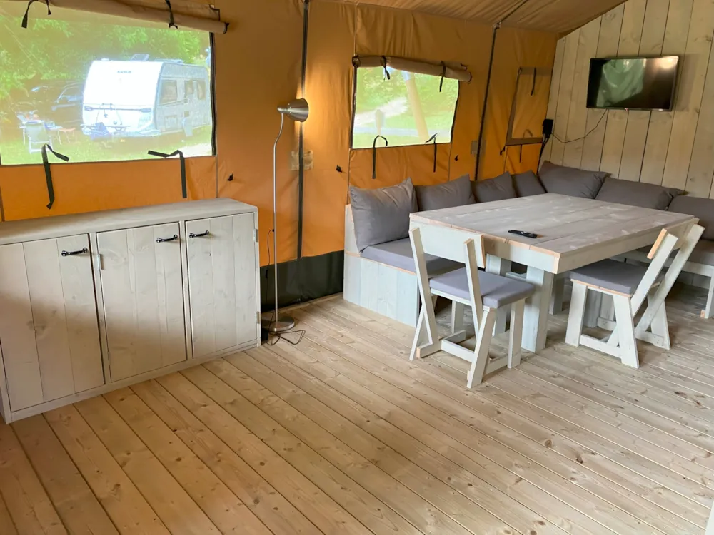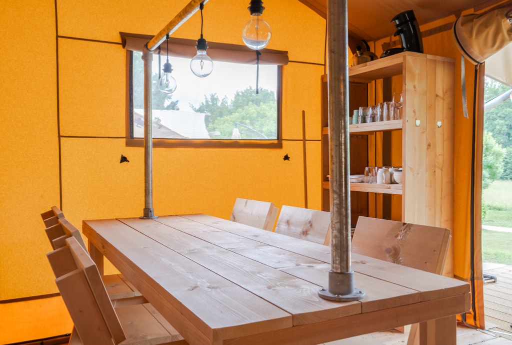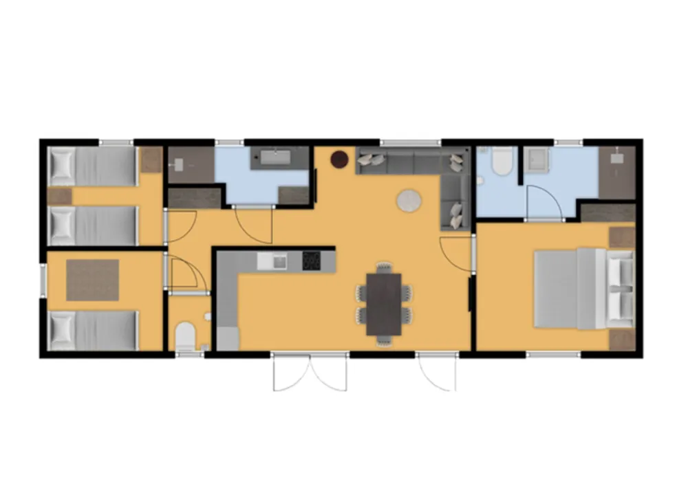 The Domme mobile home features a large live-in kitchen equipped with a dishwasher, combination microwave oven, four-ring hob, fridge-freezer, a dining table with seating and two chairs, a TV (French channels) and DVD player. The mobile home has two bedrooms (one with a double bed (160x200)), a bathroom with shower and washbasin and separate toilet. The cosy veranda has modern patio furniture for four. Two sun loungers are situated next to the accommodation. This mobile home is less suitable for guests with mobility problems because of the high location.