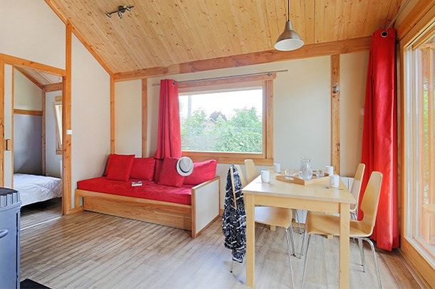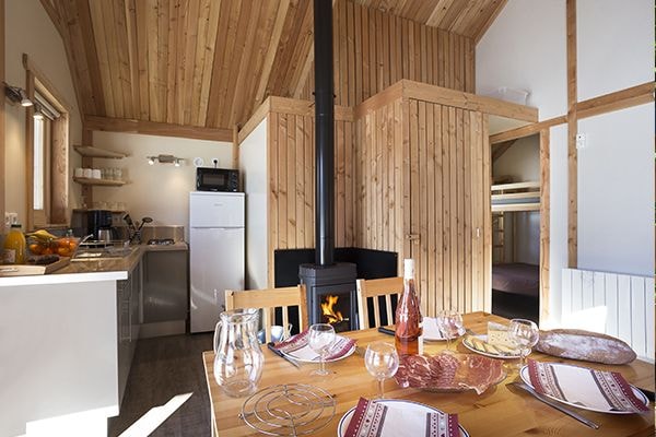 Für bis zu 5 Personen Fläche: 35 m² Hauptraum mit eingerichteter Küchenecke und Holzofen im Aufenthaltsbereich. Zwei Zimmer: eines mit Doppelbett (140x200) und eines mit zwei Stockbetten (90x190) sowie ein Ausziehbett (80x180). Ein Badezimmer mit Dusche. Separate Toilette. Terrasse 10 m².