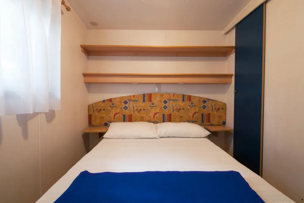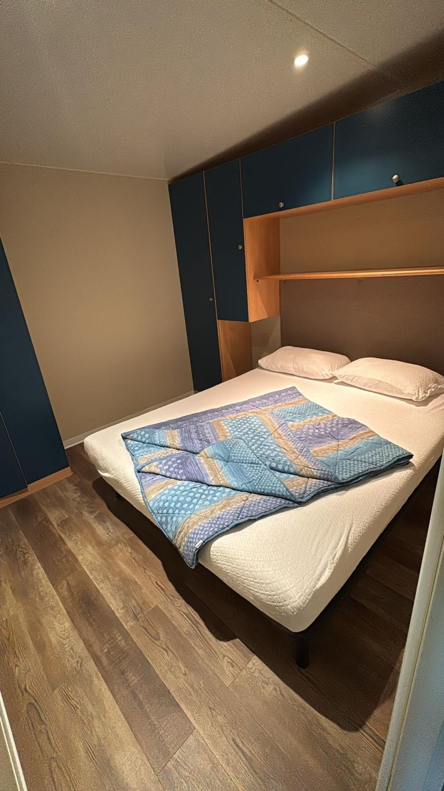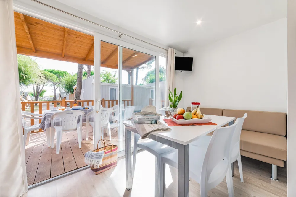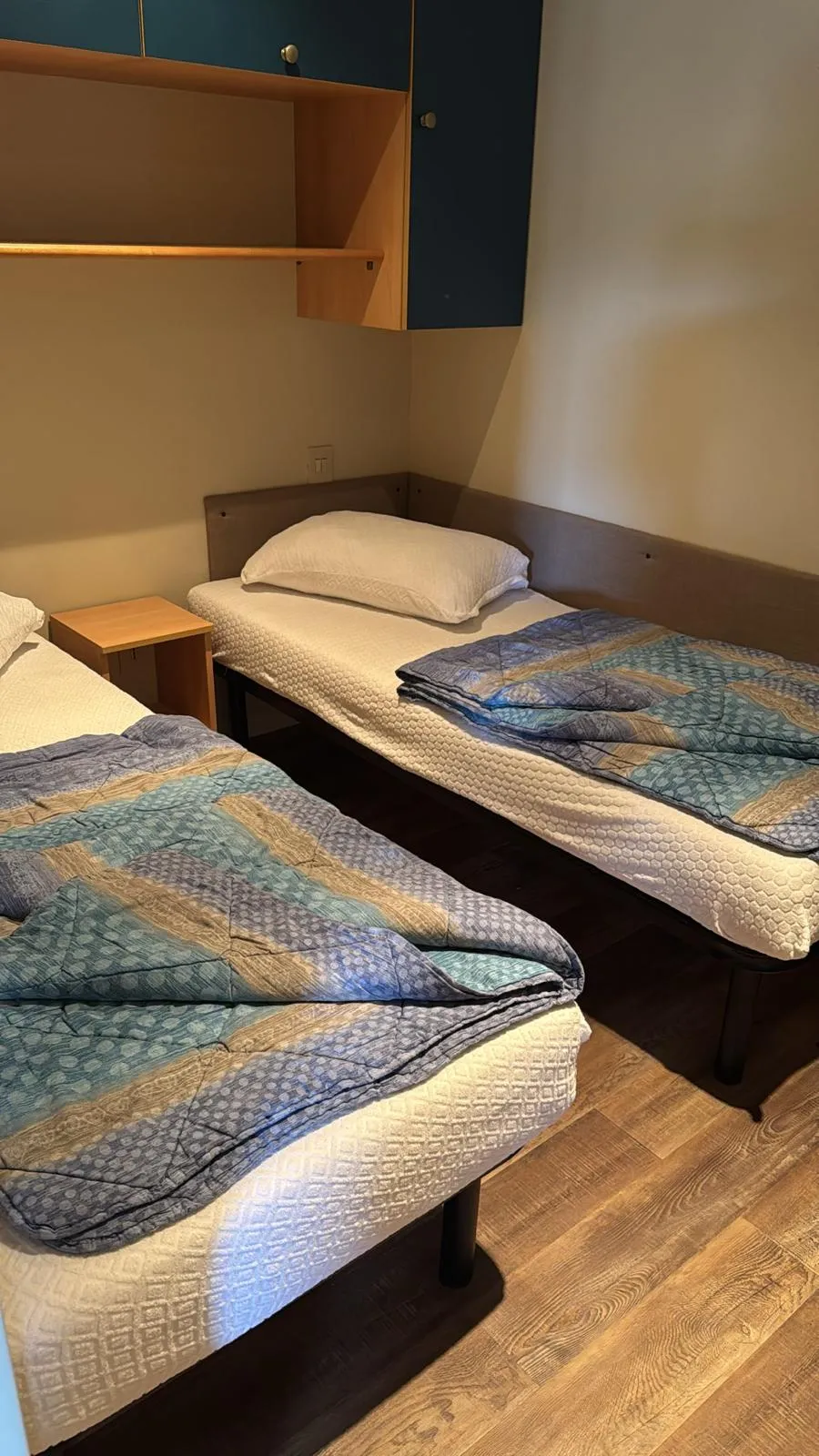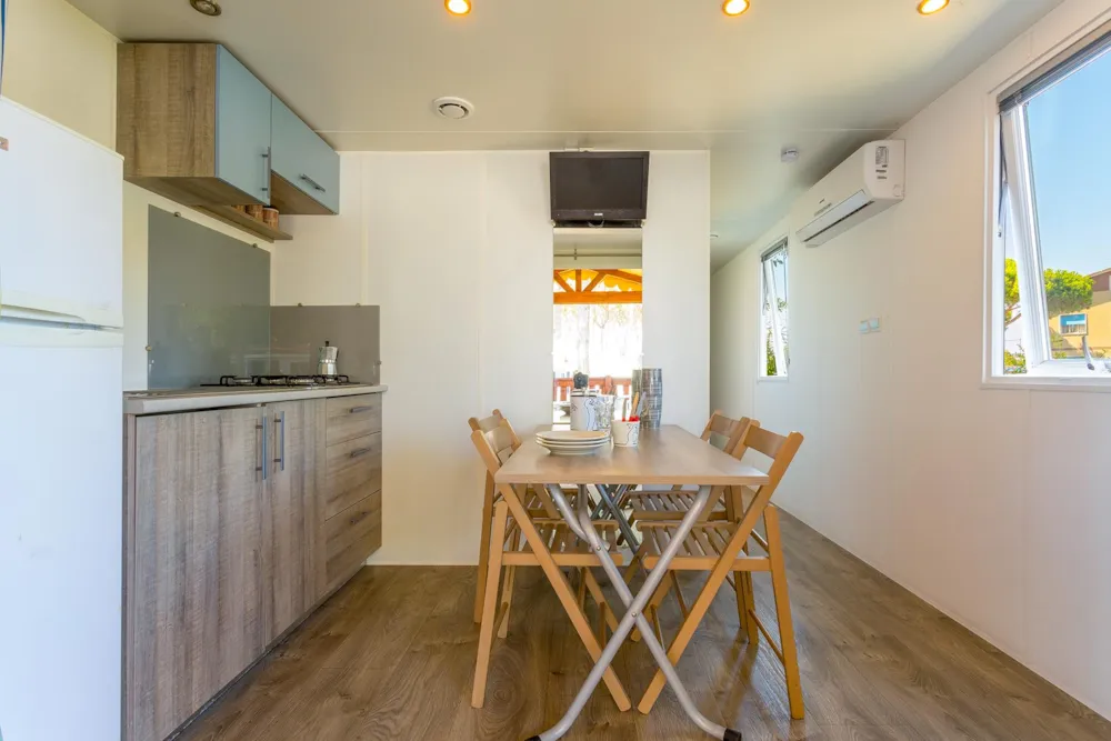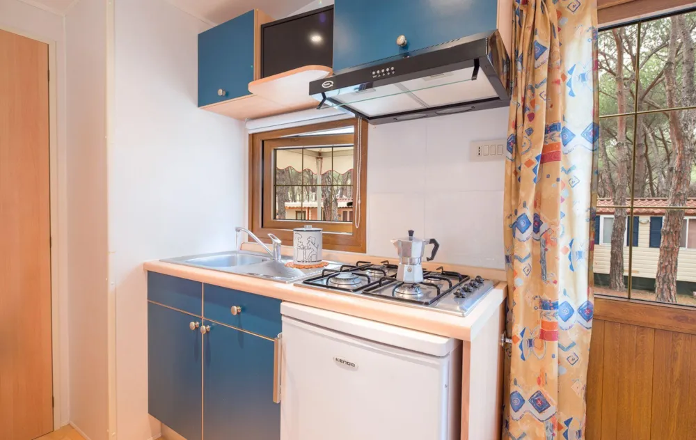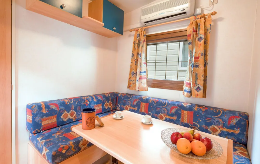 Diese Wohneinheit hat eine Fläche von ca. 31 qm und kann maximal 4 Erwachsene und 1 Kind aufnehmen. Dieses Mobilheim wurde erst kürzlich innen renoviert, Es besteht aus einem Wohnzimmer mit einem Tisch, Stühlen und einem Schlafcouch, einer Küchenzeile mit einem Kühlschrank, einem 4-Flammen-Herd, einer Spüle, Töpfen, Pfannen, sowie Geschirr, American coffee machine and microwave. Der Schlafbereich besteht aus 2 Schlafzimmern, eines mit einem Doppelbett und ein großzügiges Schlafzimmer mit 2 Einzelbetten, die auf Anfrage zusammengestellt werden können. Die Unterkunft verfügt über 1 geräumiges Badezimmer mit WC, Dusche, Bidet und Waschbecken. Im Außenbereich eine Holzveranda mit Tisch und Stühlen, wo Sie entspannte Momente genießen können!