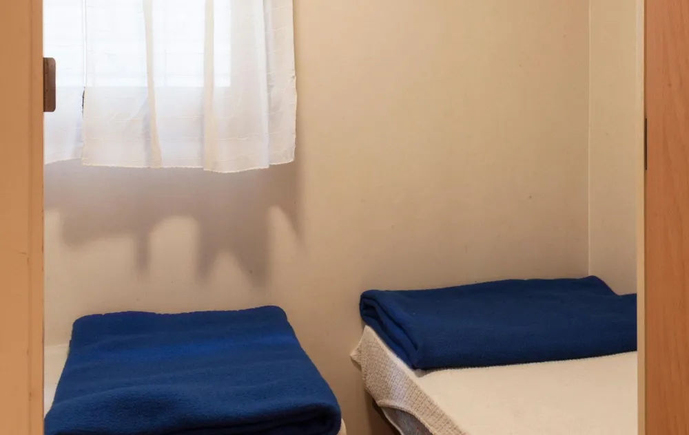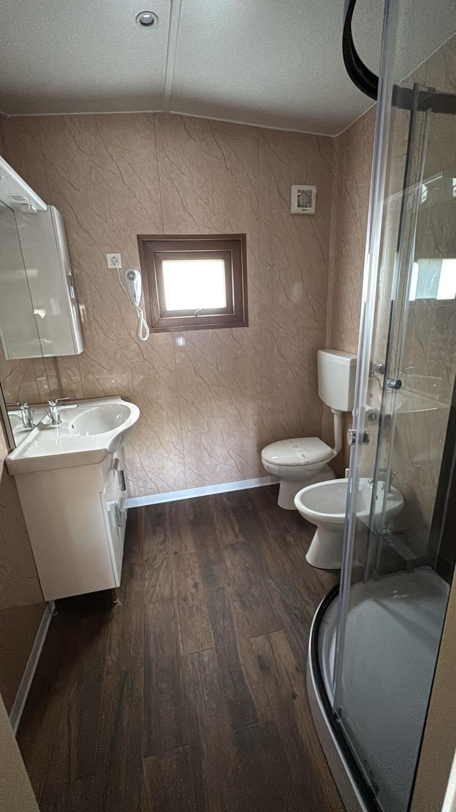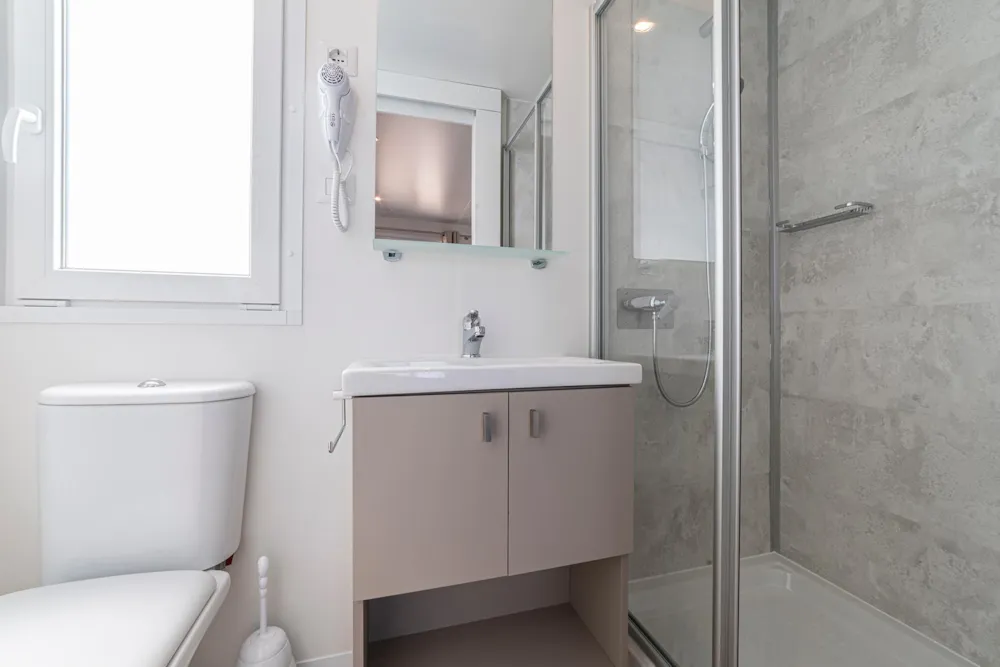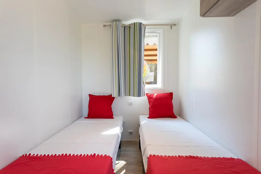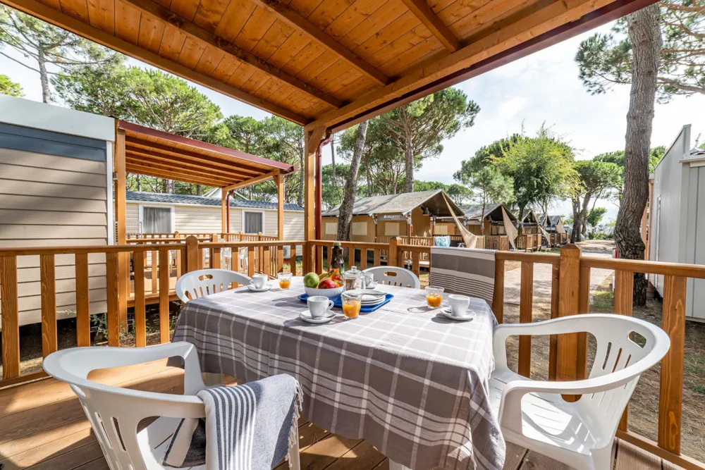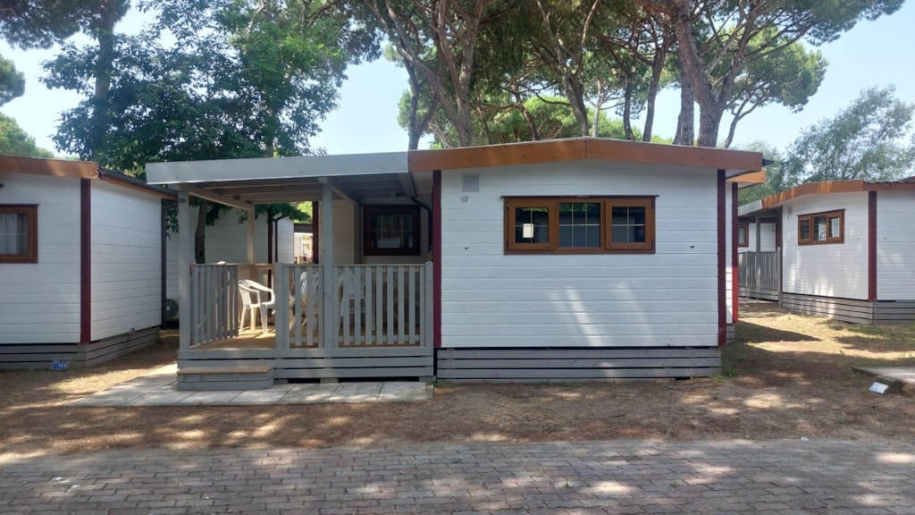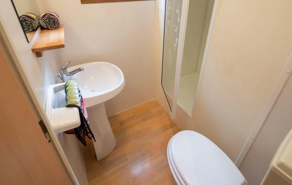 Diese Wohneinheit hat eine Fläche von ca. 31 qm und kann maximal 4 Erwachsene und 1 Kind aufnehmen. Dieses Mobilheim wurde erst kürzlich innen renoviert, Es besteht aus einem Wohnzimmer mit einem Tisch, Stühlen und einem Schlafcouch, einer Küchenzeile mit einem Kühlschrank, einem 4-Flammen-Herd, einer Spüle, Töpfen, Pfannen, sowie Geschirr, American coffee machine and microwave. Der Schlafbereich besteht aus 2 Schlafzimmern, eines mit einem Doppelbett und ein großzügiges Schlafzimmer mit 2 Einzelbetten, die auf Anfrage zusammengestellt werden können. Die Unterkunft verfügt über 1 geräumiges Badezimmer mit WC, Dusche, Bidet und Waschbecken. Im Außenbereich eine Holzveranda mit Tisch und Stühlen, wo Sie entspannte Momente genießen können!