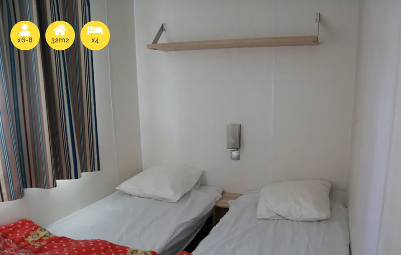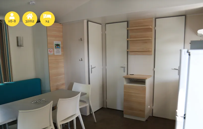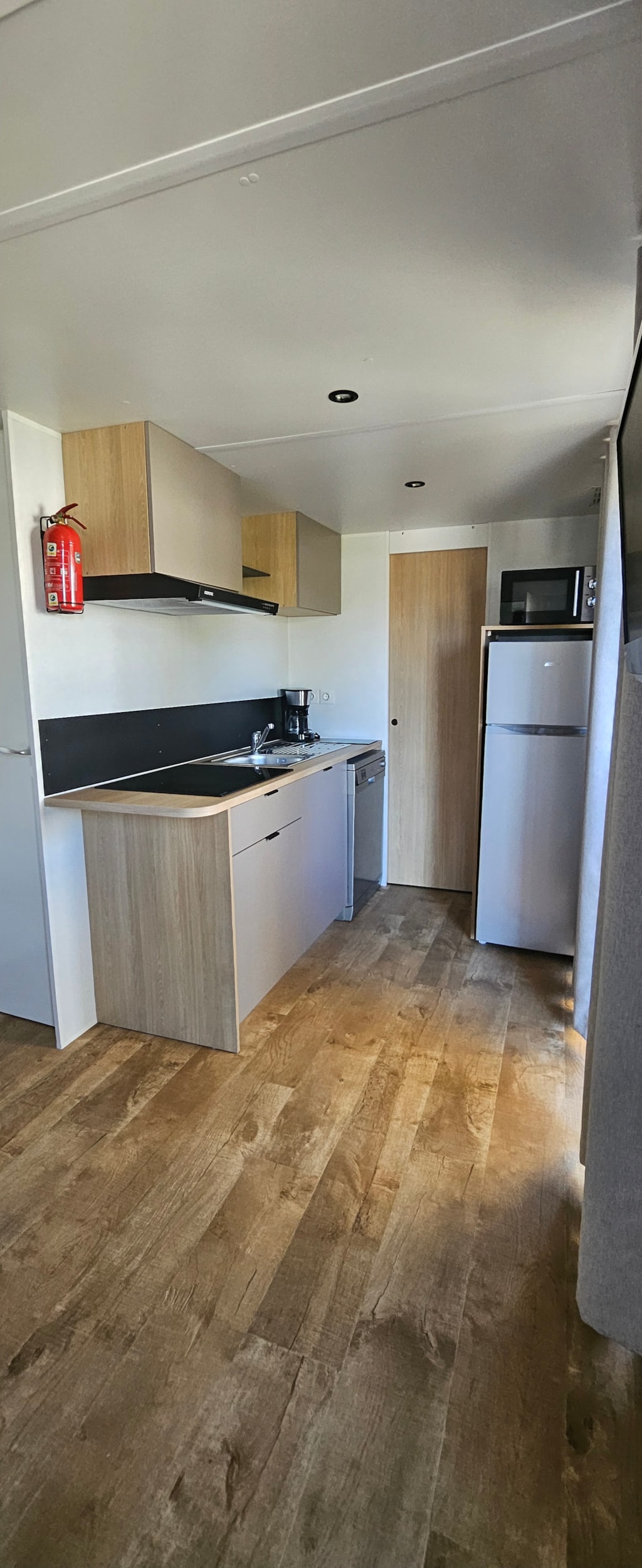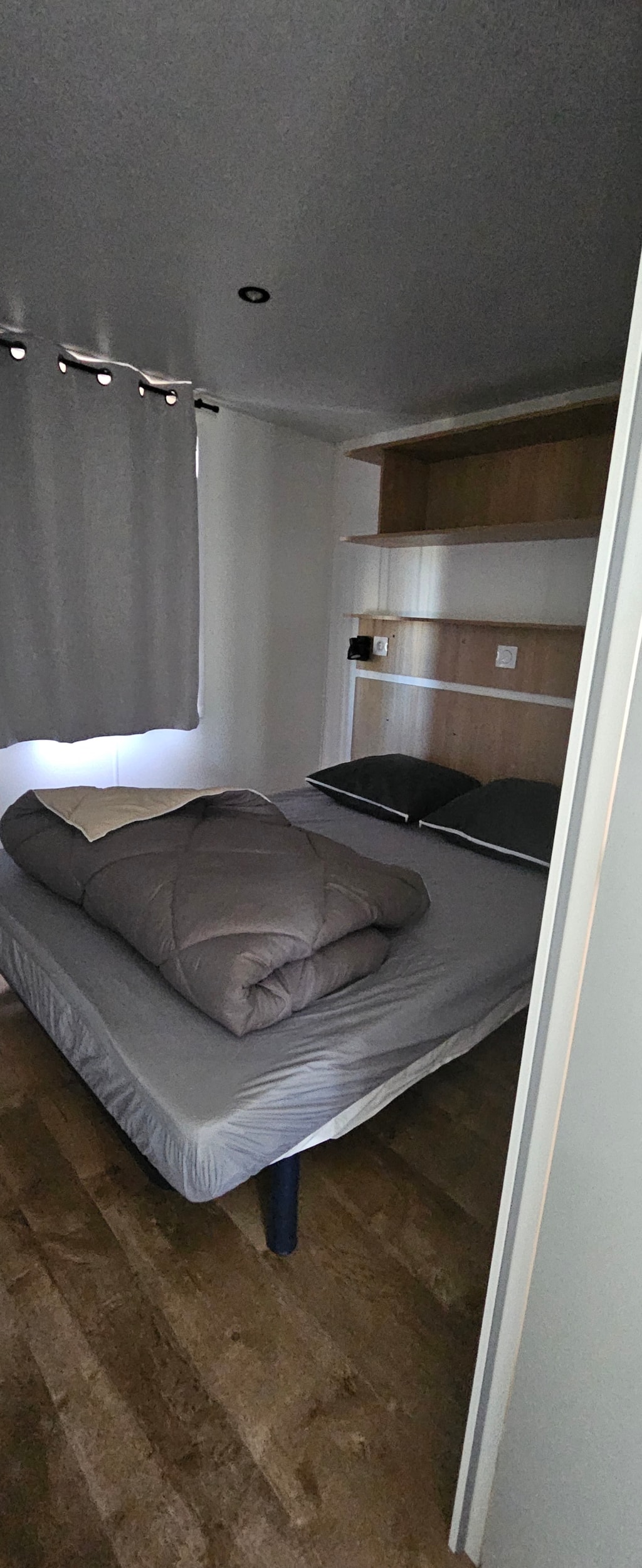 Les Cottages**** Sérénité sont des mobil-homes haut de gamme, à l'ambiance raffinée et cosy. Ce sont des mobil-homes trés récents, équipés de la climatisation murale . En version deux chambres, ils disposent d'une belle chambre parentale composée d'un lit (140x190) et d'une chambre enfant composée de deux lits (90x190). En version 3 Chambres, vous bénéficirez d'une troisième chambre composée également de 2 lits simples (90x190). Une cuisine suréquipée, un seche serviette dans la salle de bain enfin profitez d'une belle terrasse semi-couverte.
