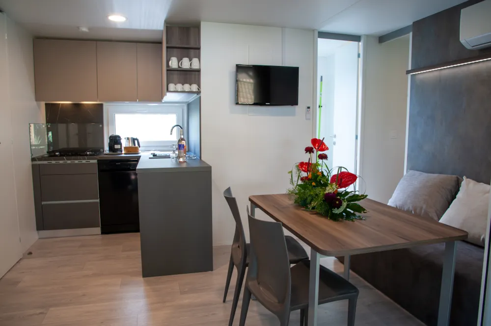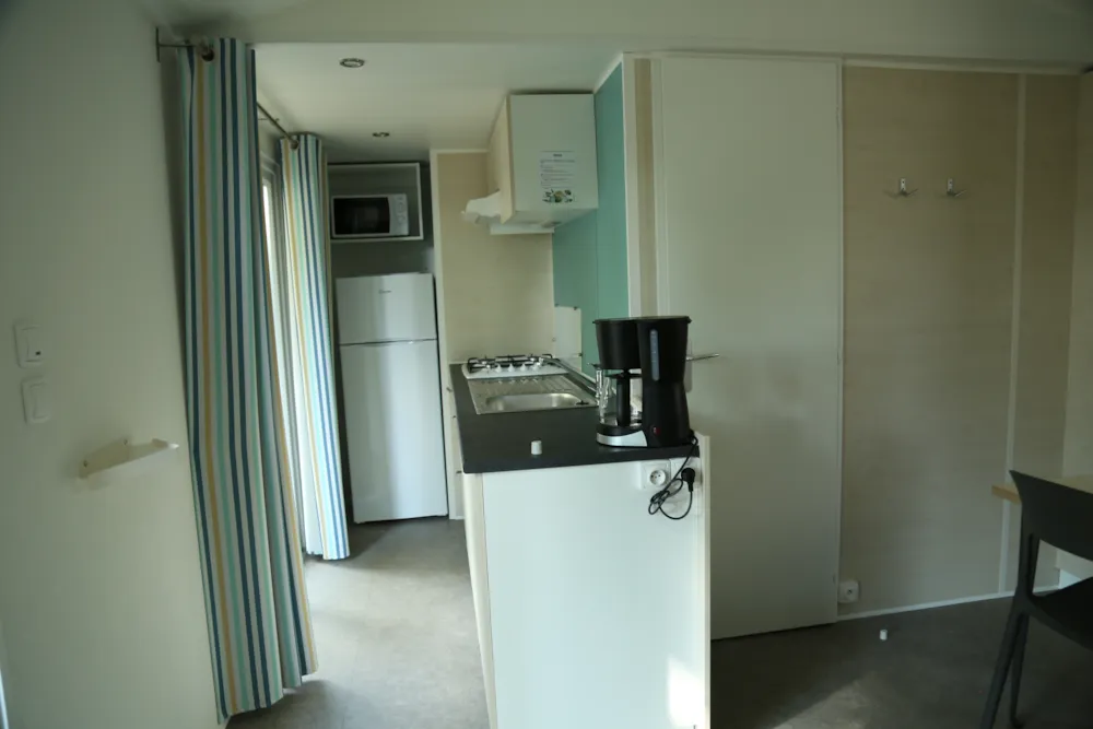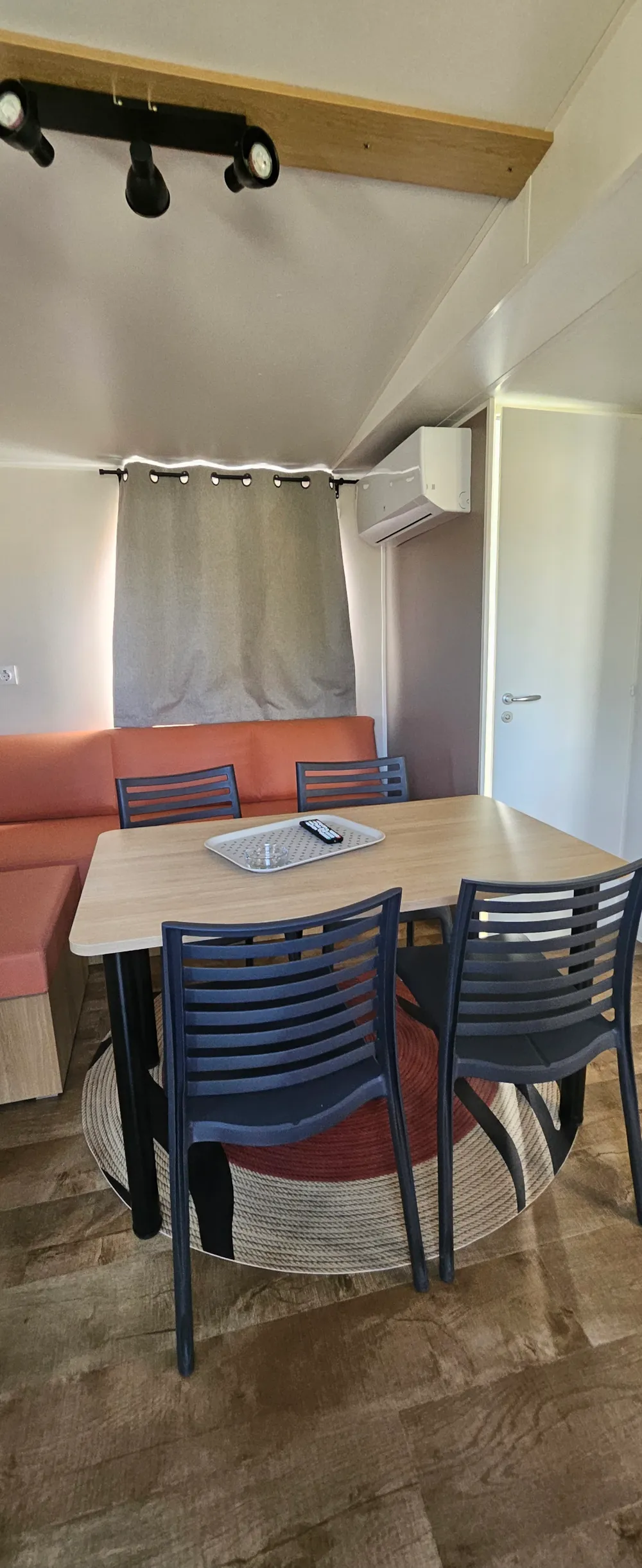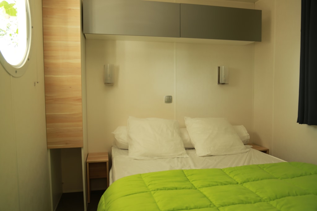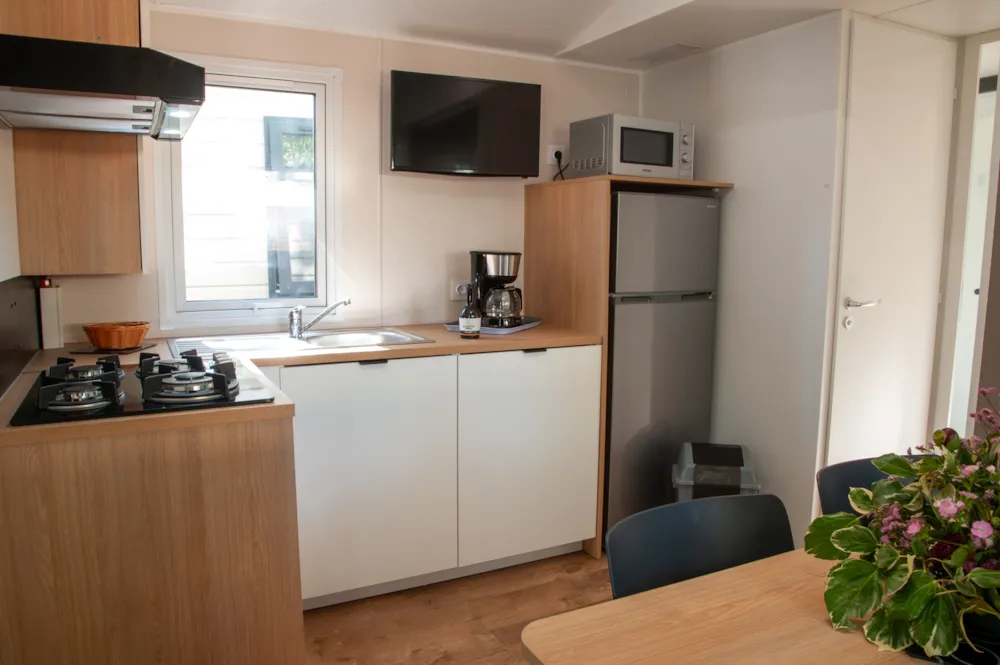 Les Cottages**** Sérénité sont des mobil-homes haut de gamme, à l'ambiance raffinée et cosy. Ce sont des mobil-homes trés récents, équipés de la climatisation murale . En version deux chambres, ils disposent d'une belle chambre parentale composée d'un lit (140x190) et d'une chambre enfant composée de deux lits (90x190). En version 3 Chambres, vous bénéficirez d'une troisième chambre composée également de 2 lits simples (90x190). Une cuisine suréquipée, un seche serviette dans la salle de bain enfin profitez d'une belle terrasse semi-couverte.