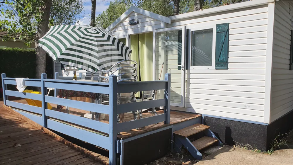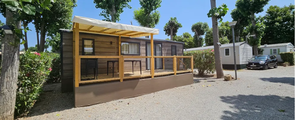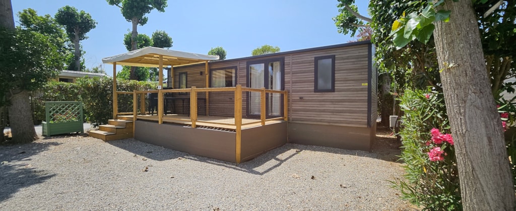 Les Cottages**** Sérénité sont des mobil-homes haut de gamme, à l'ambiance raffinée et cosy. Ce sont des mobil-homes trés récents, équipés de la climatisation murale ainsi que d'un Lave-Vaisselle. En version deux chambres, ils disposent d'une belle chambre parentale composée d'un lit (140x190) et d'une chambre enfant composée de deux lits (90x190). En version 3 Chambres, vous bénéficirez d'une troisième chambre composée également de 2 lits simples (90x190). Une cuisine suréquipée, un seche serviette dans la salle de bain enfin profitez d'une belle terrasse semi-couverte.