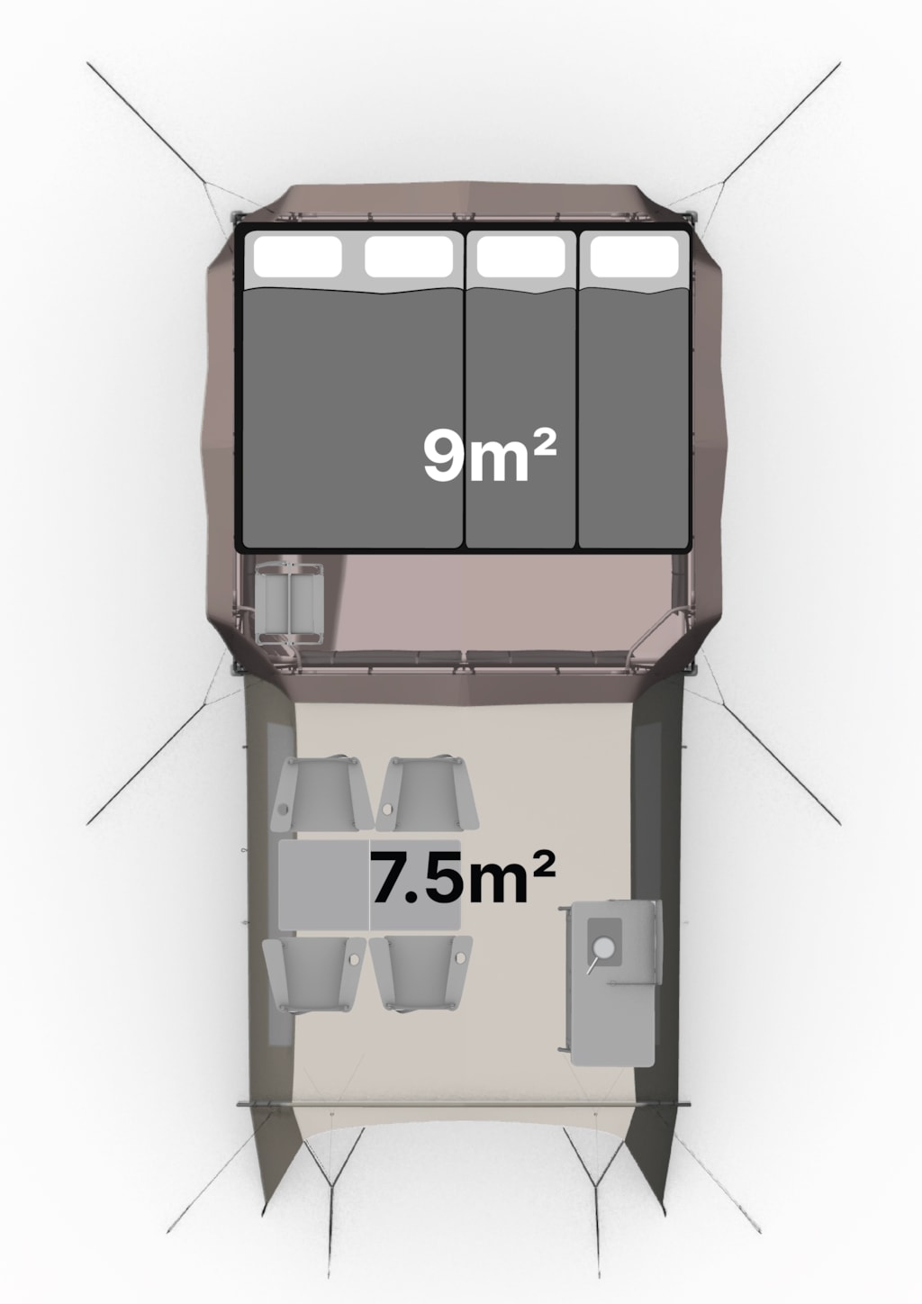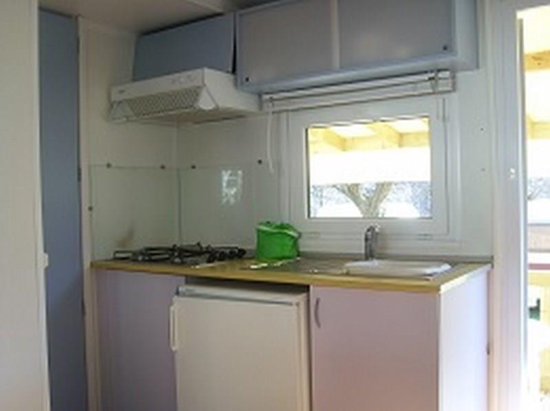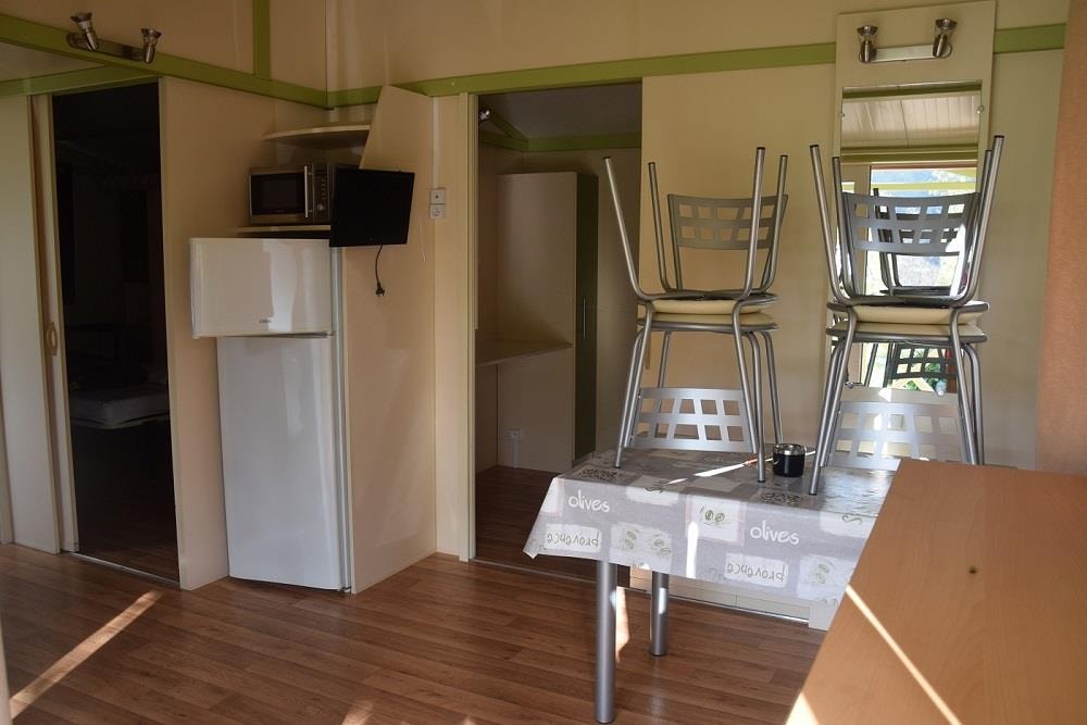 Der Wohnbereich ist mit einer Kochnische ausgestattet (Gaskocher, Geschirr, Kühlschrank/Gefrierfach, Mikrowelle, Kaffeemaschine und Wasserkocher) und bietet Stauraum.