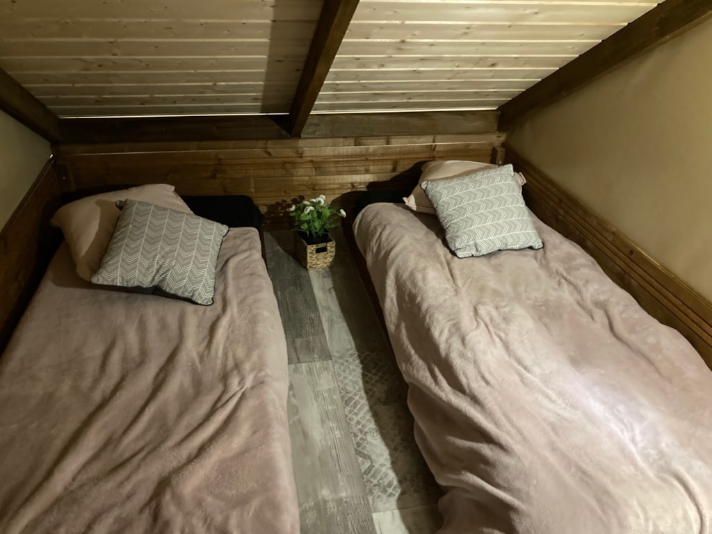 Kinderzimmer: 2 Einzelbetten (aufblasbare Matratzen und Gestelle) mit Bettdecken, Kissen und Stauraum.