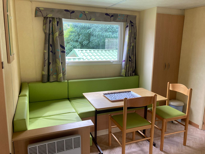 Ein Wohnbereich: ausgestattet mit einer Küche (4 Gasflammen, Geschirr, Kühlschrank, Mikrowelle, Kaffeemaschine, Wasserkocher), Stauraum, Tisch, Stühlen und einer Bank (ausziehbar für 2 Personen).