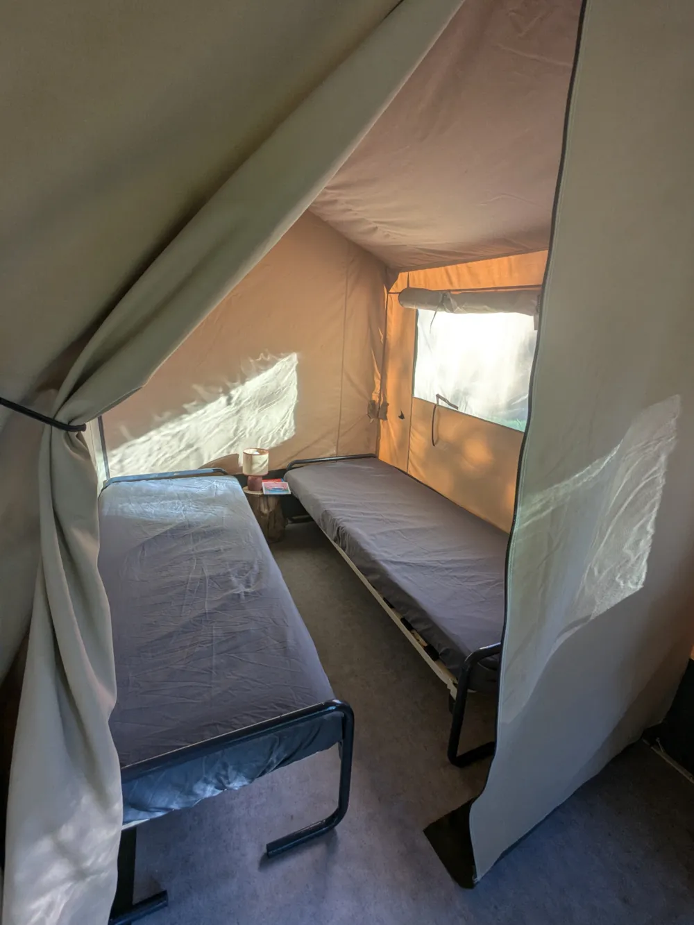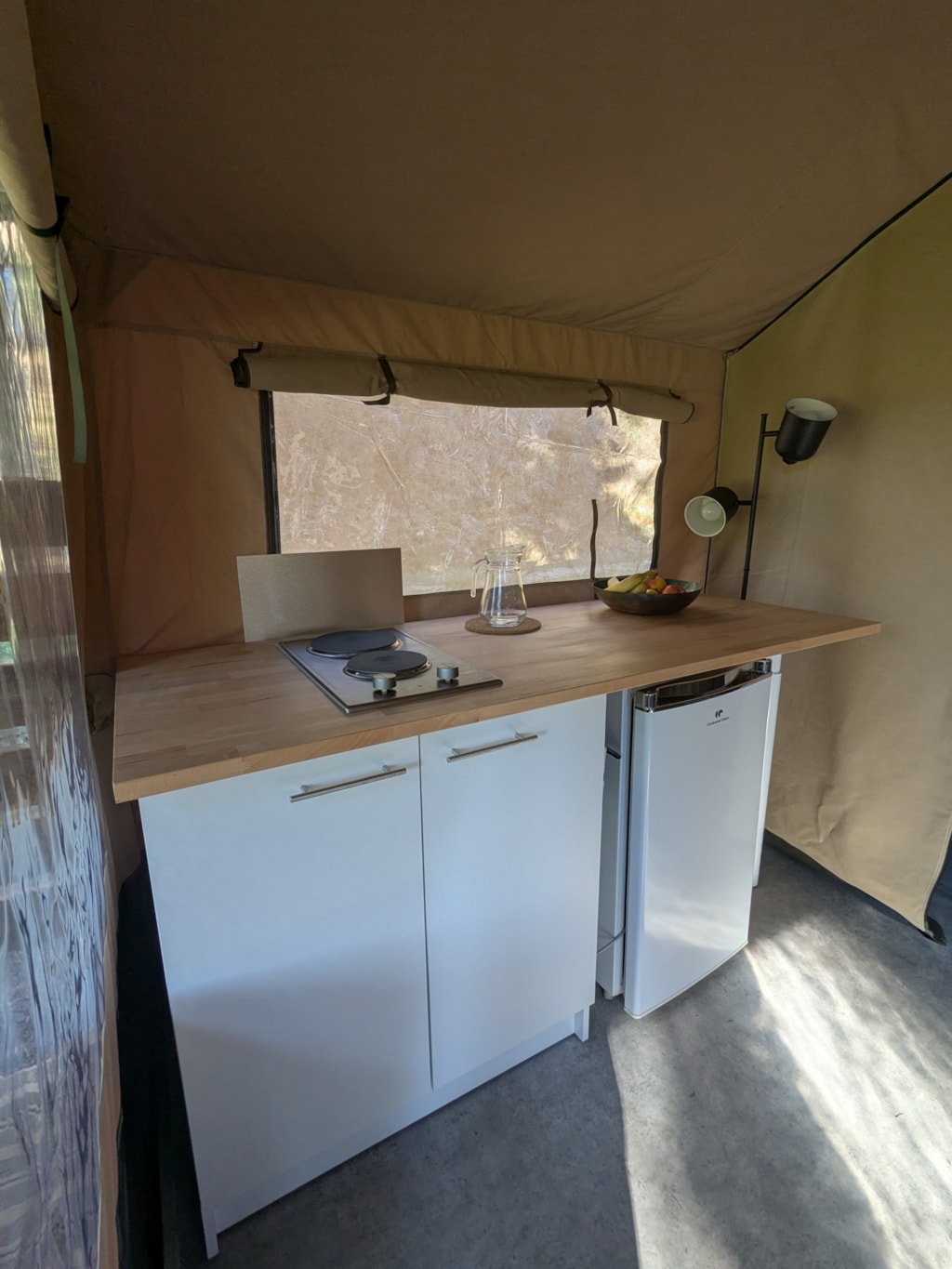 Comfortable bare pitch for tent only with a table and a shelter, package for 2 people maximum 6 people. Electricity not included.