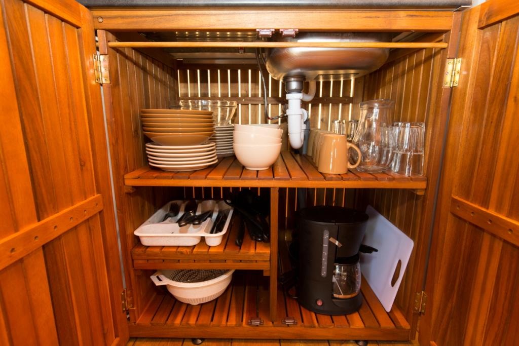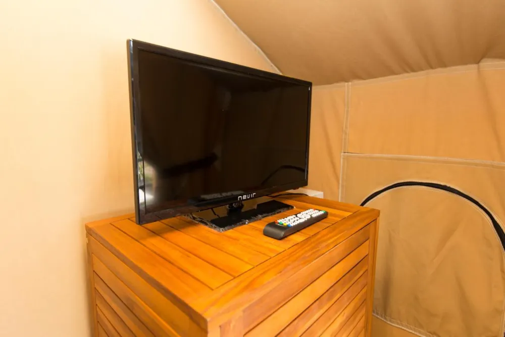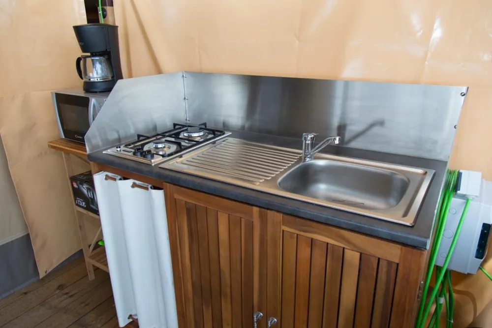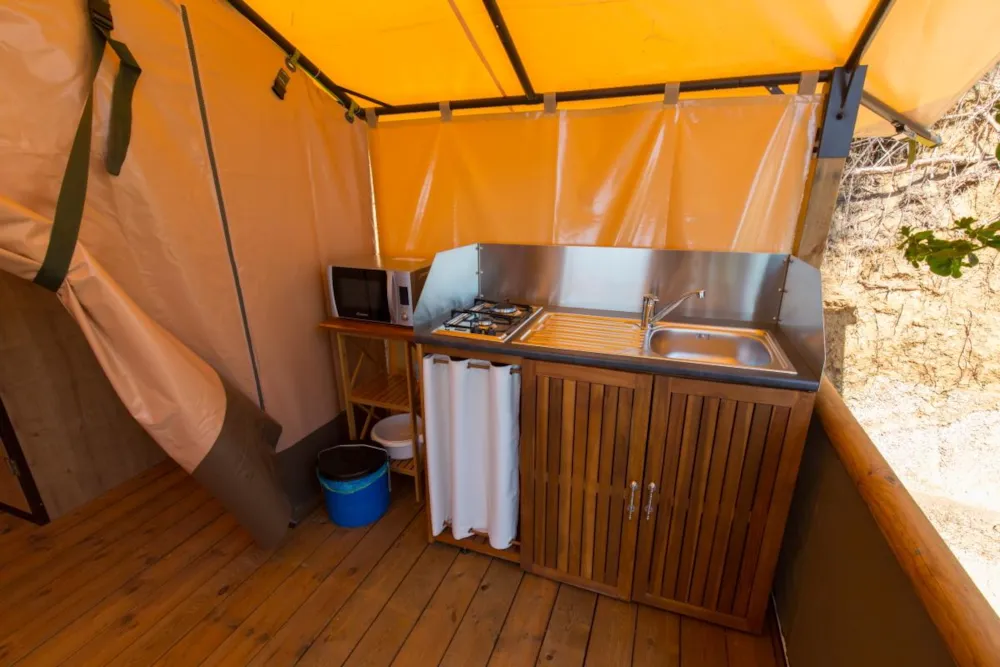 Die Zelte vom Typ Kenya (34.5 m2) sind Stoffzelte mit zwei Zimmern (2 x Doppelbett und ein Einzelbett), komplett ausgestattete Küche, Gasherd mit zwei Feldern, Mikrowelle, Kühlschrank, Kaffemaschine und Toaster, Sateliten-TV und möblierte Aussenterrasse aus Holz mit Meerblick. Bettwäsche sind im Preis enthalten (Wechsel der Bettwäsche einmal die Woche). Mindest Übernachtungen während Juli und August sind 7 Nächte. Es gibt einen Raum zum Grillen dem Kunden zur Verfügung.