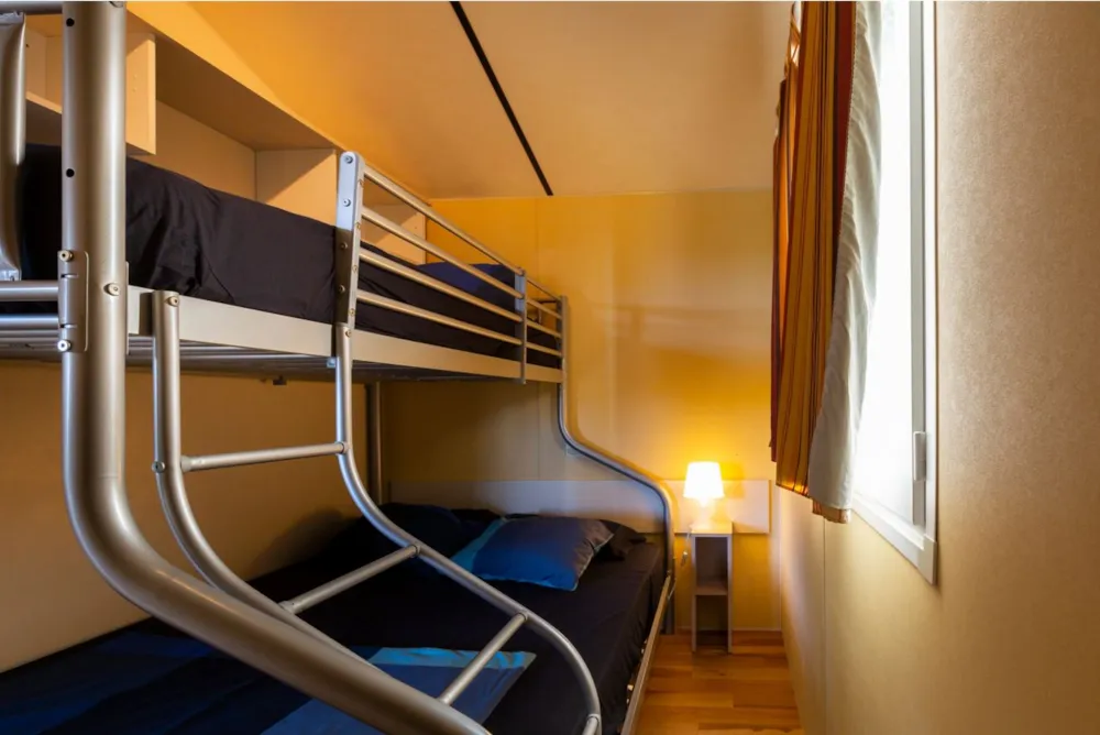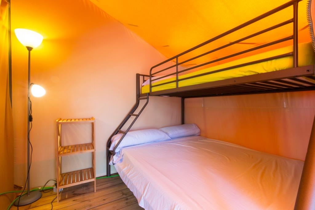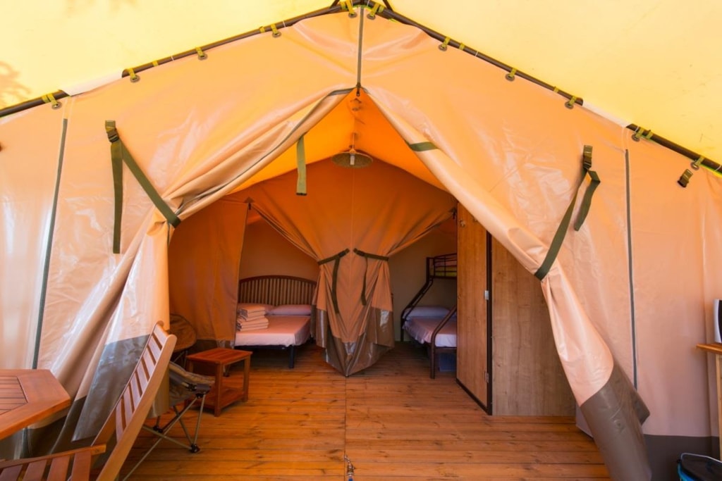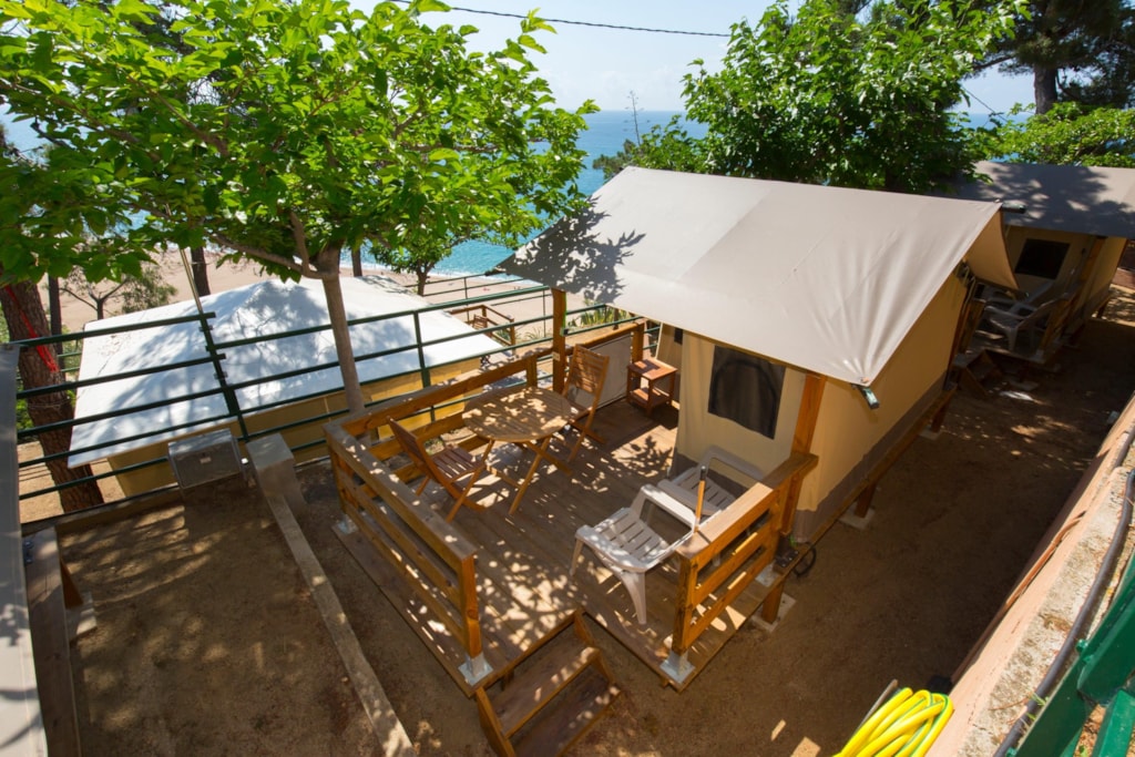 Die Zelte vom Typ Caribe (20m2) sind Stoffzelte mit zwei Zimmern (2 x Doppelbett und ein Einzelbett), komplett ausgestattete Küche, Gasherd mit zwei Feldern, Mikrowelle, Kühlschrank, Kaffemaschine und Toaster, Sateliten-TV und möblierte Aussenterrasse aus Holz mit Meerblick. Es gibt einen Raum zum Grillen dem Kunden zur Verfügung. Bettwäsche sind im Preis enthalten (Wechsel der Bettwäsche einmal die Woche). Mindest Übernachtungen während Juli und August sind 7 Nächte.