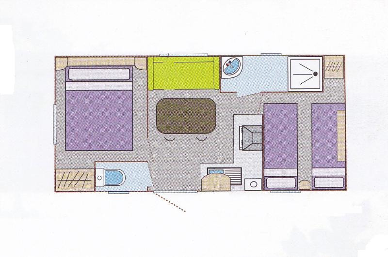 Mobile home without douche for 4 adults and 1 kind mas 12 jahr with surrounding area and car parking. - Garden with picnic table. - Equipped kitchen: crockery, cutlery, fridge and freezer, microwave oven, electric coffee maker… - Parents’ bedroom: double bed (140x 190cm), cover and pillows. - Children’s bedroom: two bunk beds (80 x 190cm), one bed (60 x 160 cm) covers and pillows. - Toilet. Linen (sheets, towels, hand towels…) are not provided. We use mattress covers and pillow covers.