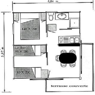 - Covered terrace with picnic or garden table. - Equipped kitchen : crockery, cutlery, fridge, freezer, microwave oven, electric coffee maker… - Bathroom: shower, sink and toilet. - Bedroom 1 with double bed (140 x 190cm), duvets and pillows. - Bedroom 2: bunk beds 80x190 + bed 80 x 190cm, duvets and pillows. Chalet for 6 people: 4 bunk beds 80 x 190cm, duvets and pillows. Linen (sheets, towels, hand towels…) are not provided. We use mattress covers and pillow covers. - Car parking.