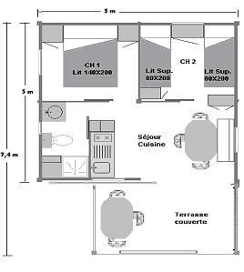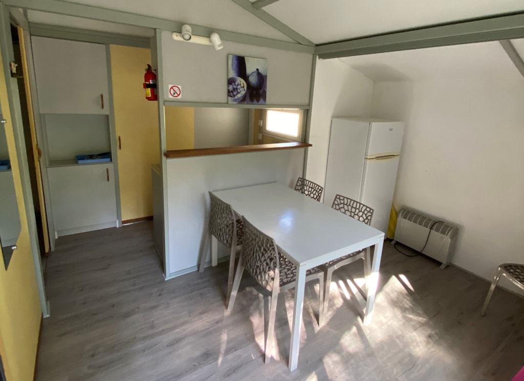 - Covered terrace with picnic table. - Equipped kitchen : crockery, cutlery, fridge, microwave oven, electric coffee maker… - Bathroom: shower, sink and toilet. - Bedroom 1 with double bed (140 x 190cm), duvets and pillows. - Bedroom 2: two twin beds 80x190cm, duvets, pillows. - Linen (sheets, towels, hand towels…) are not provided. - We use mattress covers and pillow covers for sole usage. - Car parking.