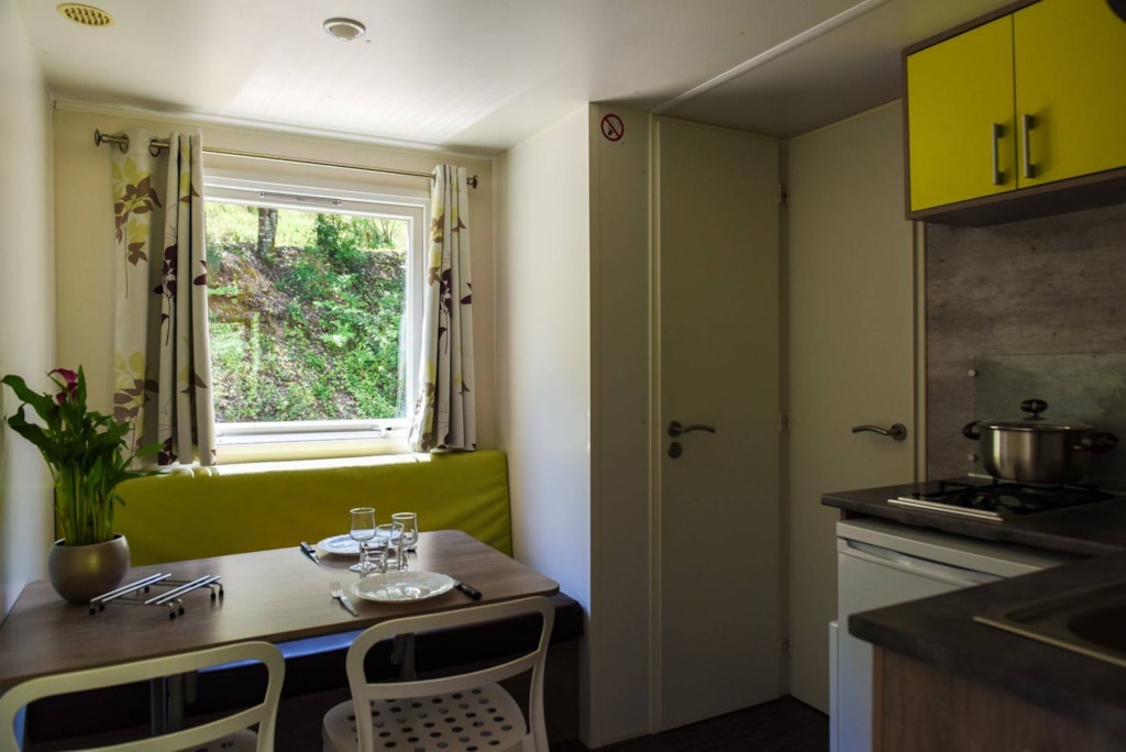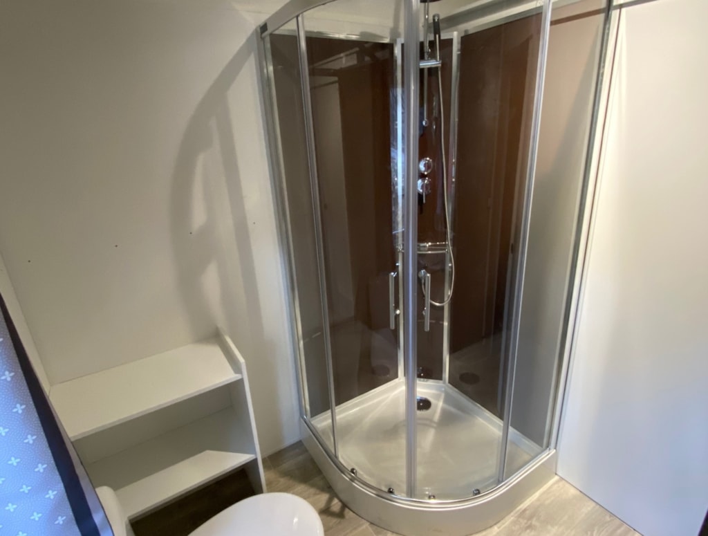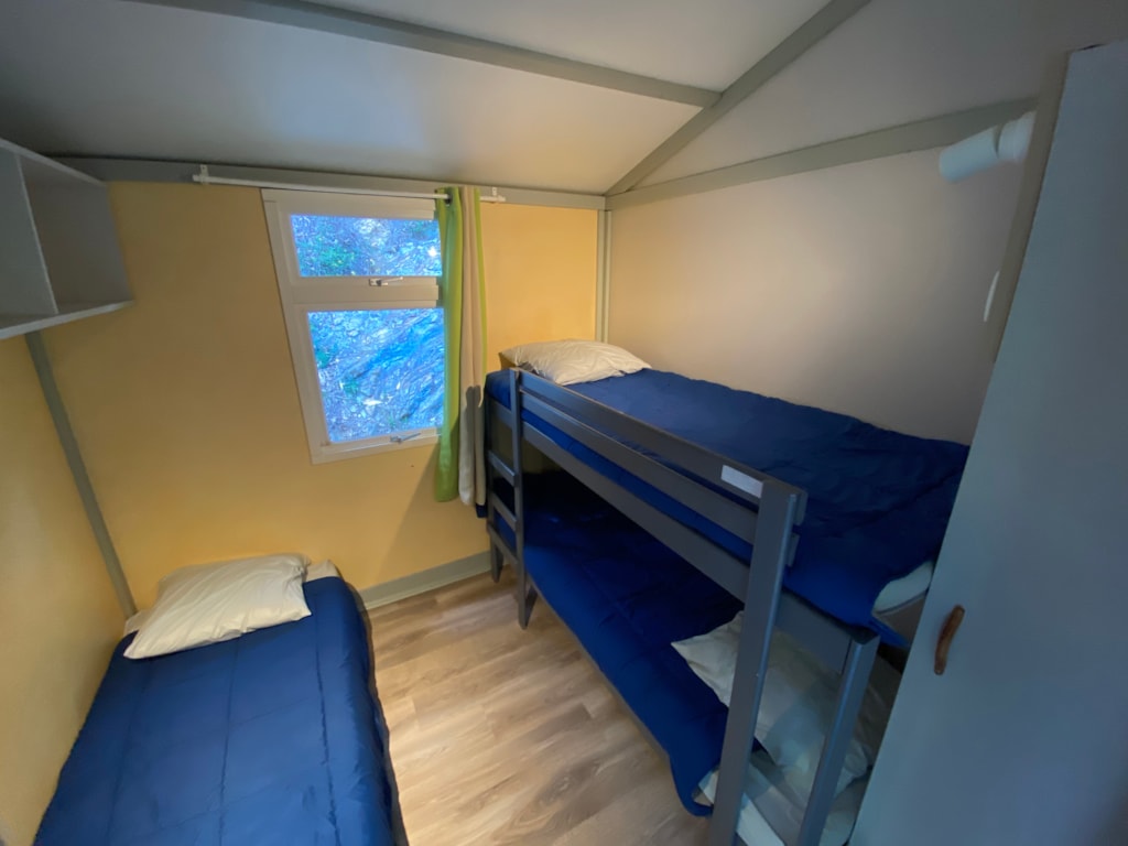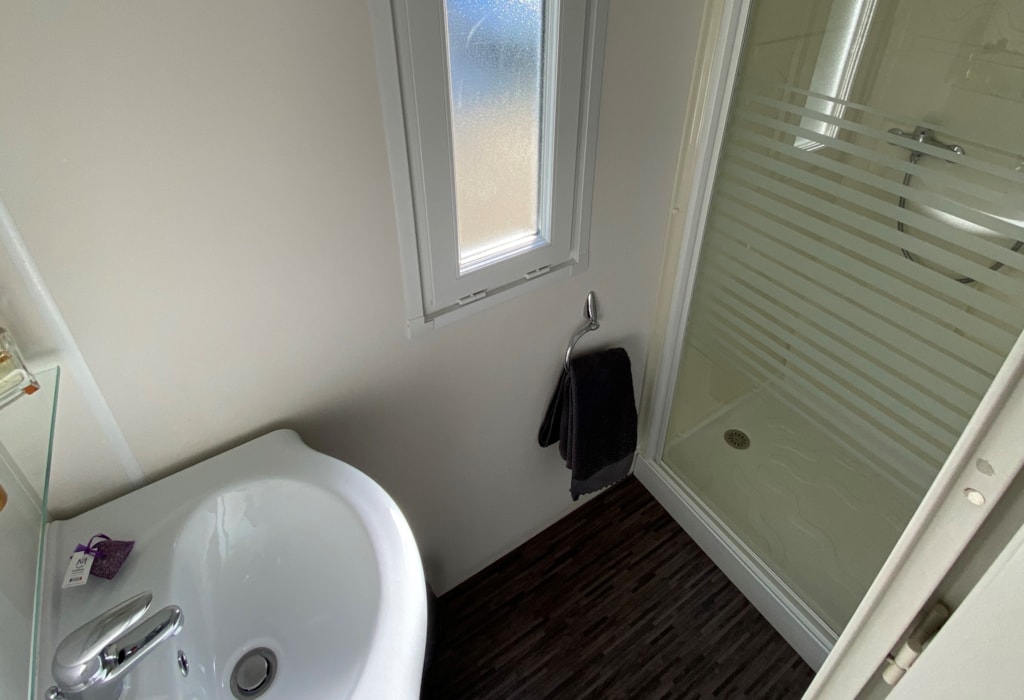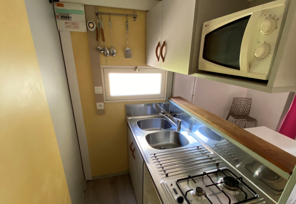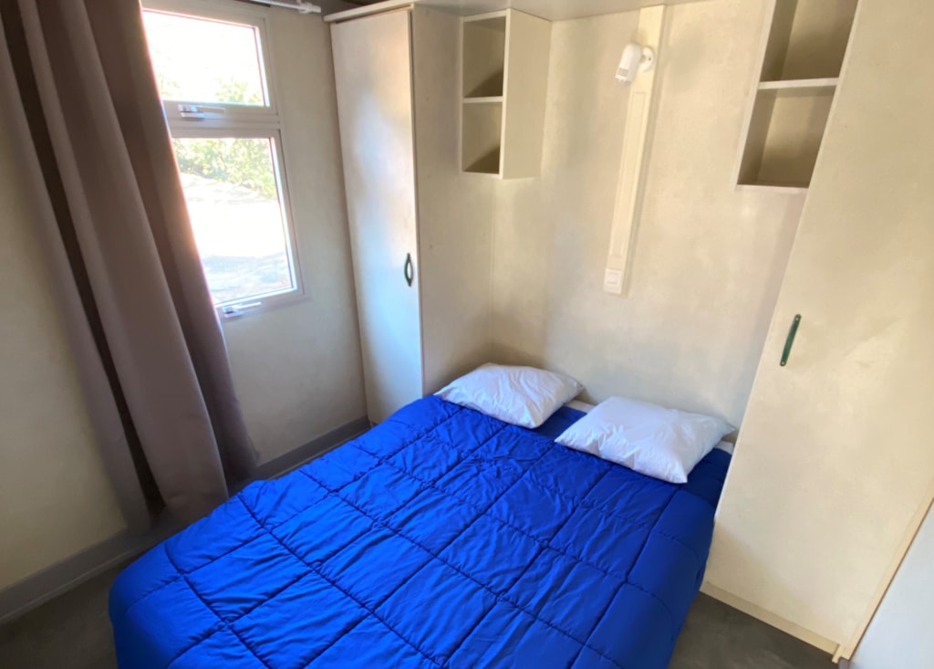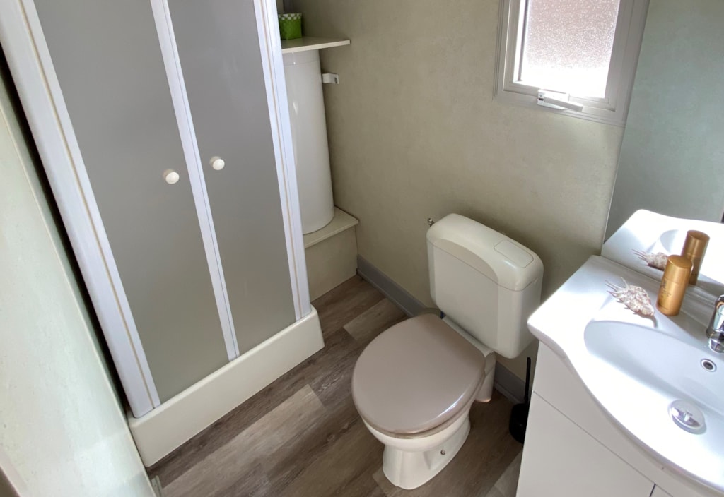Mobile home for two adults and two children (max 12 years) with surrounding area and car parking. - Large 16m2 half protected terrace with picnic table. - Equipped kitchen: crockery, cutlery, fridge, microwave oven, electric coffee maker… - Parents’ bedroom: double bed (140x 190cm), cover and pillows. - Children’s bedroom: two twin beds (70 x 170cm), covers and pillows. - Bathroom: shower and sink. - Separate toilet. Linen (sheets, towels, hand towels…) are not provided. We use mattress covers and pillow covers.