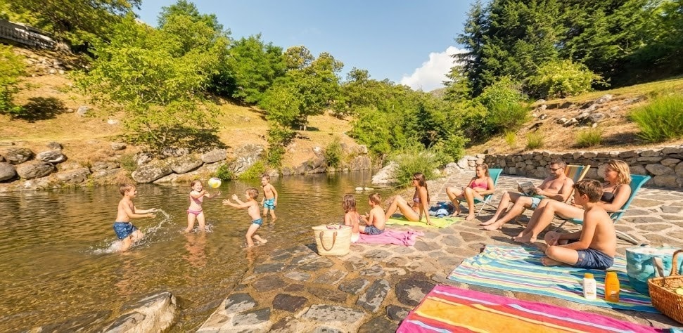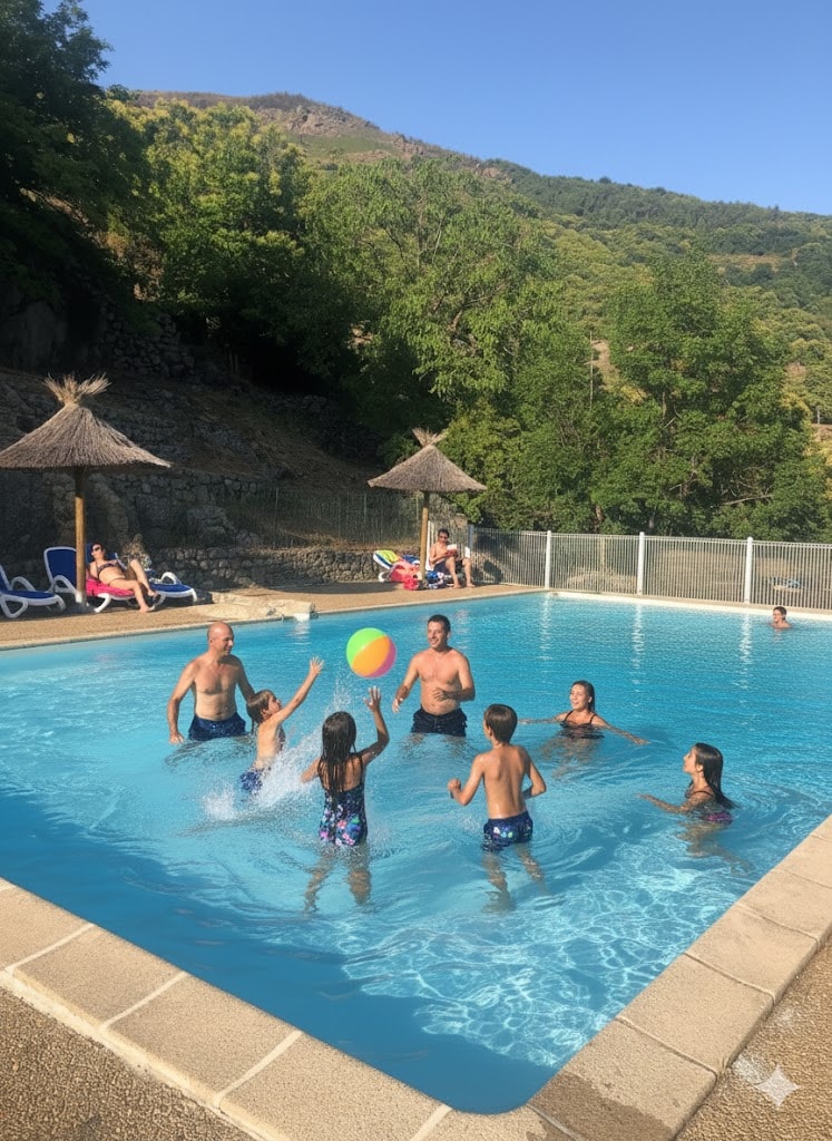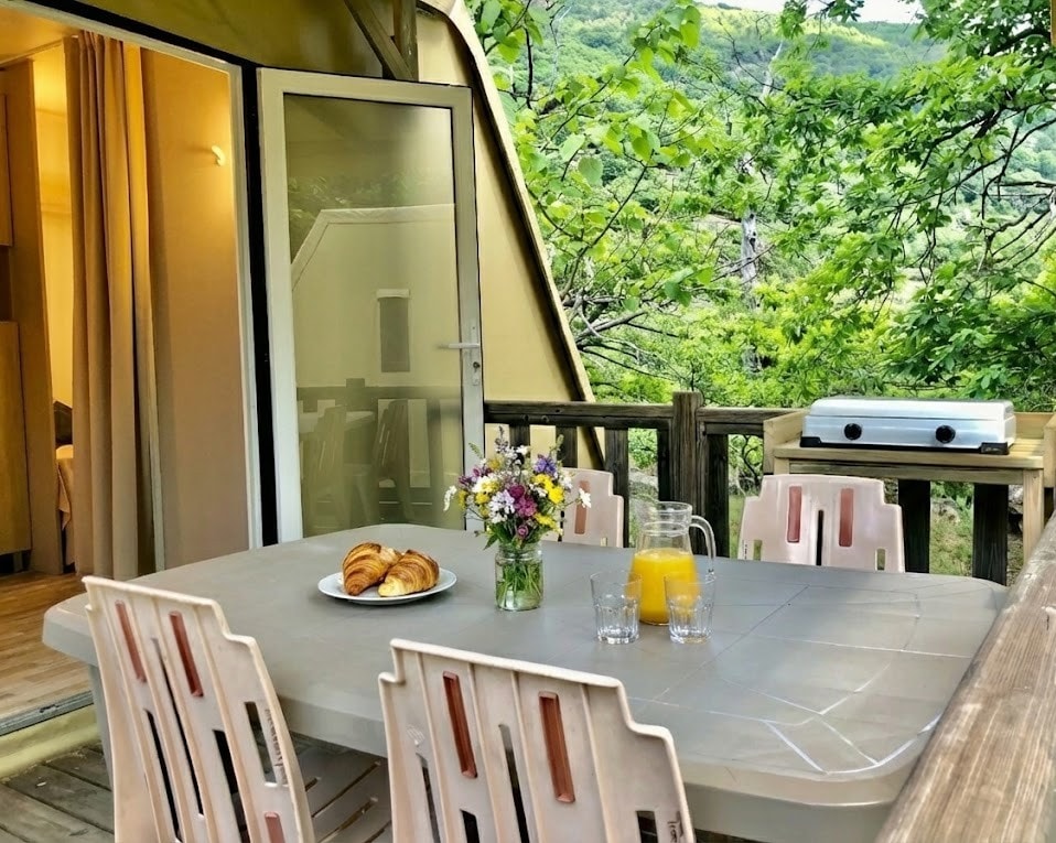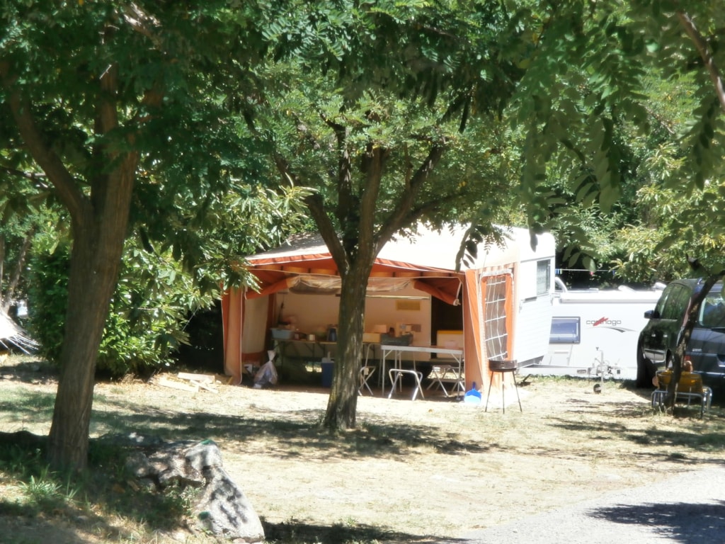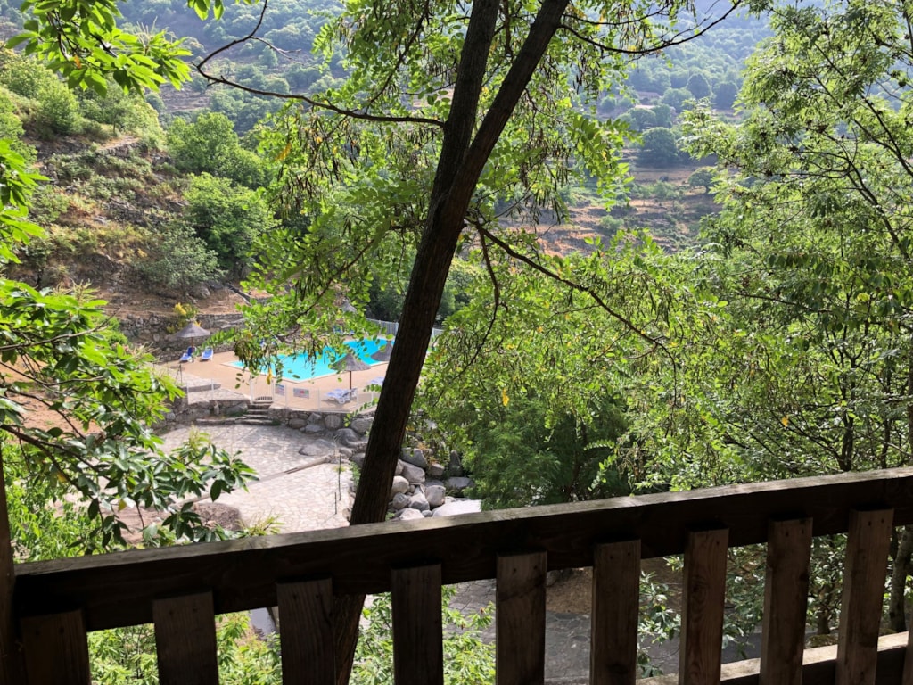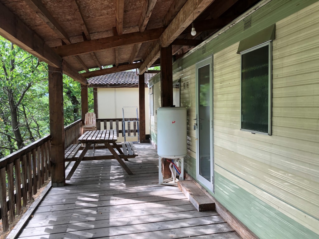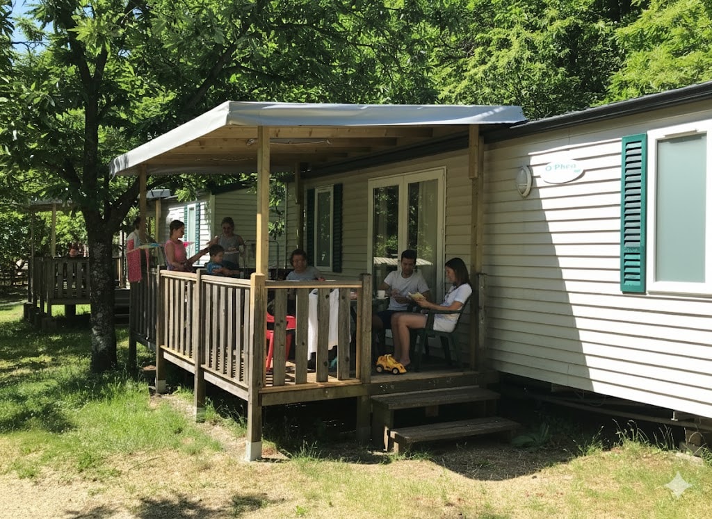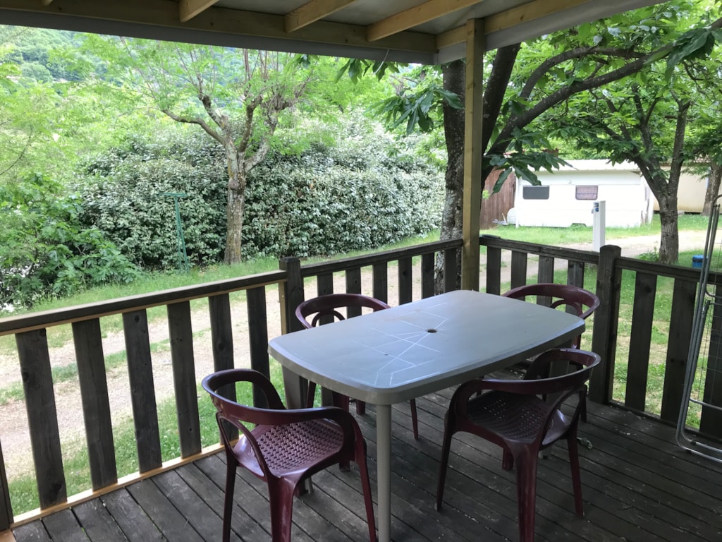 mobil home pour 4 personnes avec terrasse couverte ( 24 m² + terrasse 15m²), trés belle vue sur la rivière, la montagne et la piscine. location ancienne mais confortable et bien équipée: 2 chambres, coin cuisine avec plaque de cuisson au gaz 4 feux, frigo, micro ondes, cafetière, vaisselle. Salle d'eau avec douche, wc et lavabo.