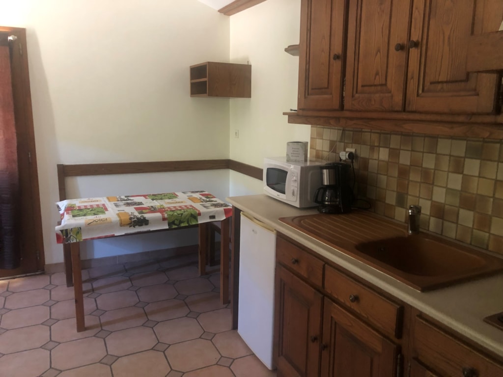 gîte 4/6 places, 2 chambres, salle de bain, wc séparés, coin cuisine (plaque de cuisson, micro ondes, cafetière, frigo). Banquette convertible pour 2 personnes dans le salon