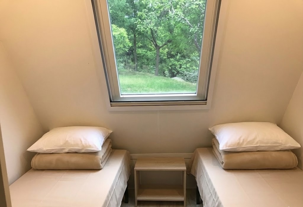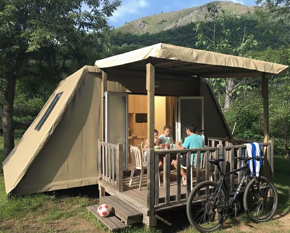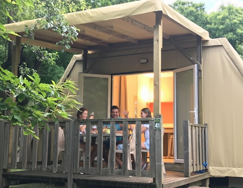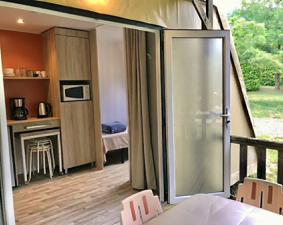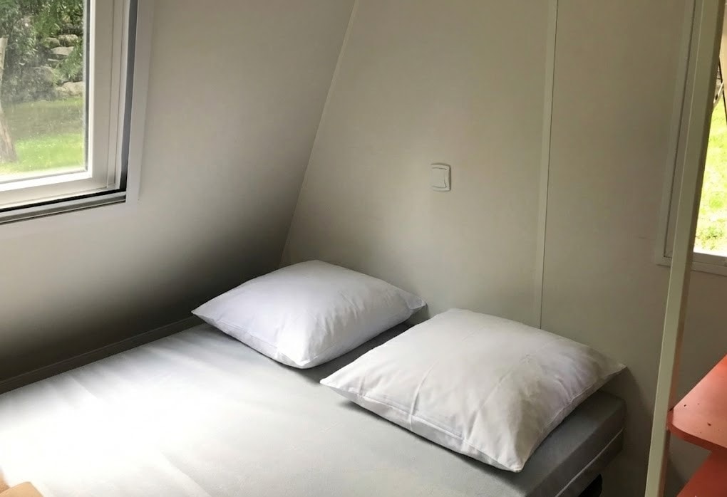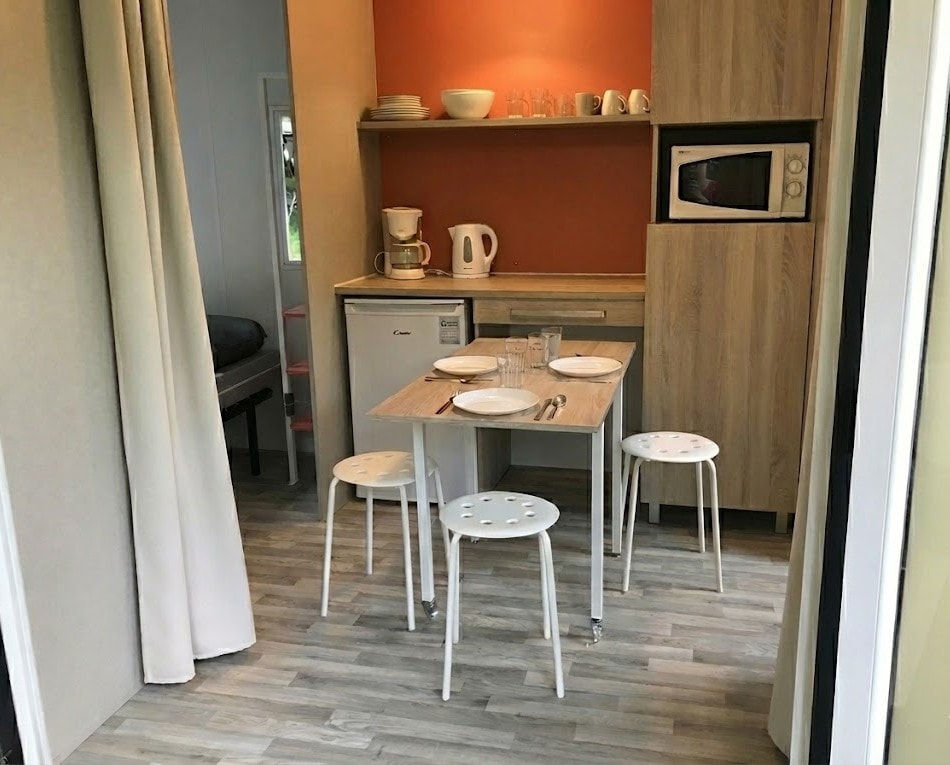 Ça ressemble à une jolie tente mais c’est aussi rigide comme un mobil-home ! (La toile qui entoure la Coco Sweet n’est que décorative !) Une nouvelle façon de vivre ses séjours au camping, conçu pour loger jusqu’à 4 personnes … dans le plus grand confort ! Grand comme un mobil-home avec ses 2 Chambres et son coin séjour – salle à manger ! Et ce n’est pas tout ! Pour profiter de + d’espace, on a installé une terrasse ! Pour un séjour ludique et douillet ! À l ‘intérieur, on peut vivre et y dormir ! À l’intérieur il y a tout ça : frigo, micro-ondes, cafetière, vaisselle, table de cuisson sous la terrasse couverte. De l’espace pour être à l’aise : 16m2 d’espace à vivre à l'intérieur + 7.5 m² de terrasse. 4 Couchages pour nous rendre visite en famille ou avec des amis ! 1 lit double 140*190cm + 2 lits simples 80*190cm (qu’on peut rapprocher si besoin !) Encore + d’équipements : frigo, table, tabourets, rangements, rideaux occultants ! Une (très très) bonne isolation laine de verre pour les nuits + fraîches