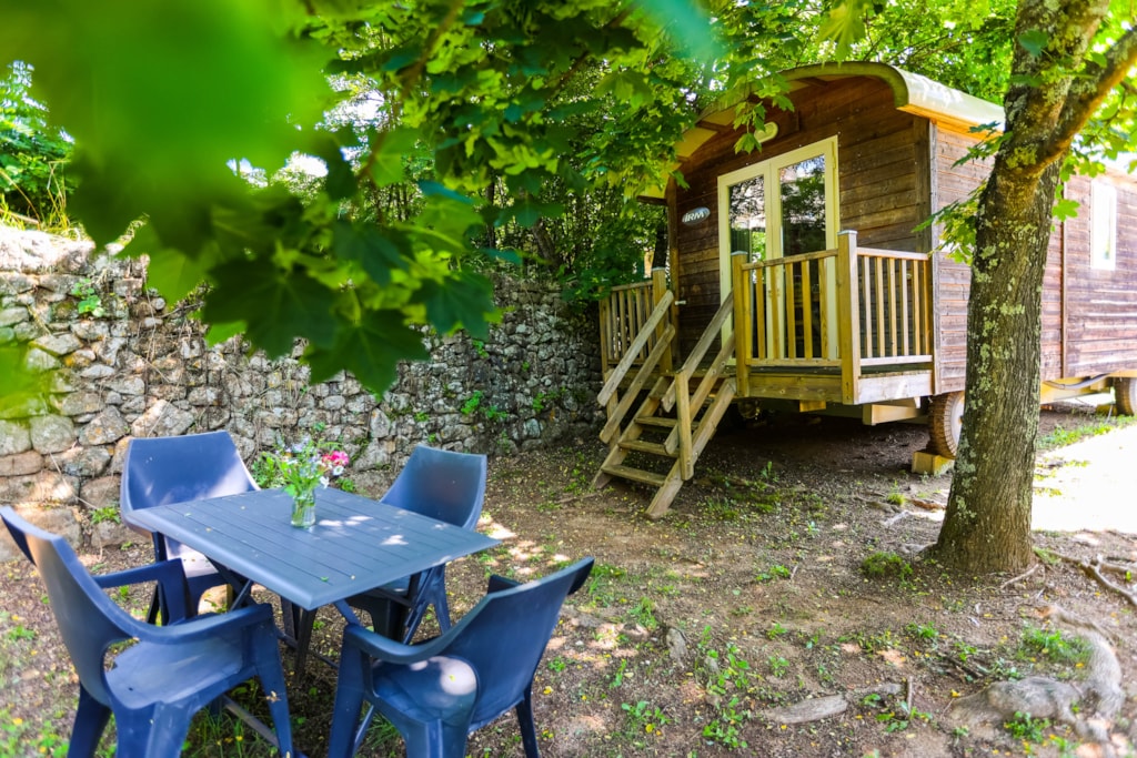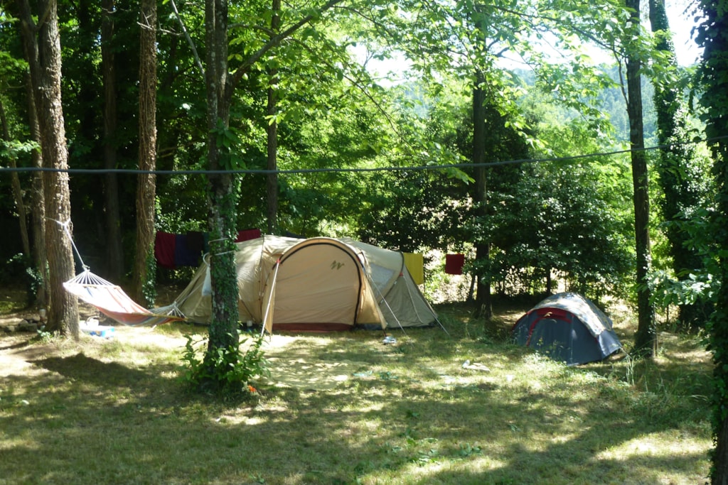 80 m² großer Stellplatz auf einer schattigen Terrasse unter Kastanienbäumen. Strom- und Wasseranschluss in der