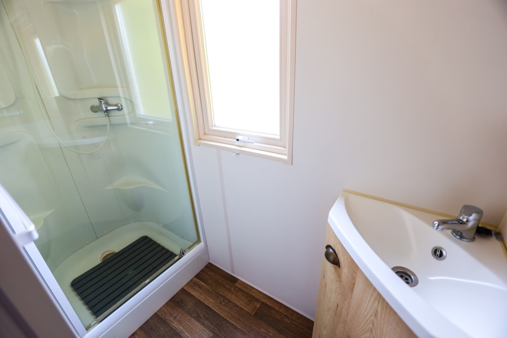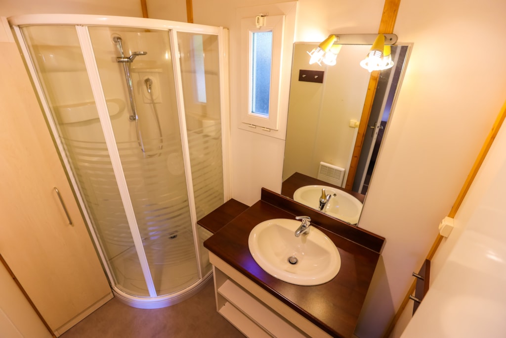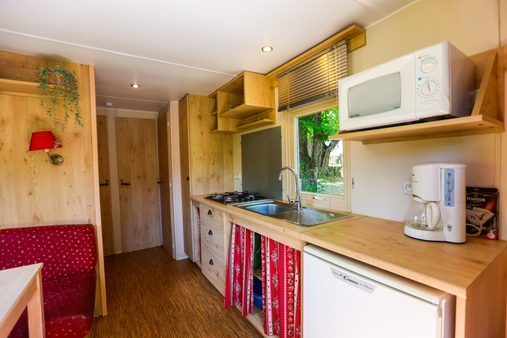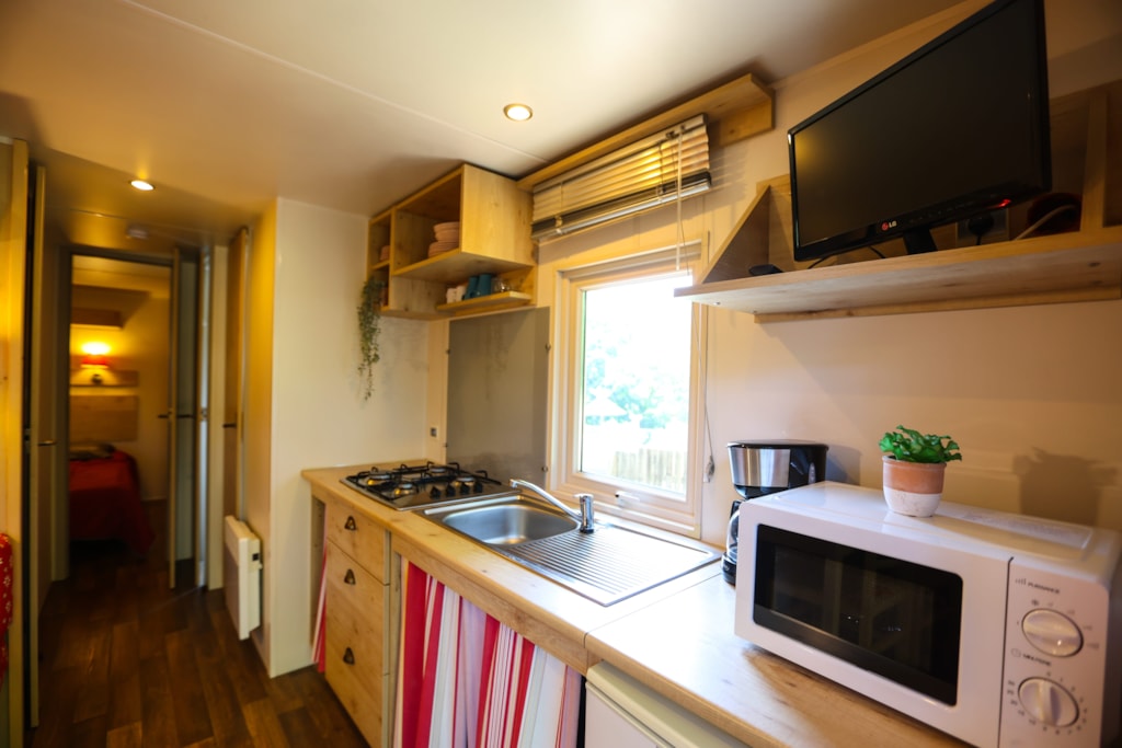 Der Wohnwagen hat eine gut ausgestattete Küche. Die Duschkabine und Toilette ist in 2 Räume geteilt. Neben dem Hauptschlafzimmer gibt es noch ein kleines Schlafzimmer mit Doppelbett für Kinder. Draußen von dem Wohnwagen stehen Tisch, Stühle, und Liegenstühle zur Verfügung. Alles war sehr sauber.
